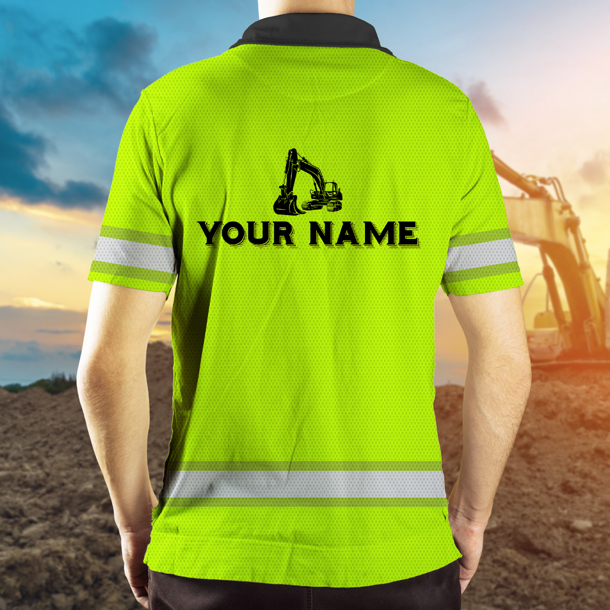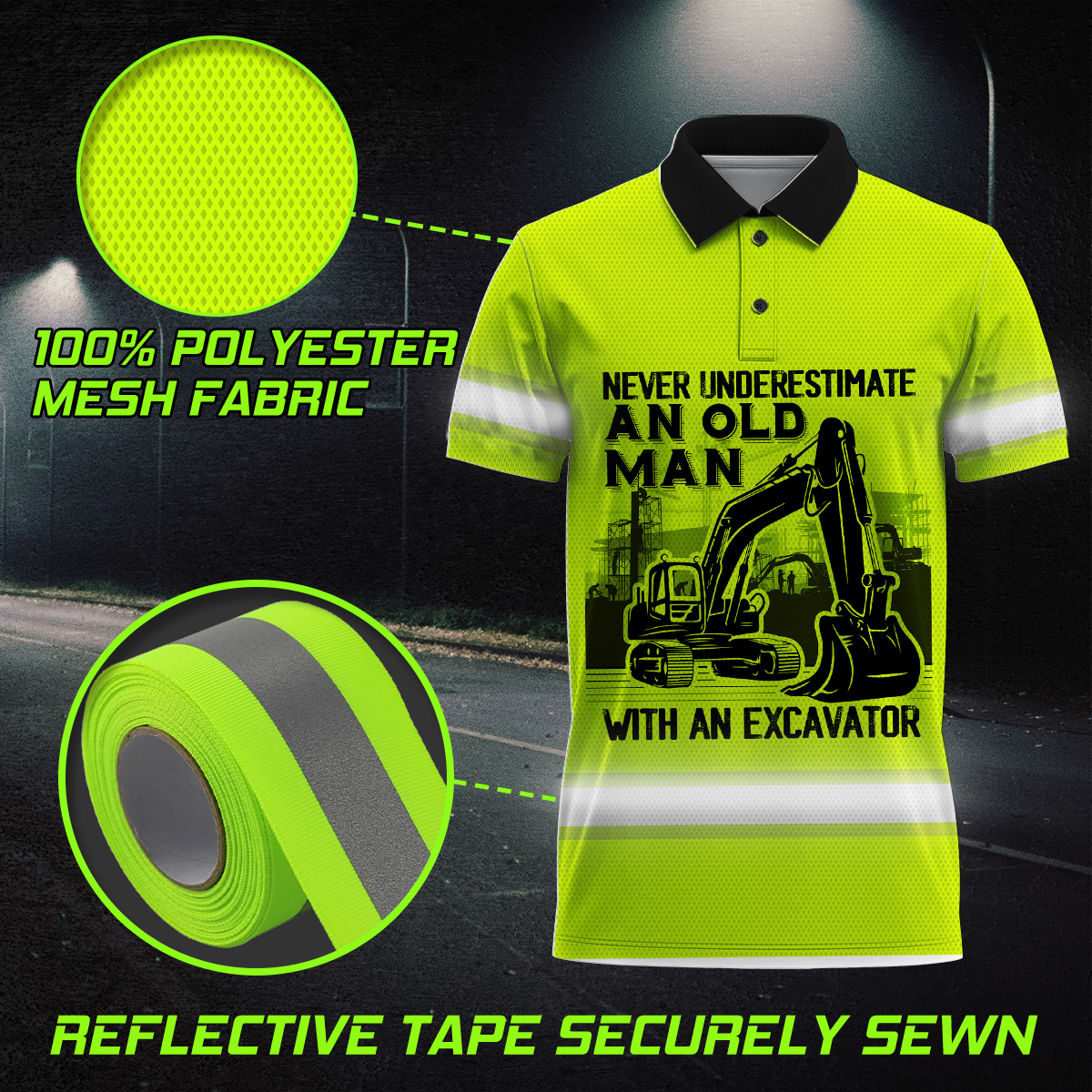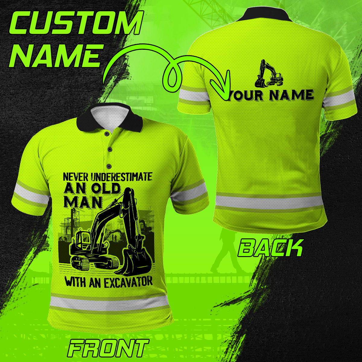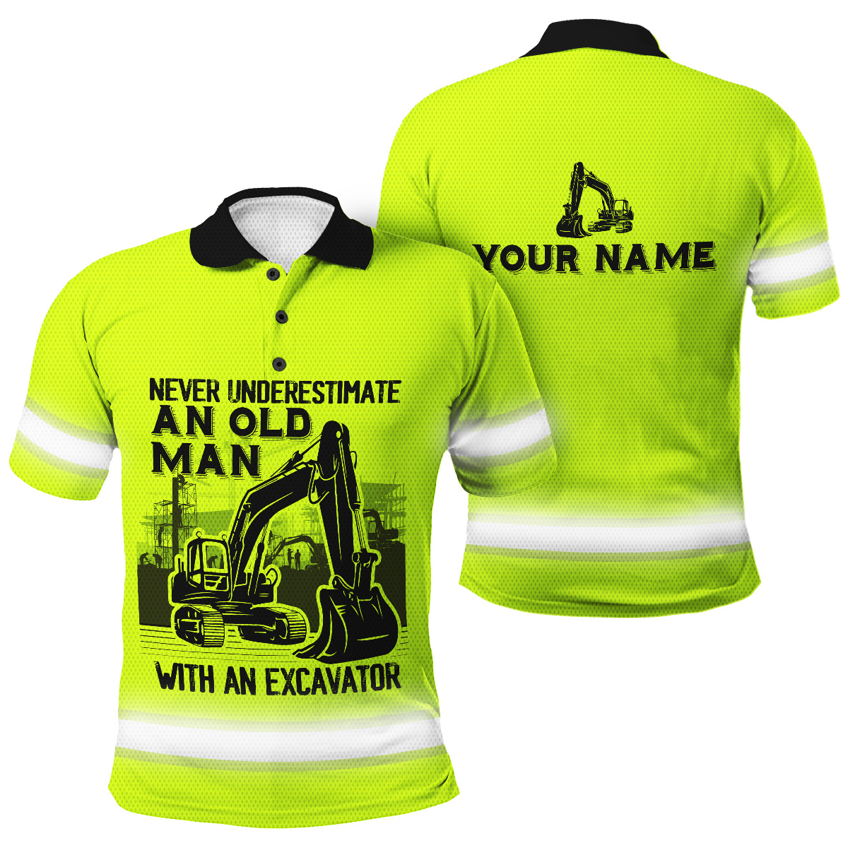 Hi Vis Polo Shirt Reflective Old Man With An Excavator Custom Name Safety Workwear For Workers, Operator, Cyclists, Patriotic