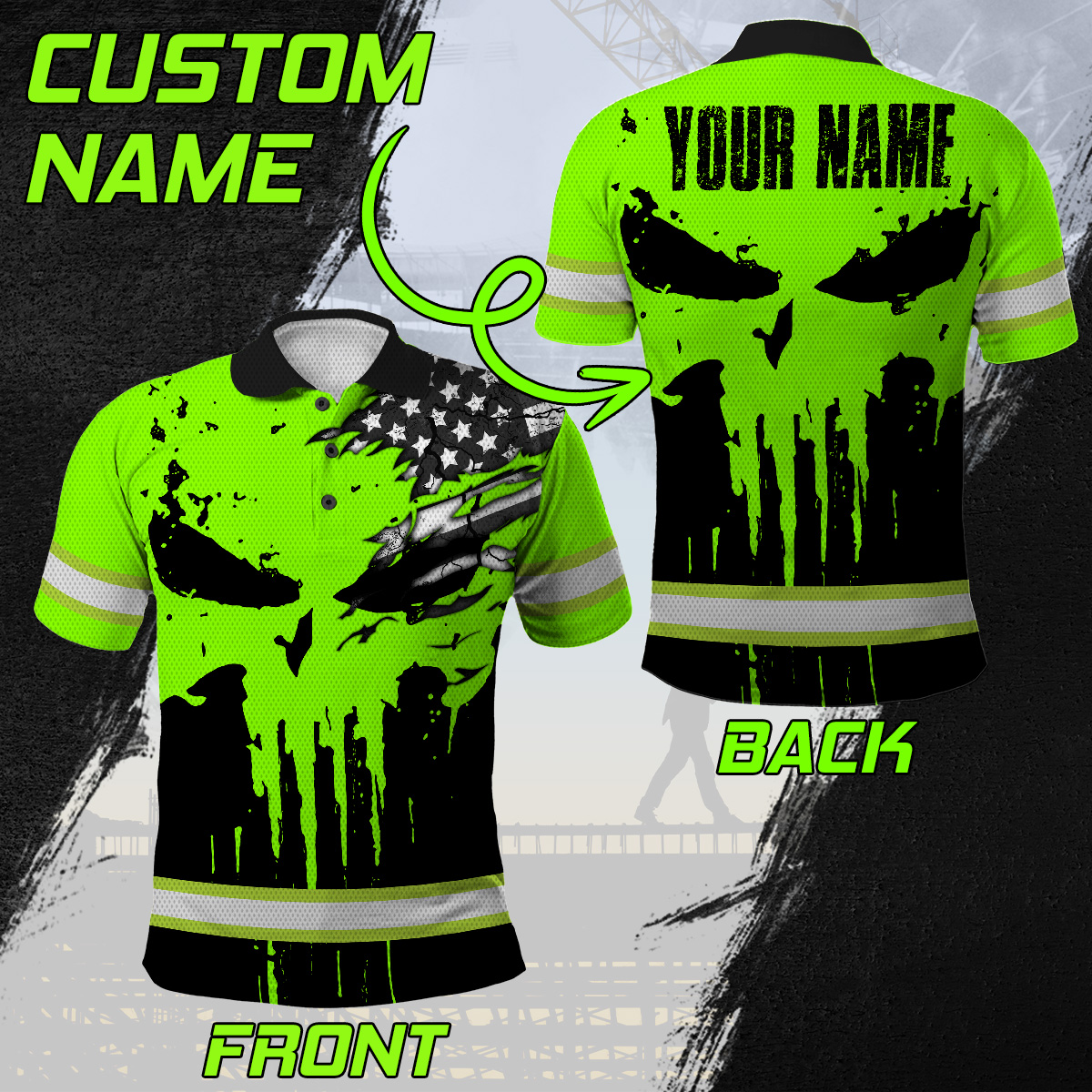 Be the first to review “Hi Vis Polo Shirt Reflective Skull Scratch America Flag Custom Name Safety Workwear”