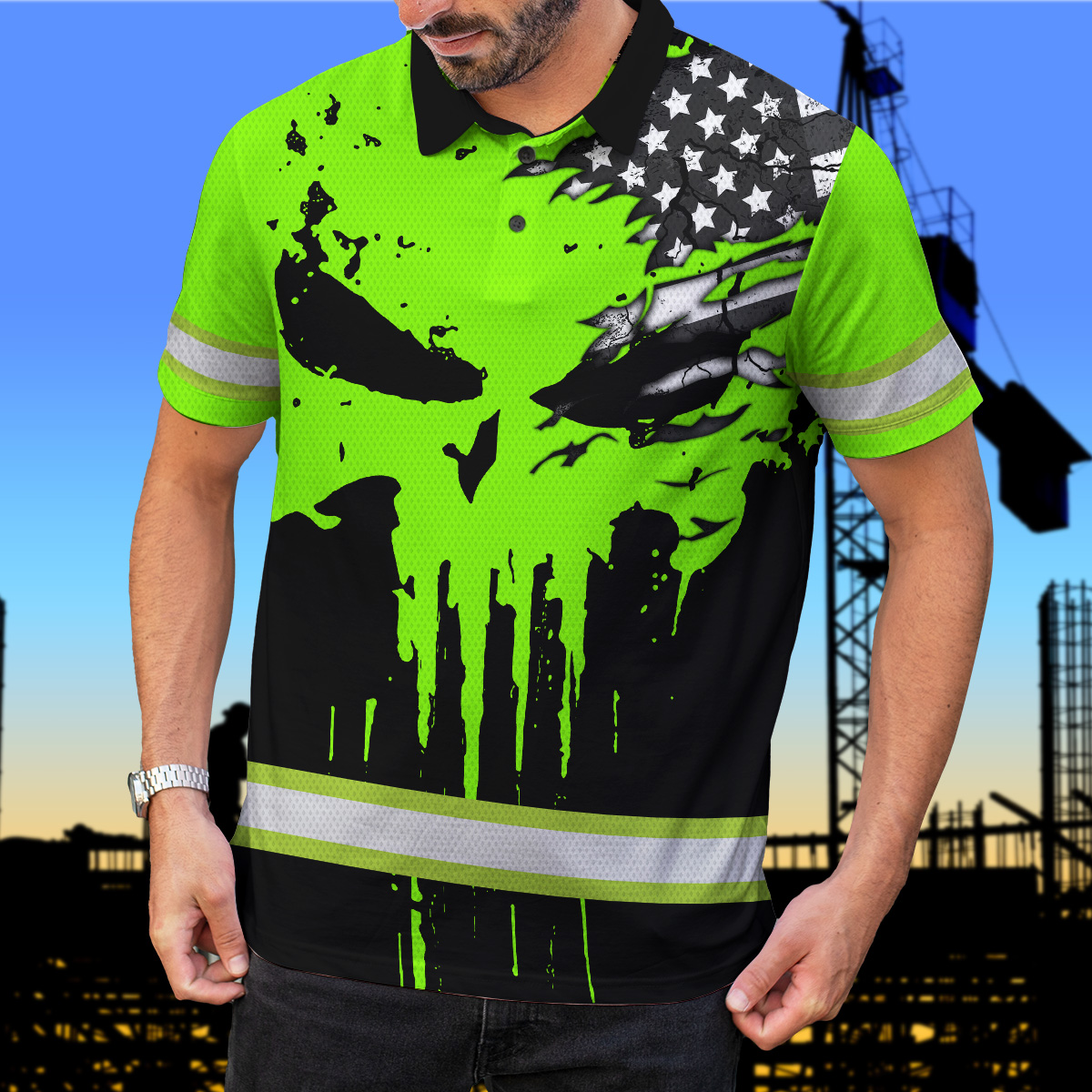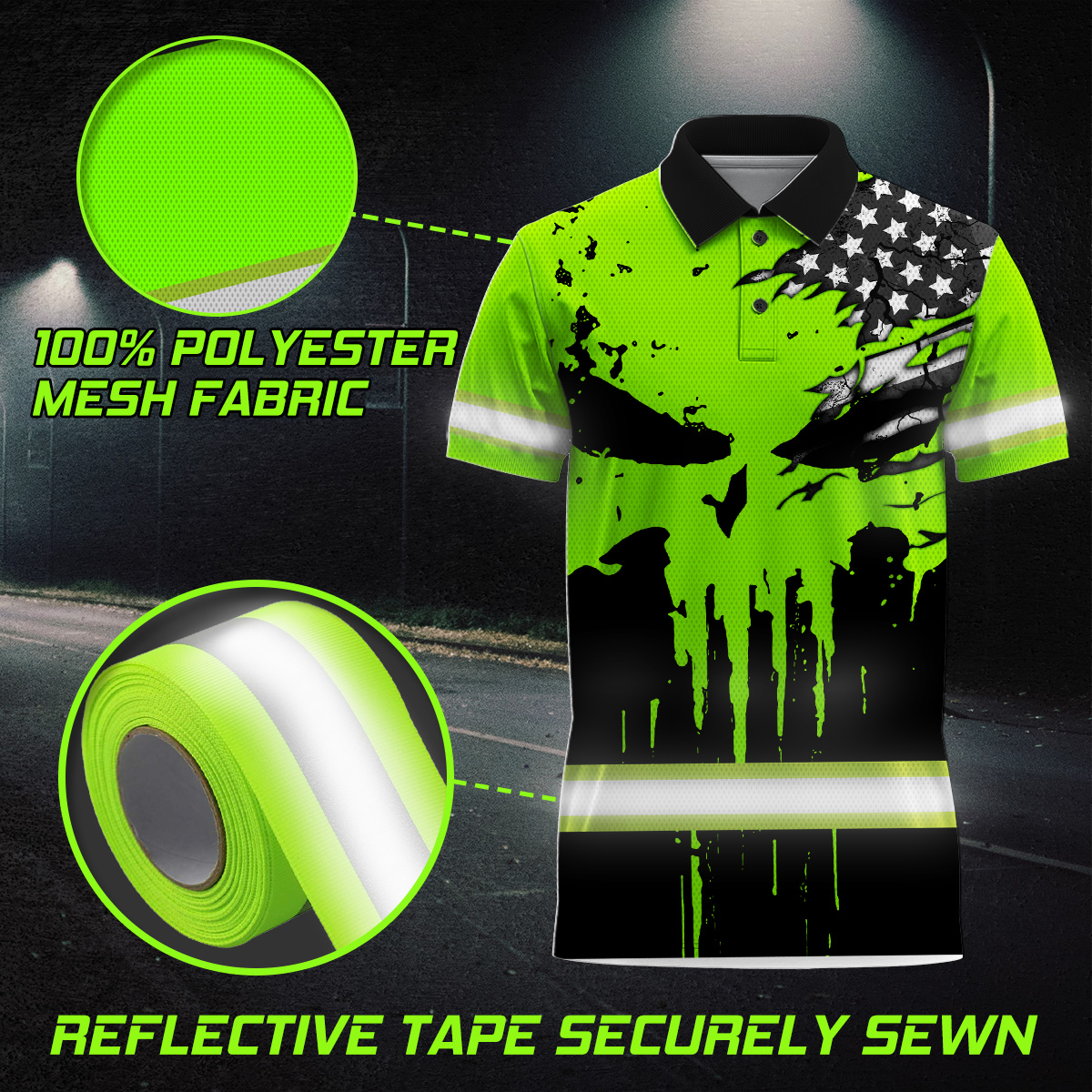 Hi Vis Polo Shirt Reflective Skull Scratch America Flag Custom Name Safety Workwear