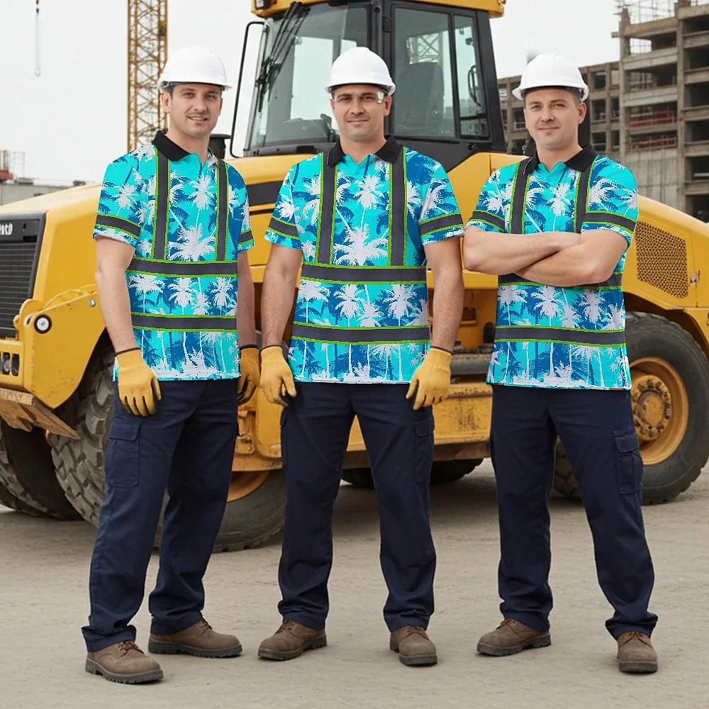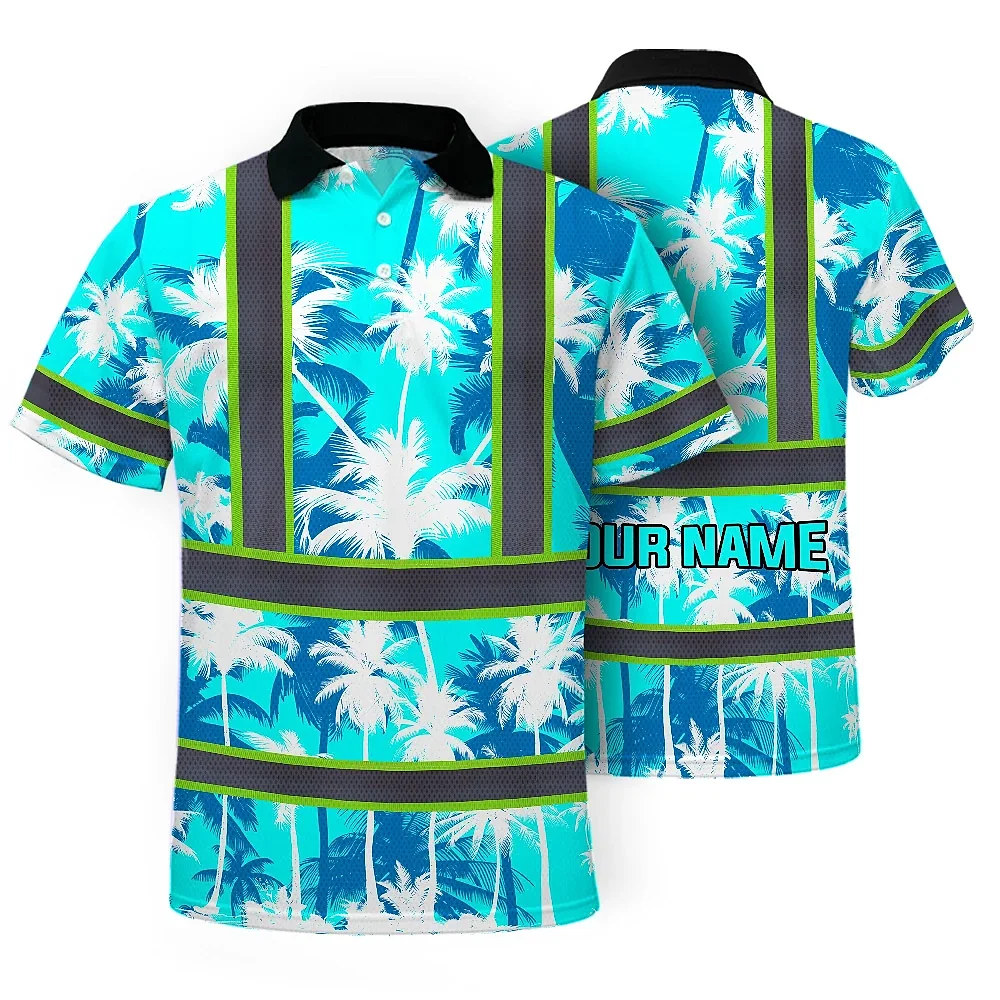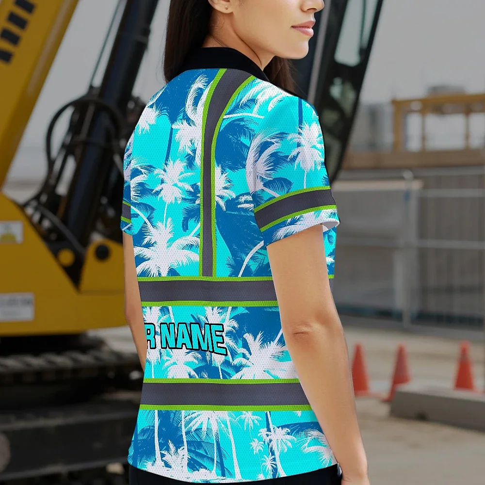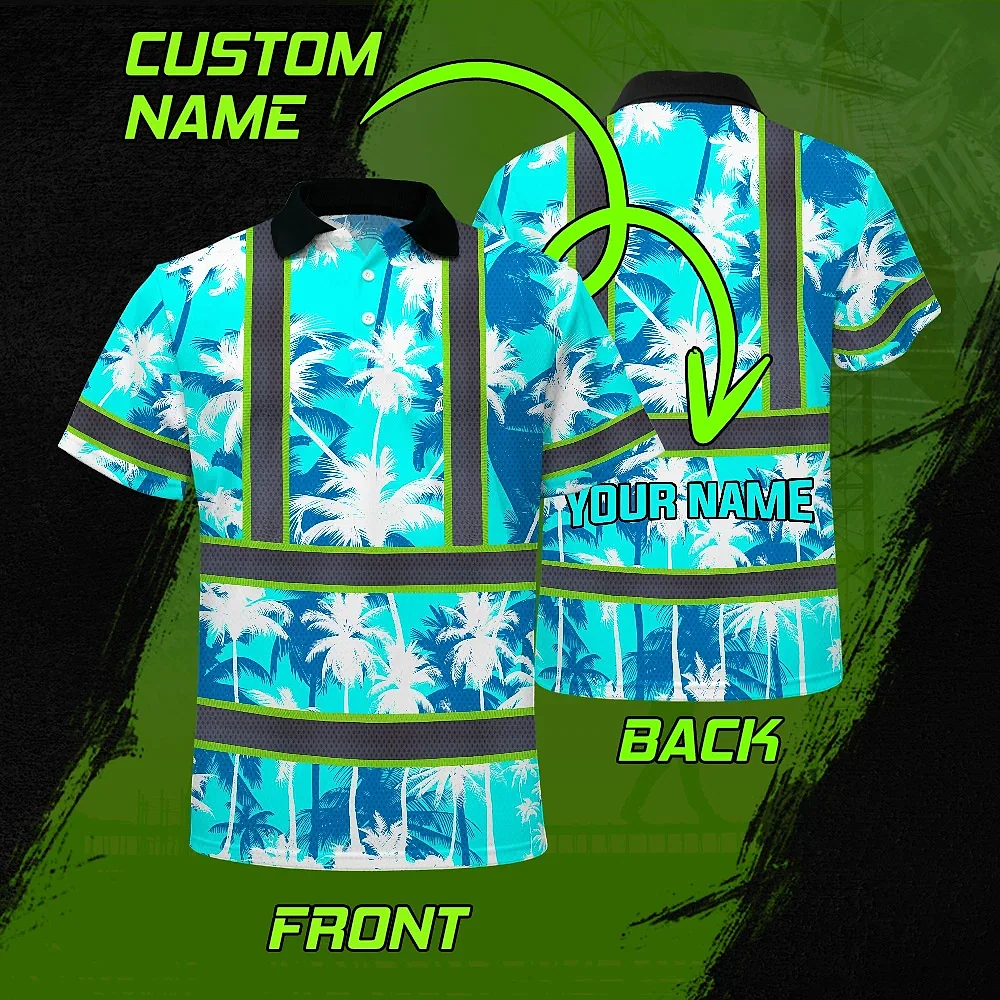Hi Vis Polo Shirt Reflective Tapes Blue Neon Flowers Custom Name Safety Workwear For Workers, Truckers, Operators