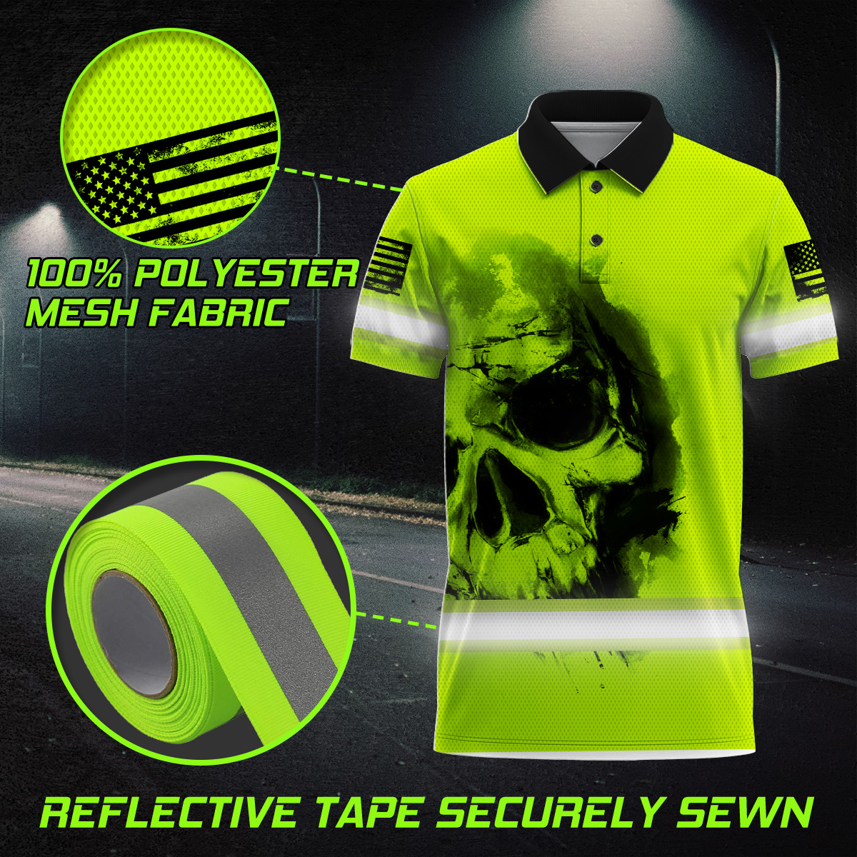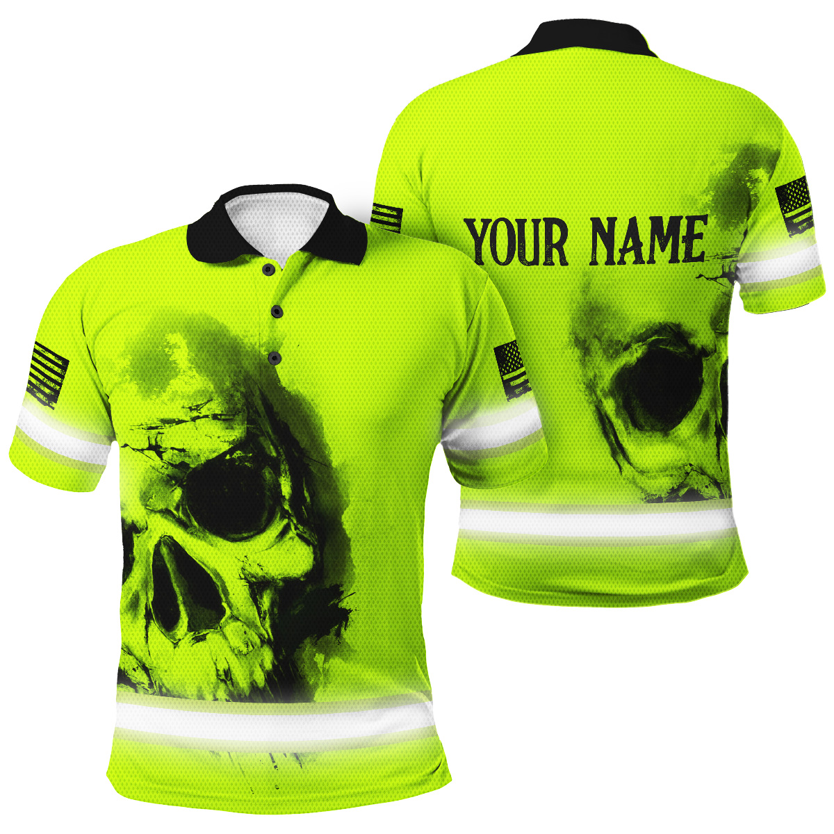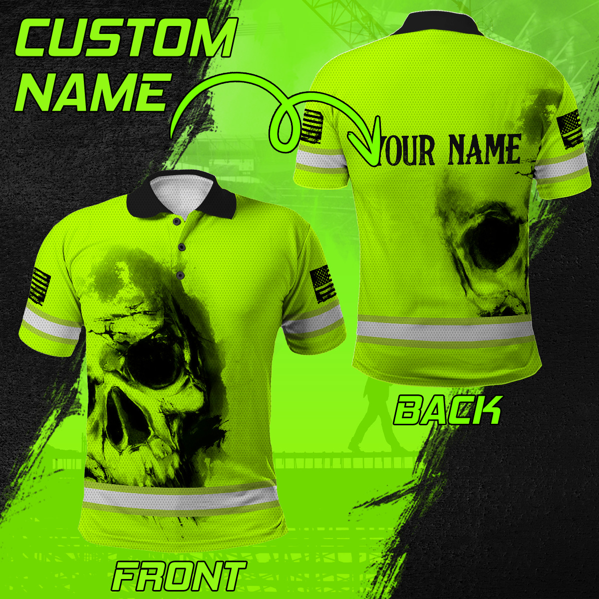 Hi Vis Polo Shirt Reflective Tapes Green Neon Skull Custom Name Safety Workwear For Skull Lover
