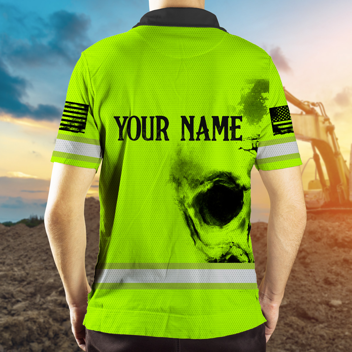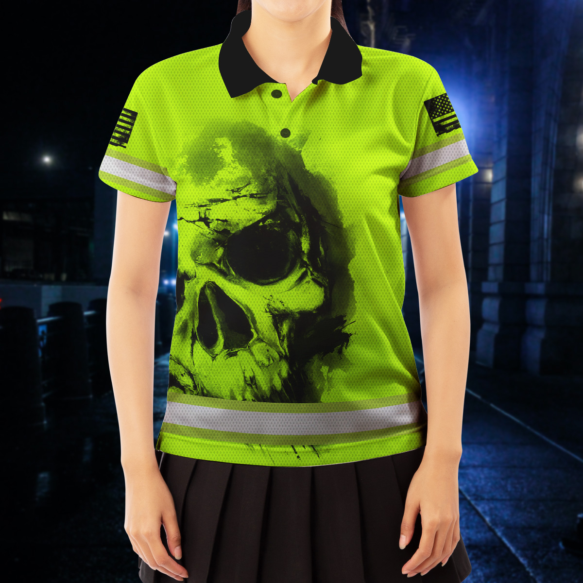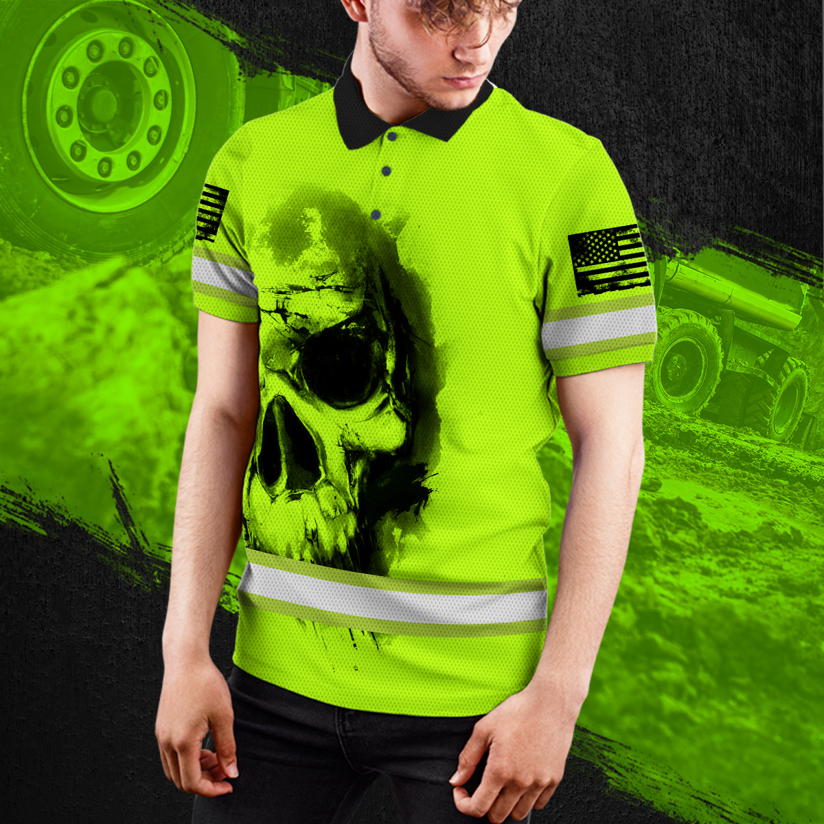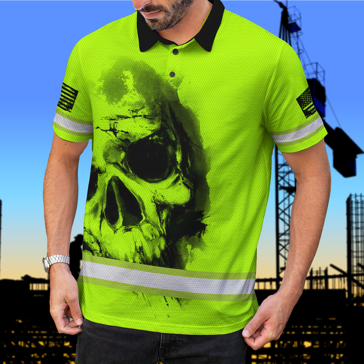 Hi Vis Polo Shirt Reflective Tapes Green Neon Skull Custom Name Safety Workwear For Skull Lover