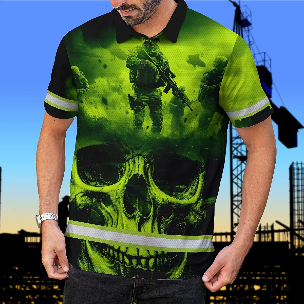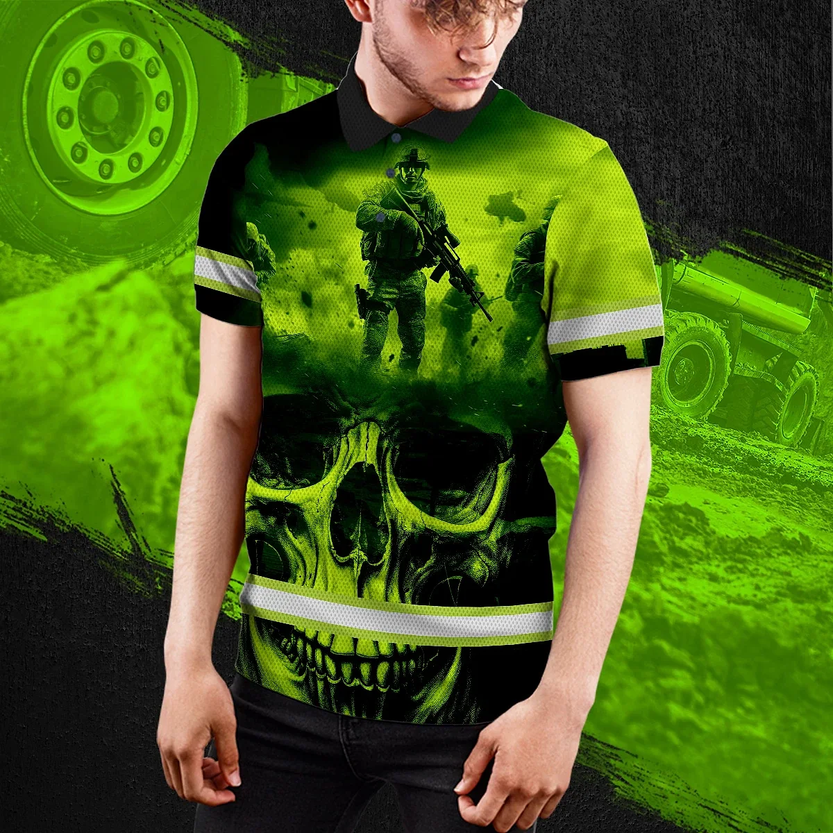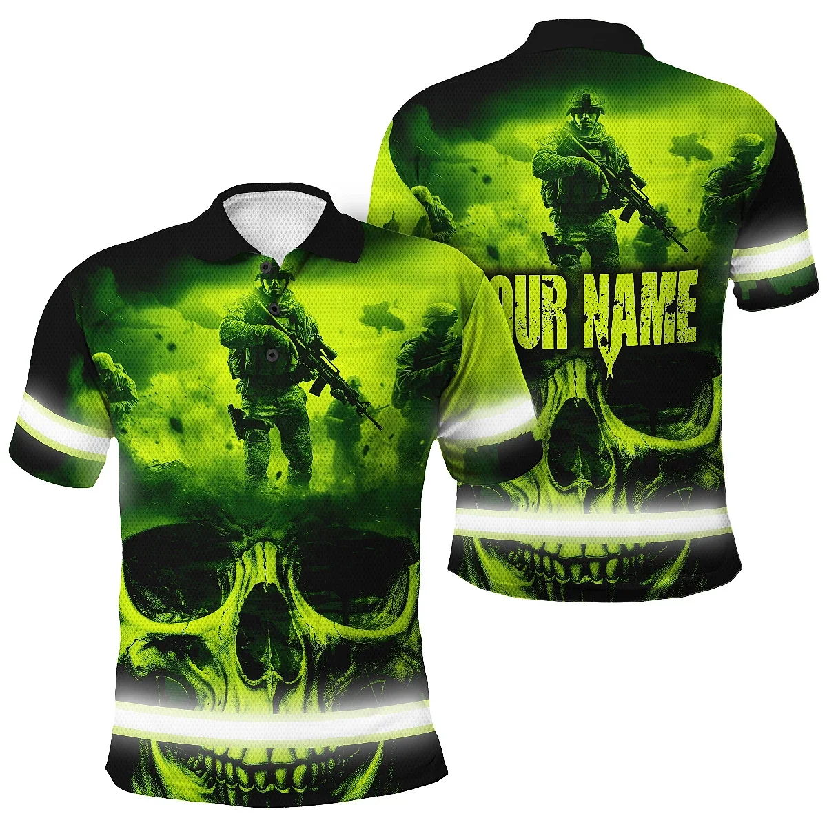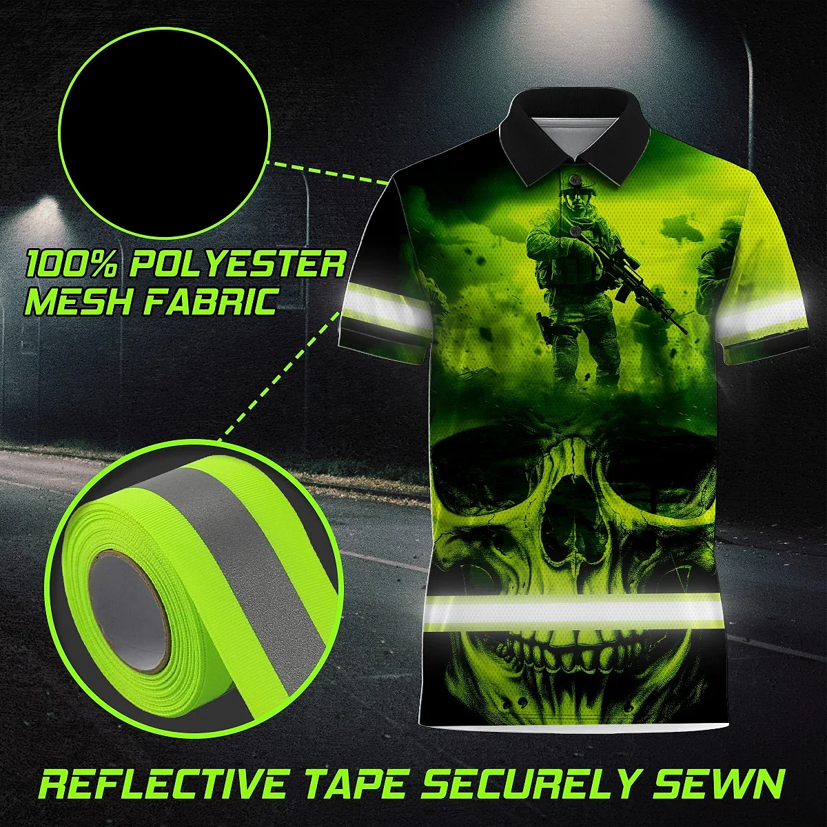 Hi Vis Polo Shirt Reflective Tapes Green Neon Skull Veteran Custom Name Safety Workwear For Workers, Runners, Skull Lover