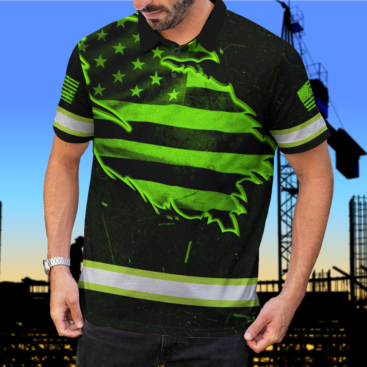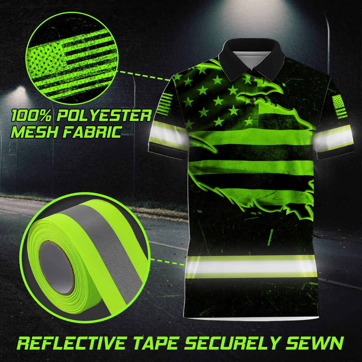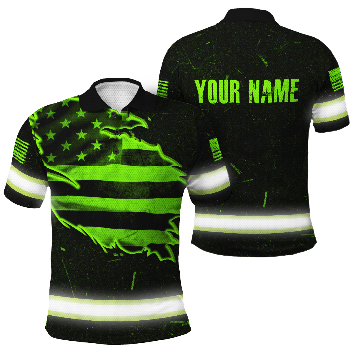Hi Vis Polo Shirt Reflective Tapes Green Neon US Flag Scratch