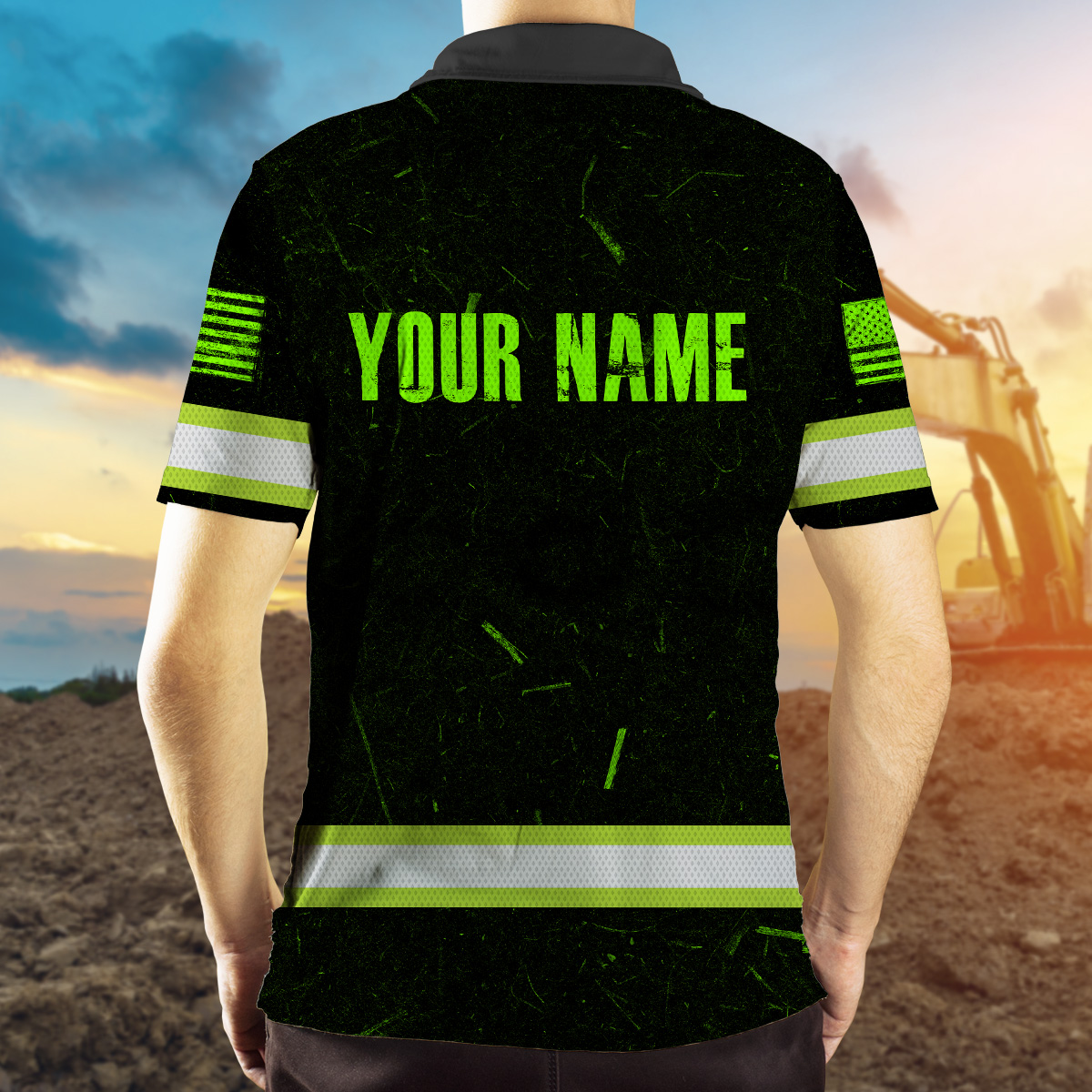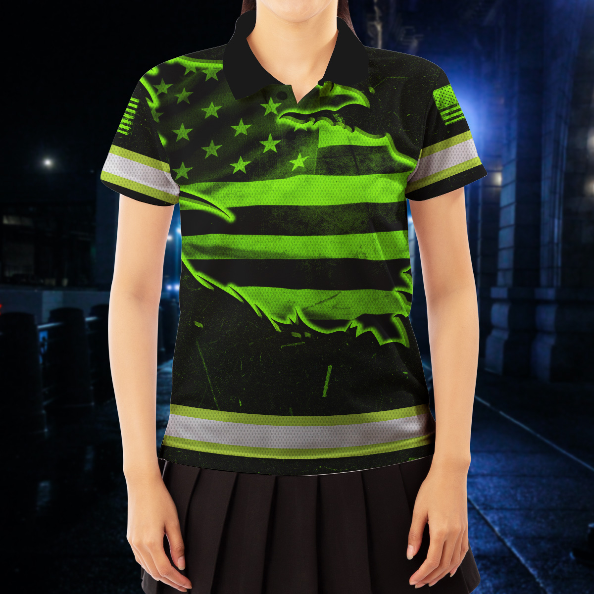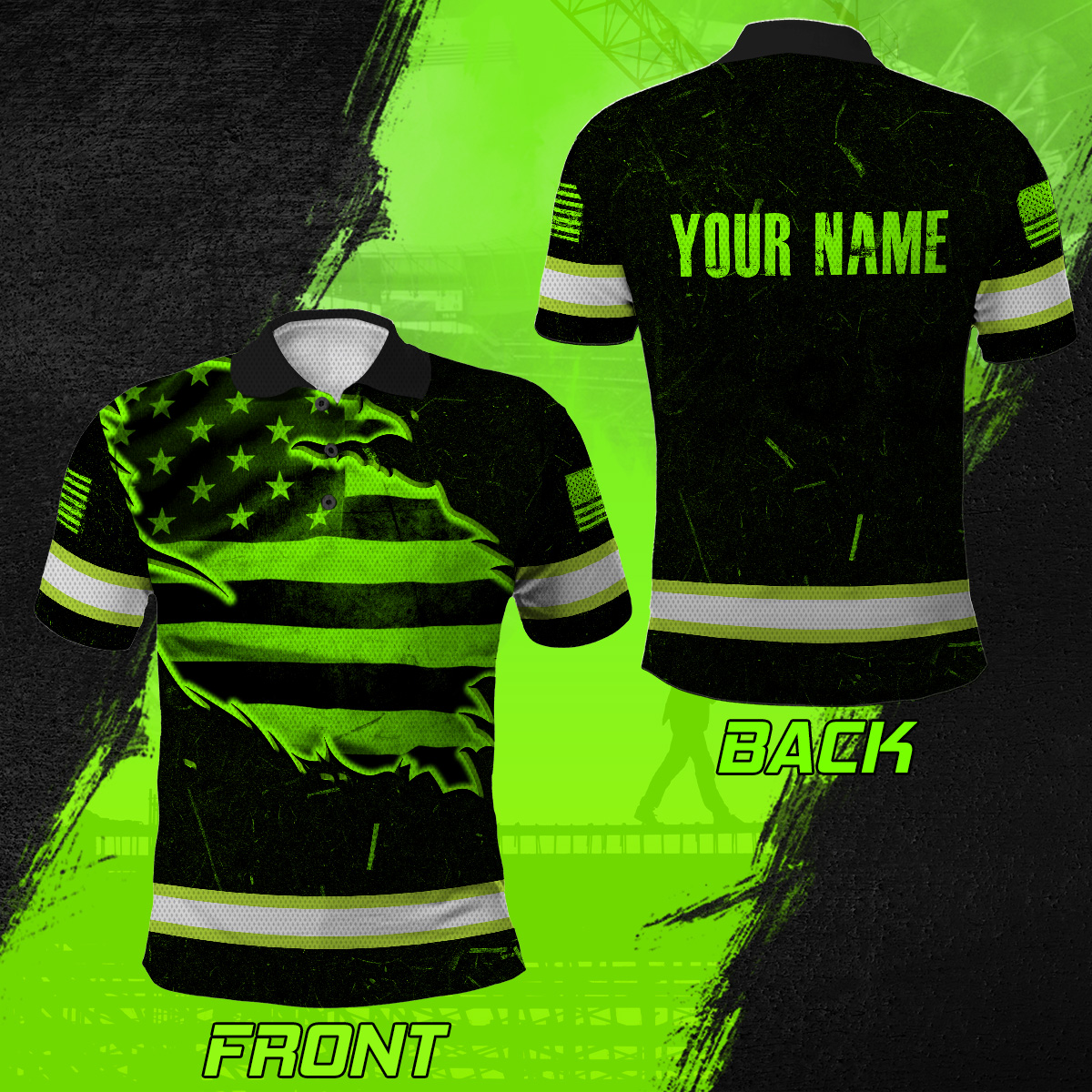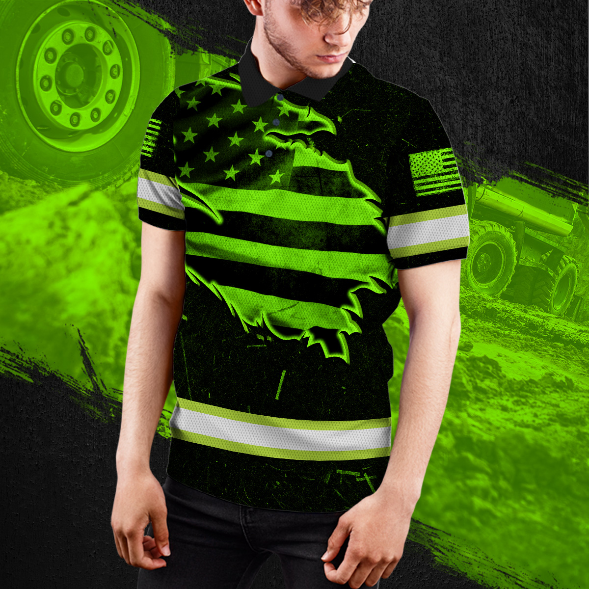 Hi Vis Polo Shirt Reflective Tapes Green Neon US Flag Scratch