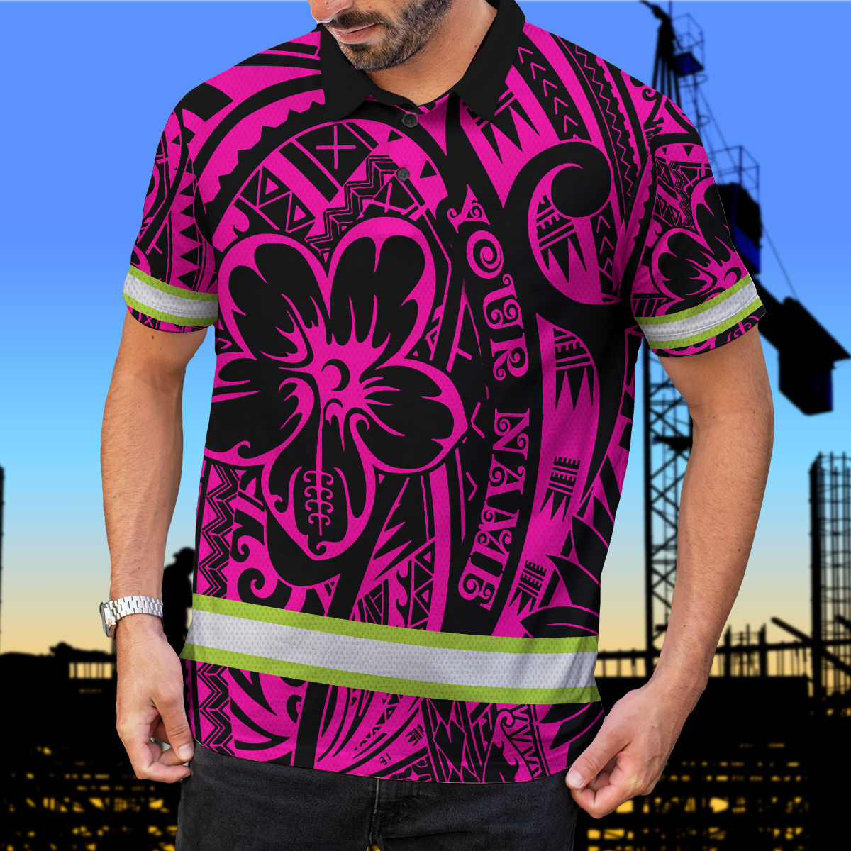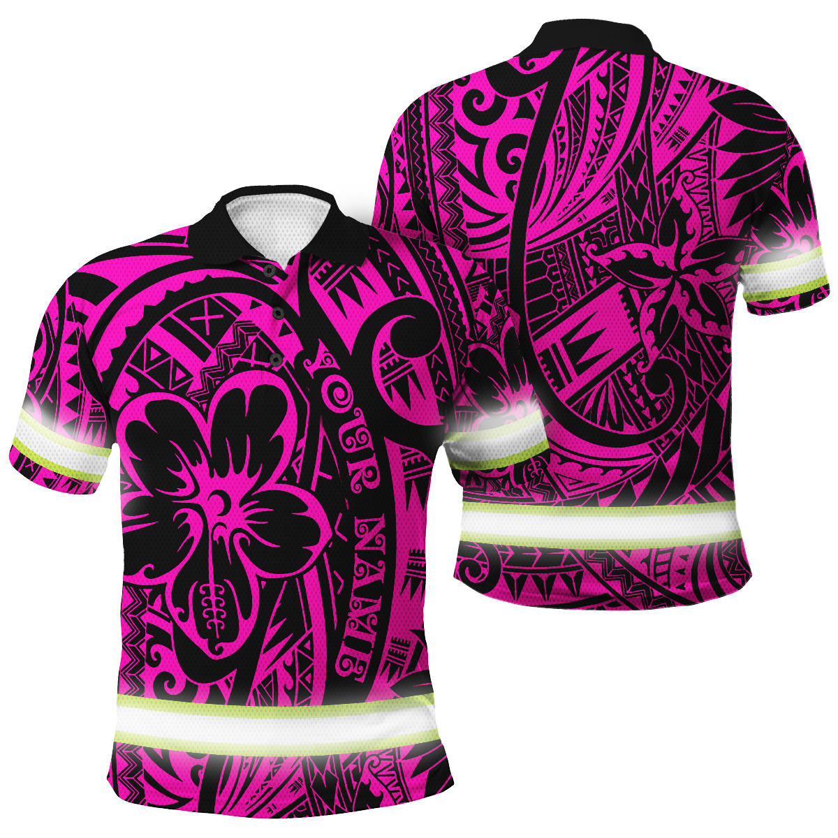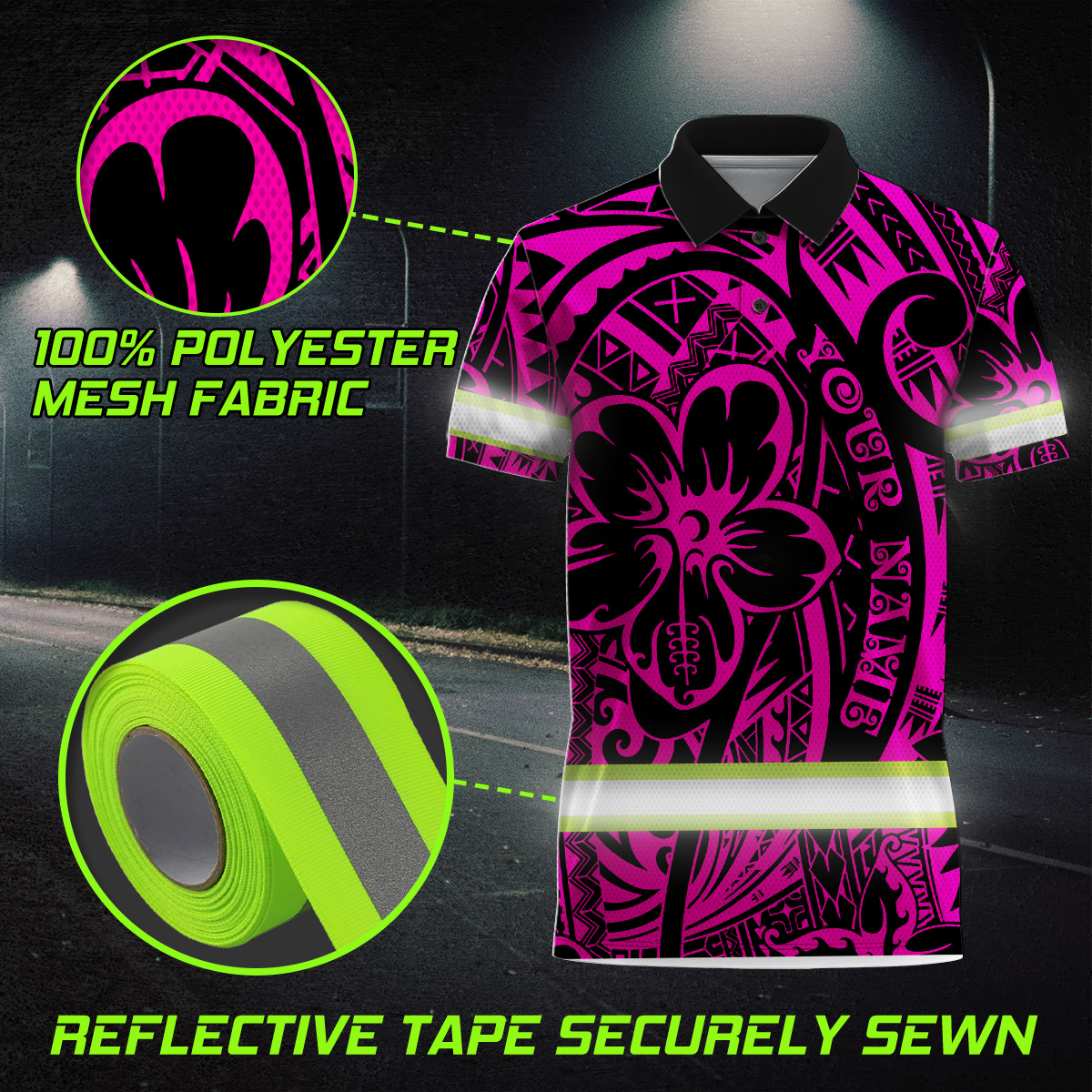 Hi Vis Polo Shirt Reflective Tapes Pink Flower Hawaiian Polynesian Tribal Custom Name Safety Workwear For Workers, Runners, Cyclists