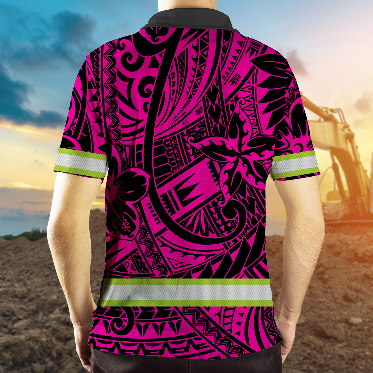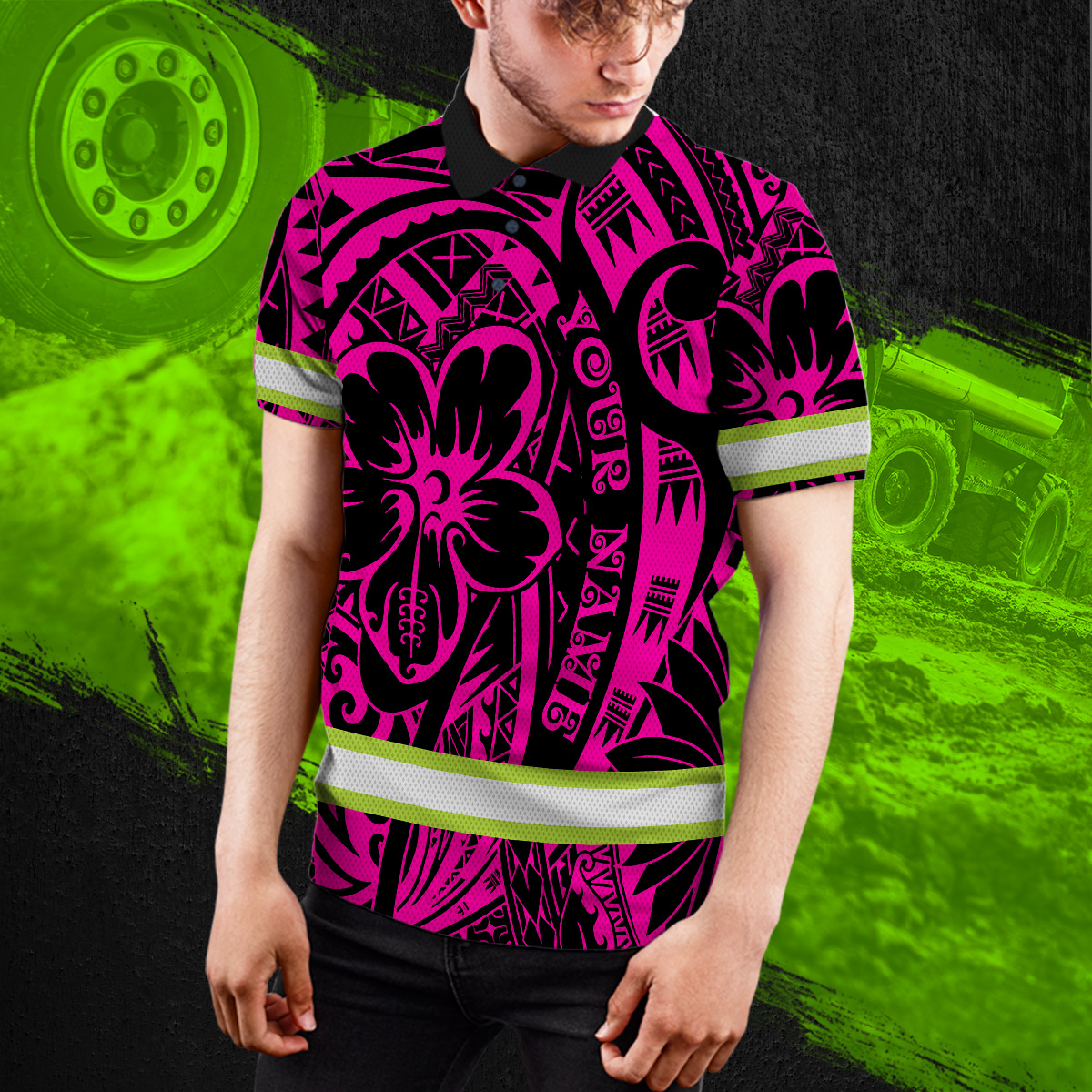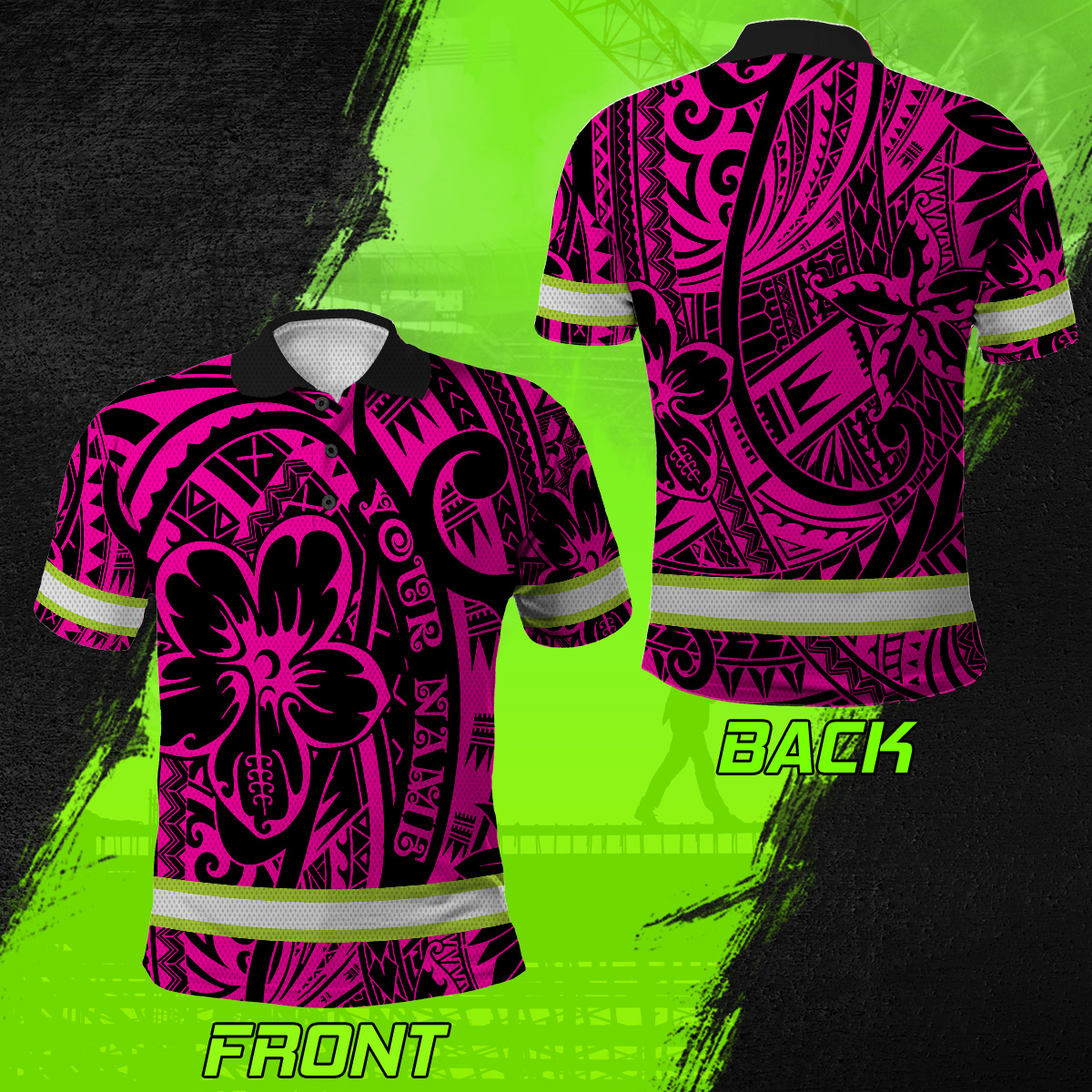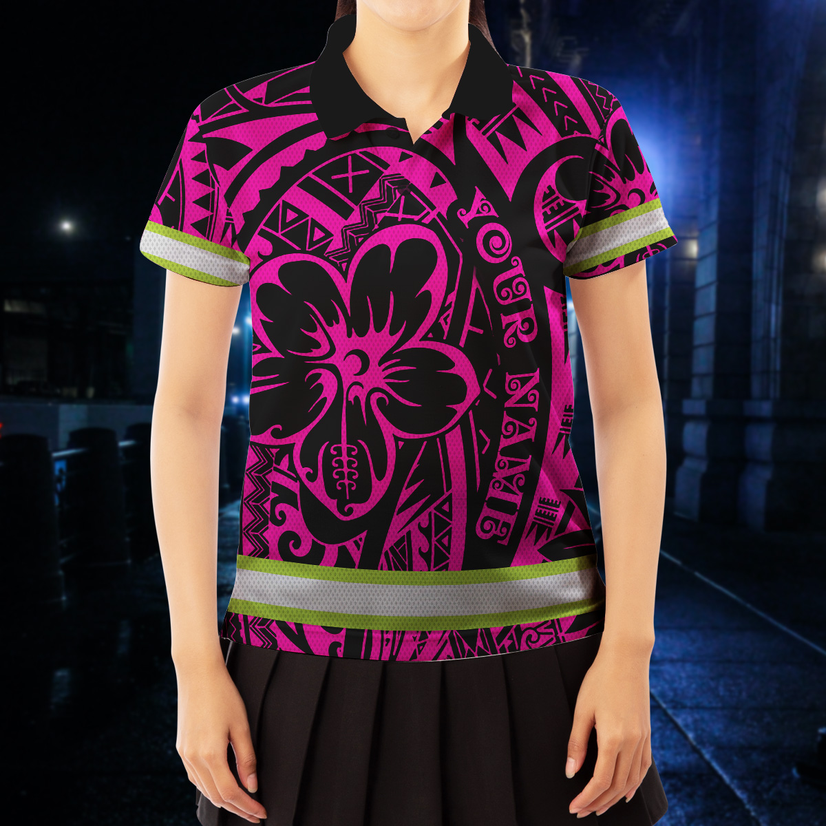 Hi Vis Polo Shirt Reflective Tapes Pink Flower Hawaiian Polynesian Tribal Custom Name Safety Workwear For Workers, Runners, Cyclists