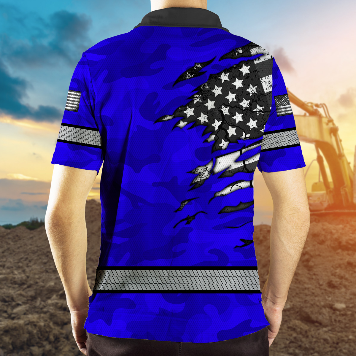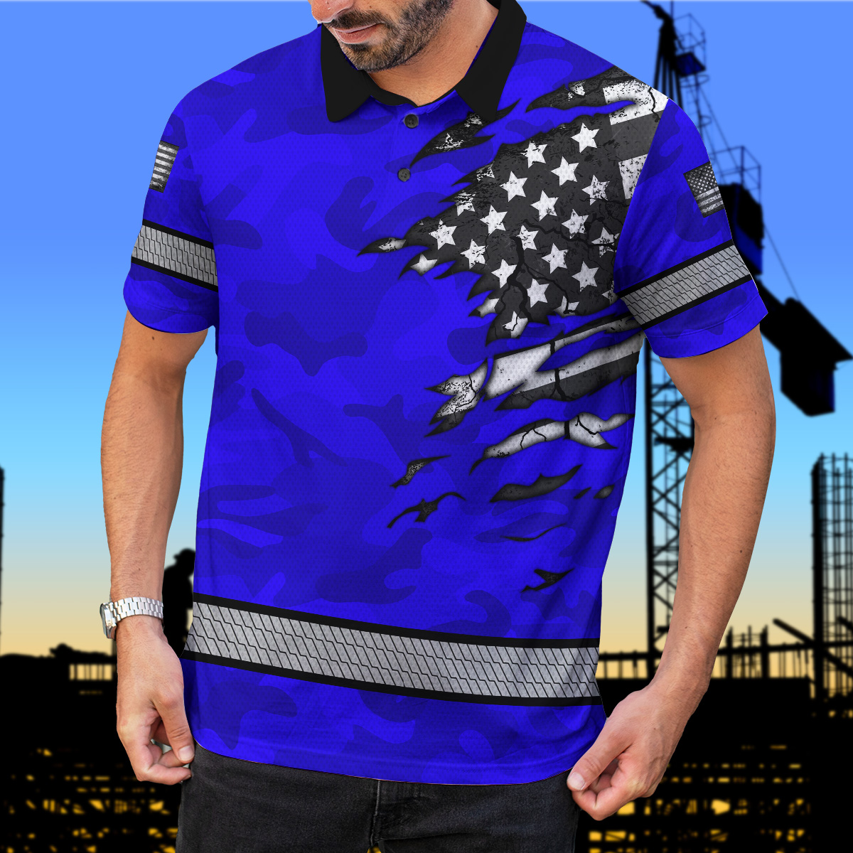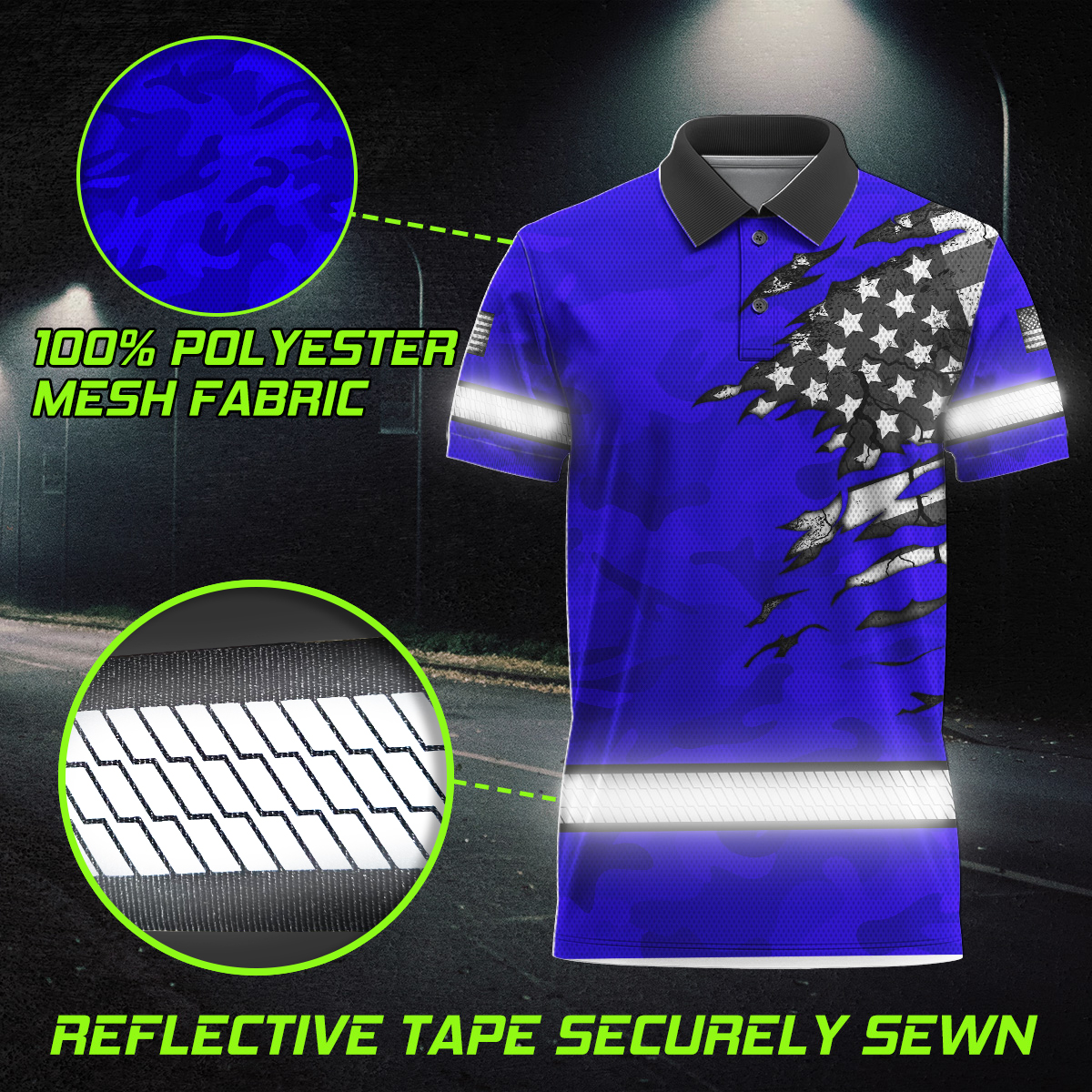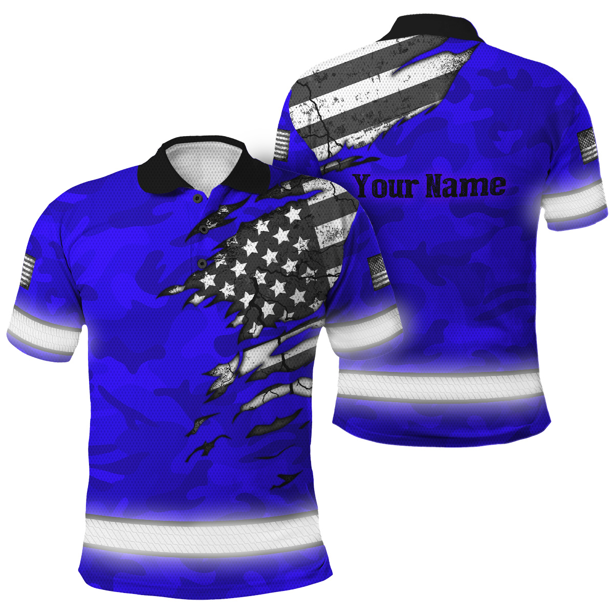 Hi Vis Polo Shirt Reflective Tapes Scratch Blue Camo Neon US Flag Custom Name Safety Workwear
