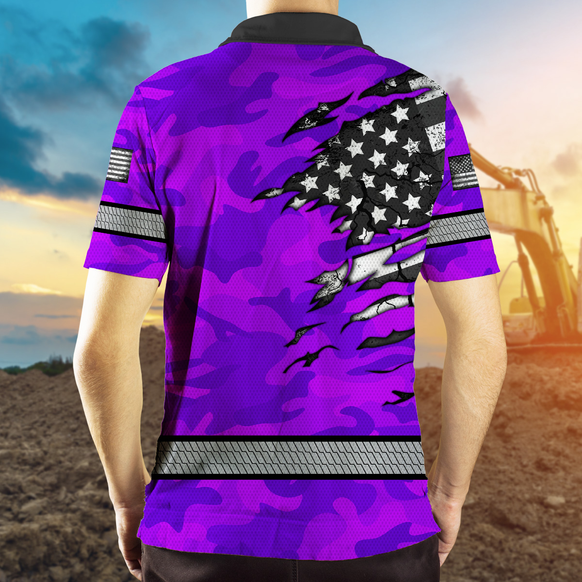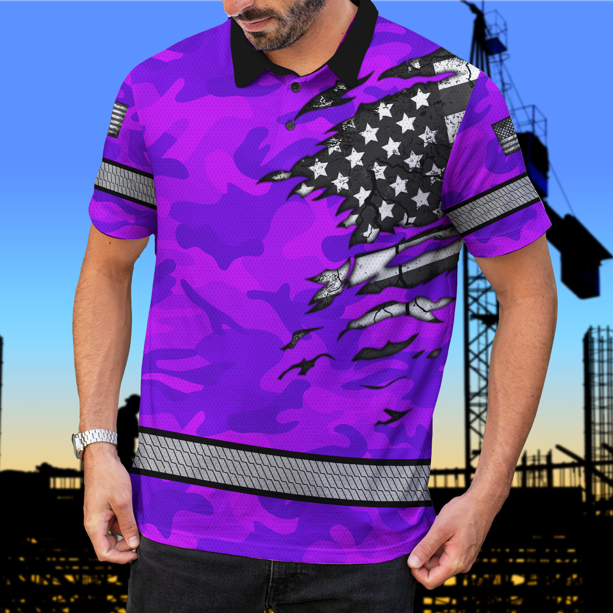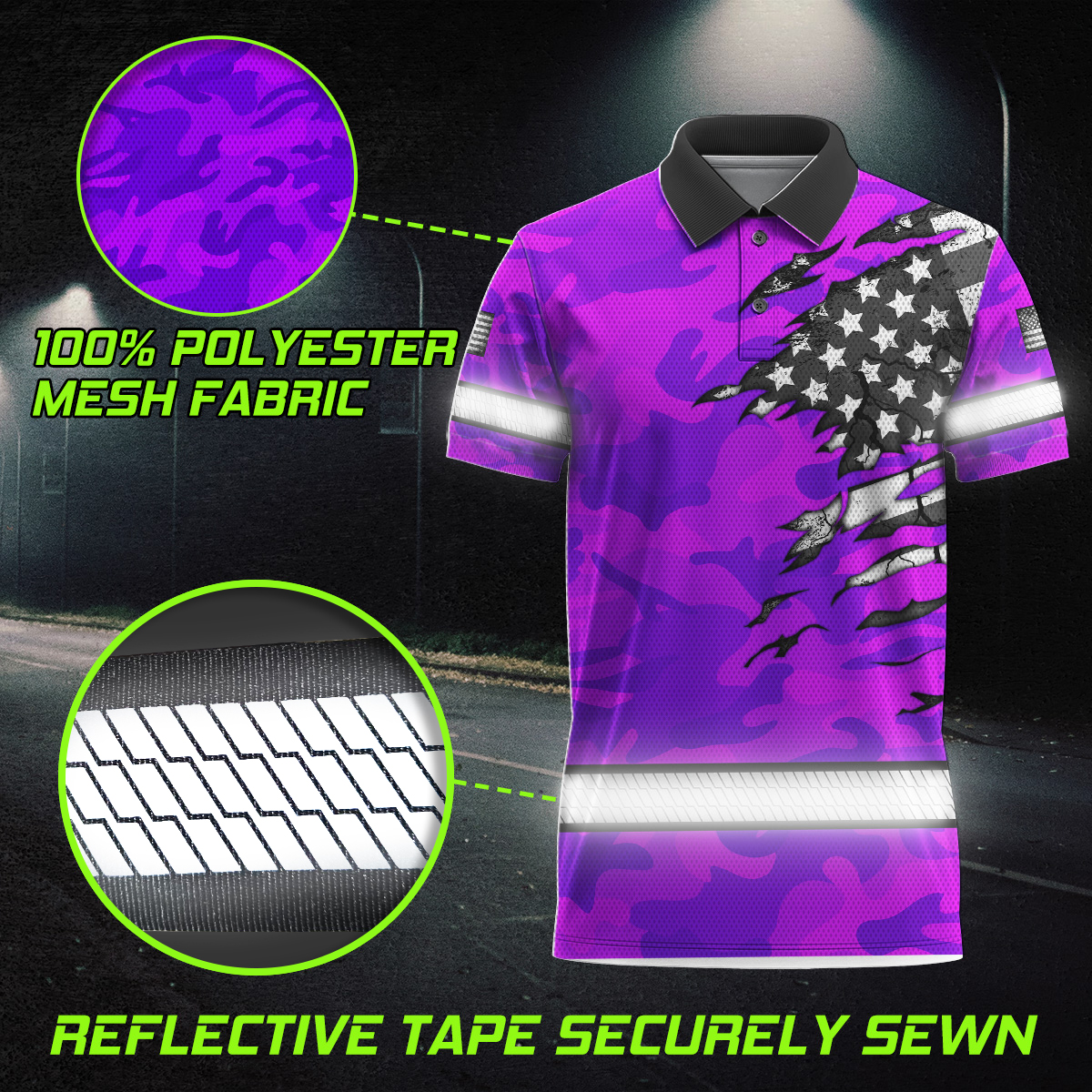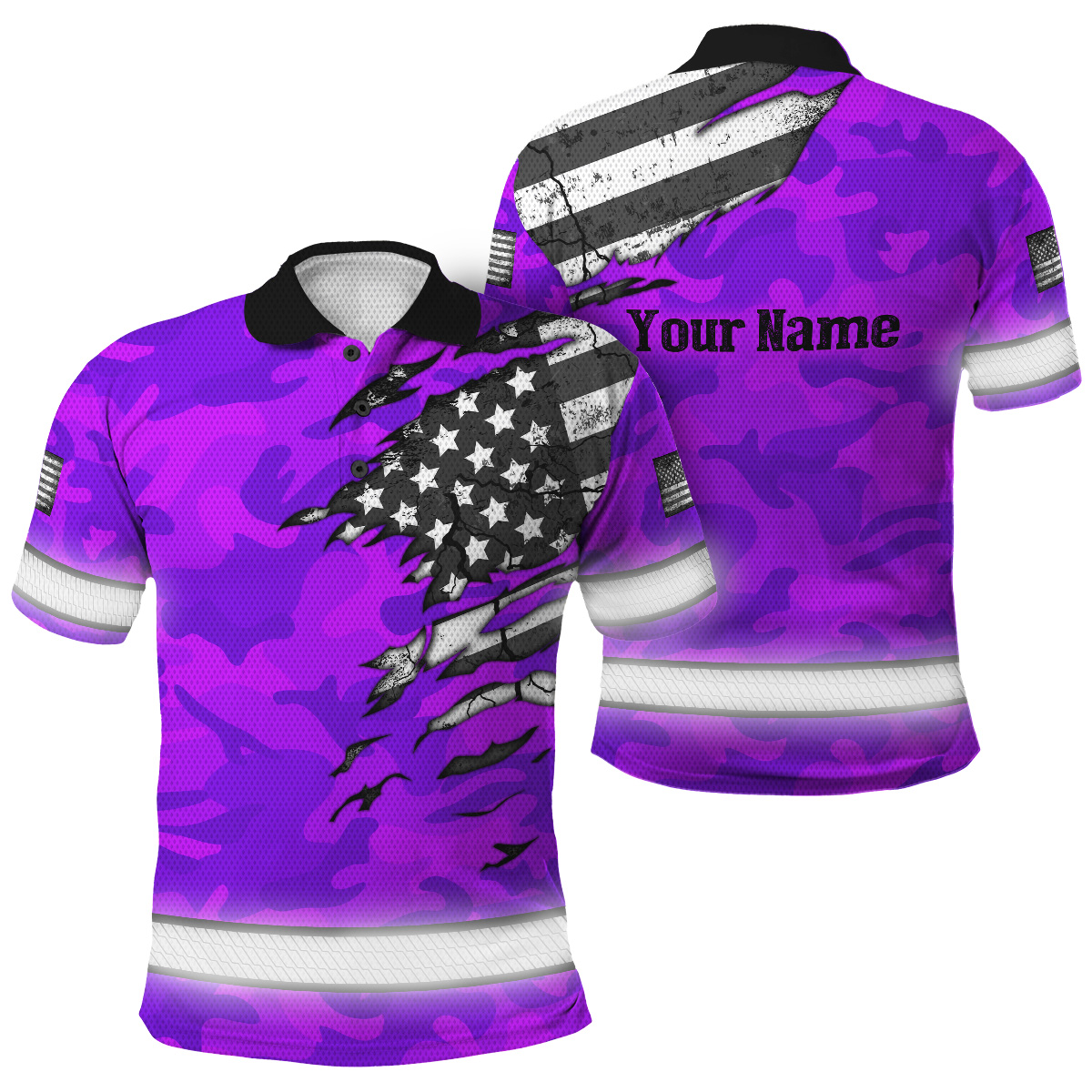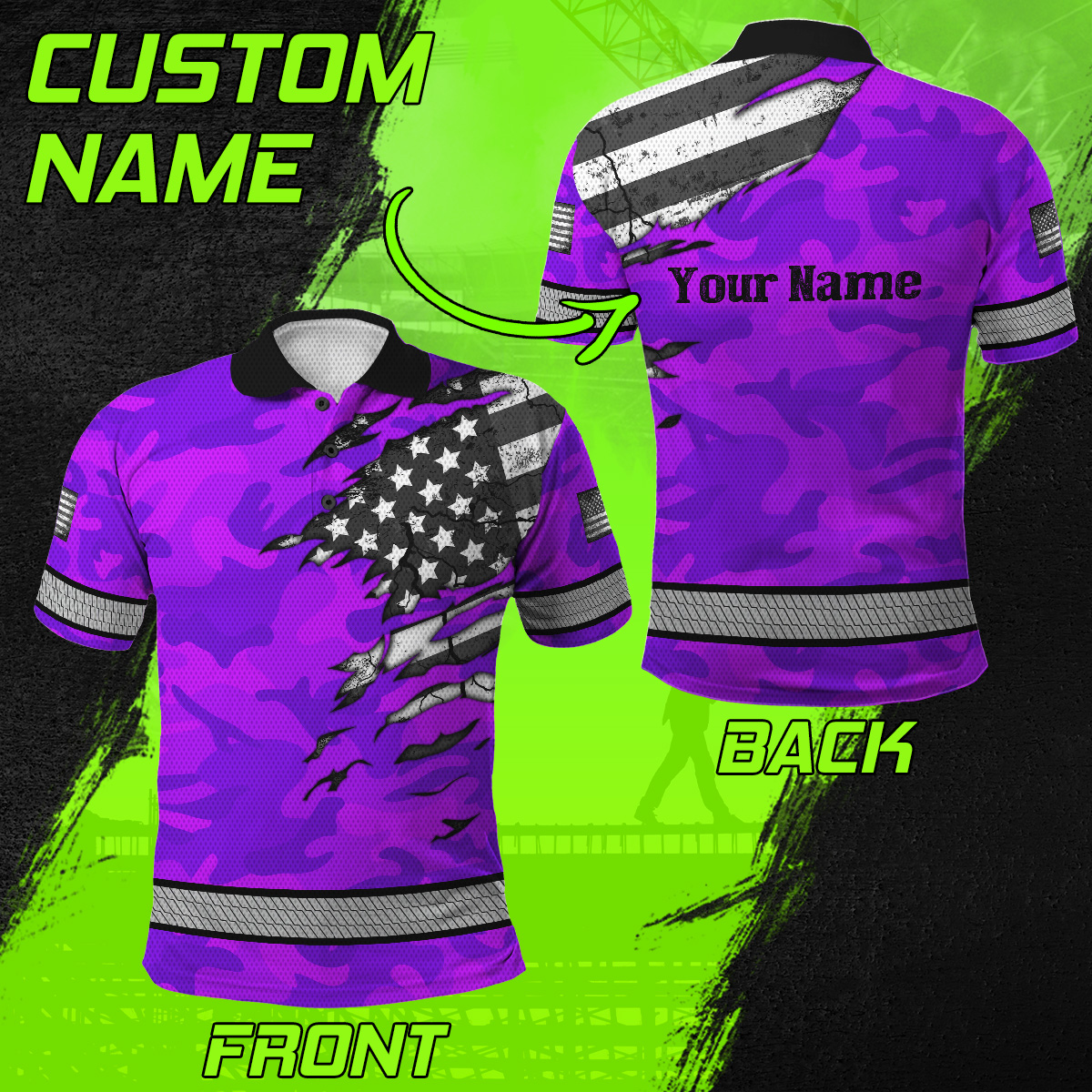 Hi Vis Polo Shirt Reflective Tapes Scratch Violet Camo Neon US Flag Custom Name Safety Workwear