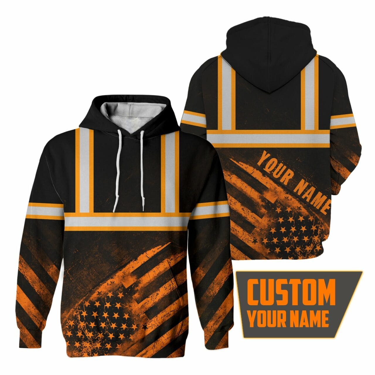 - The Hi Vis Reflective Orange US Flag Custom Name Hoodie Safety Workwear also features a custom name printing option that allows the wearer to personalize the hoodie with their name or company logo.