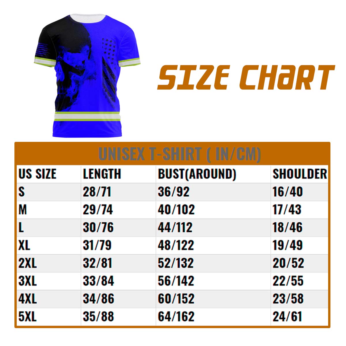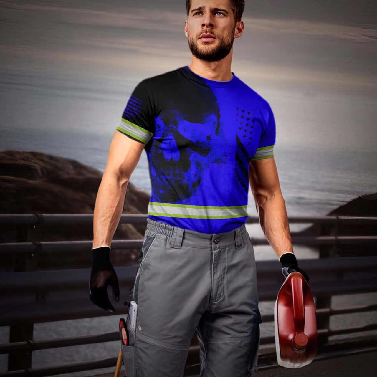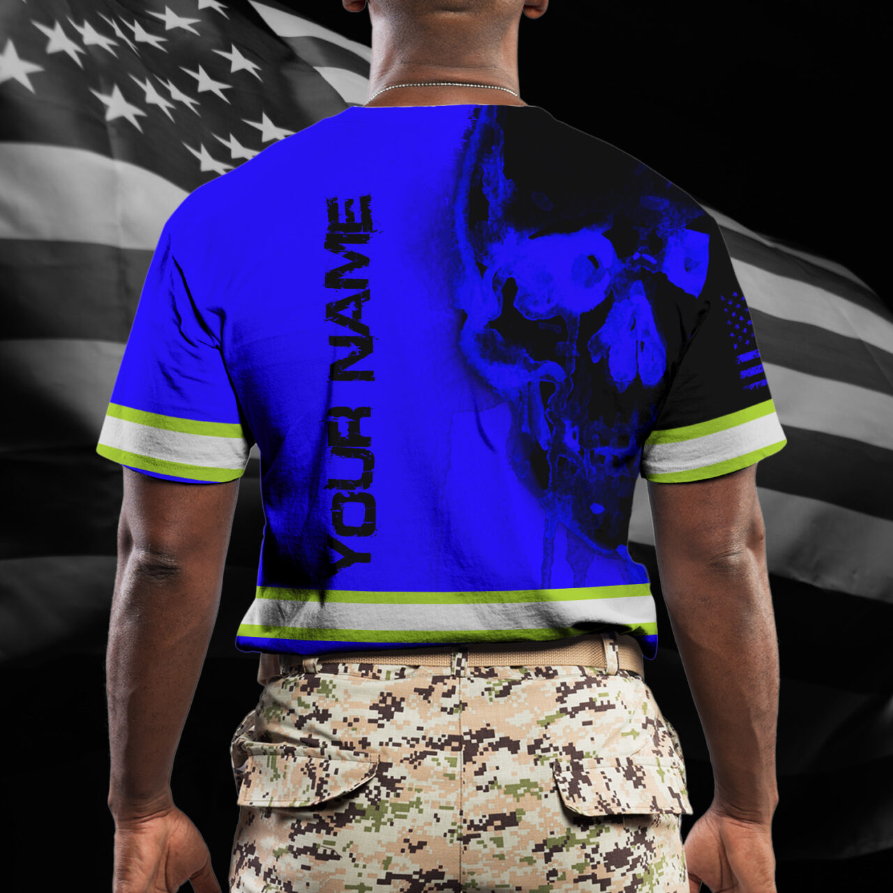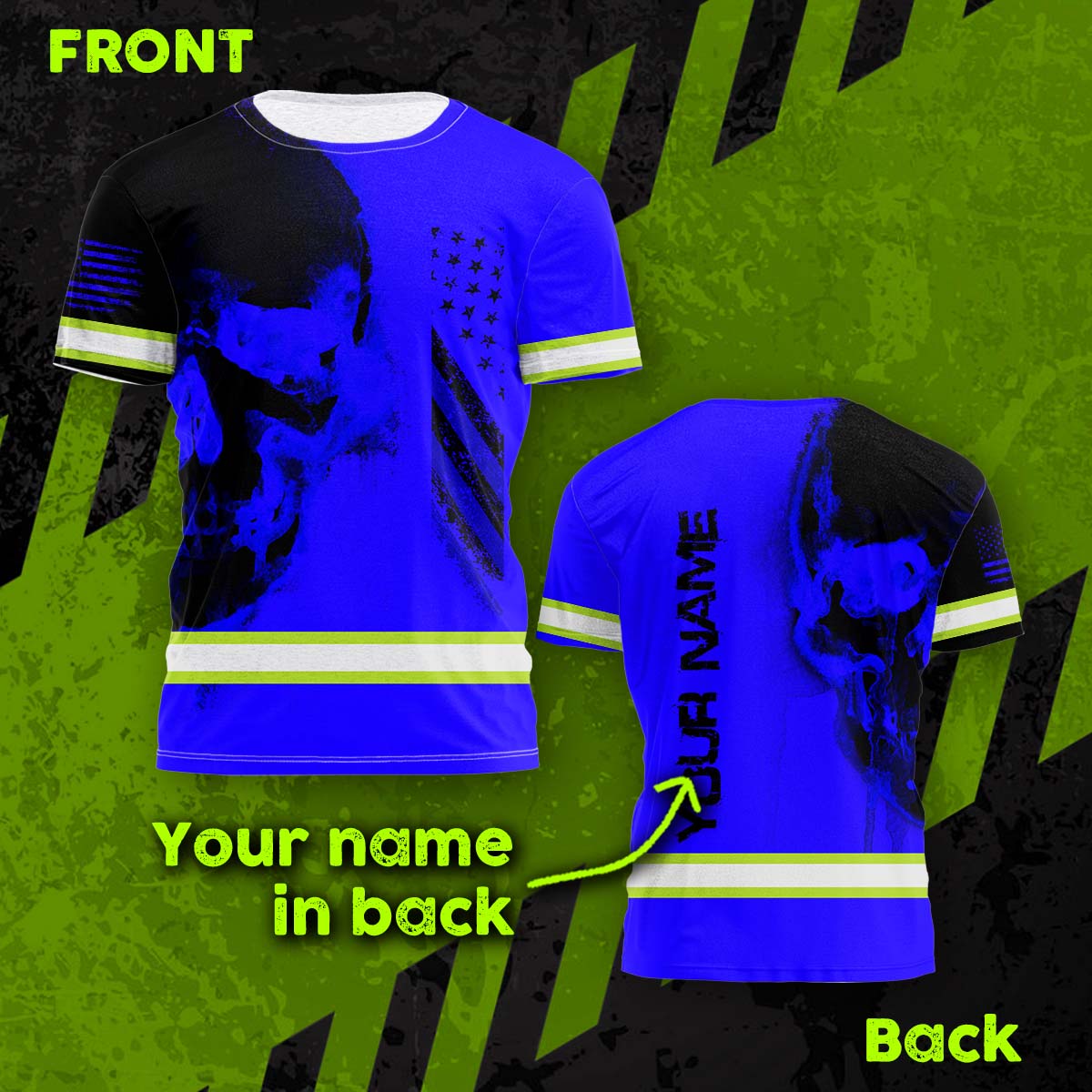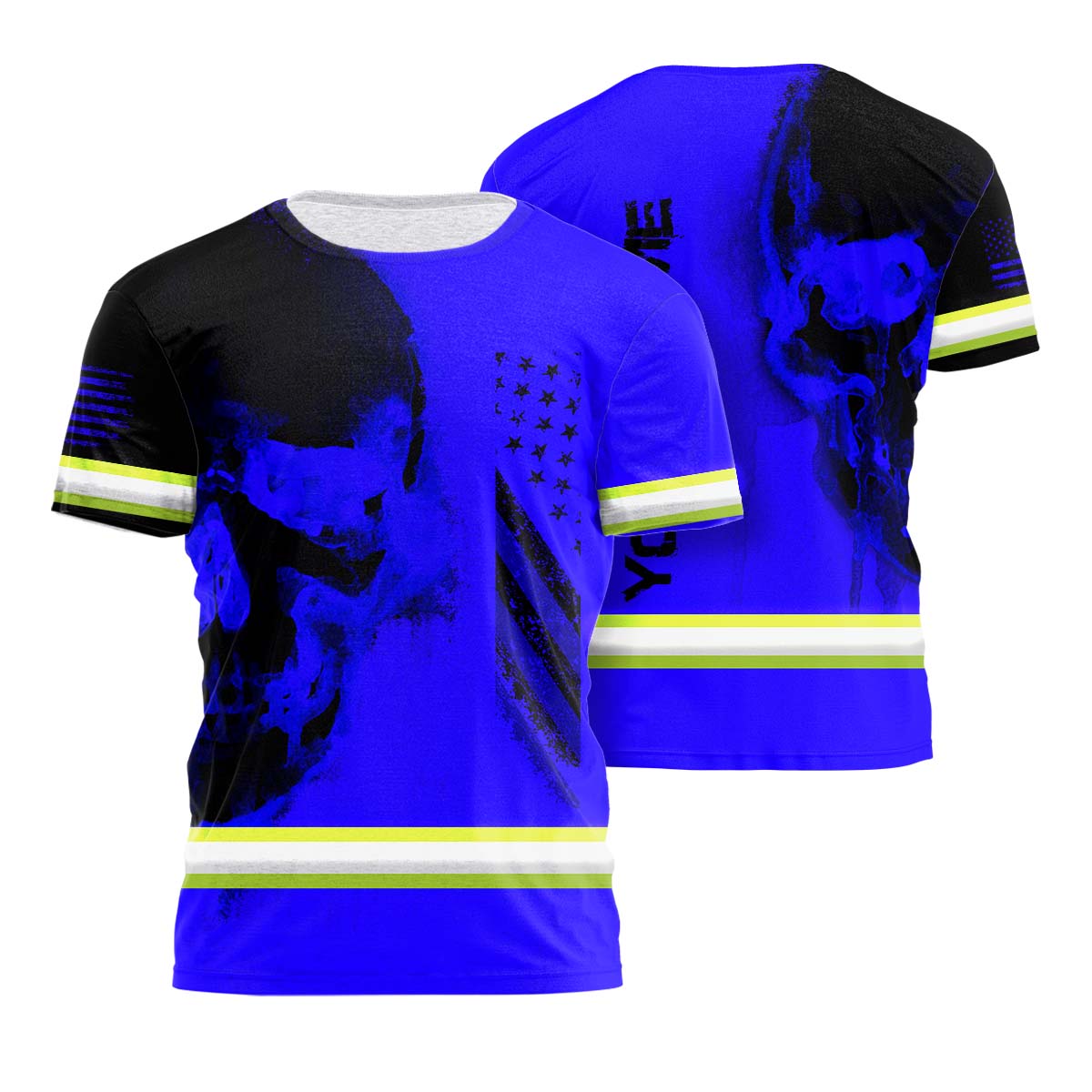 Hi Vis Shirt Reflective Blue Neon Skull USA Flag Custom Name Safety Workwear For Workers, Runners, Cyclists, Patriotic