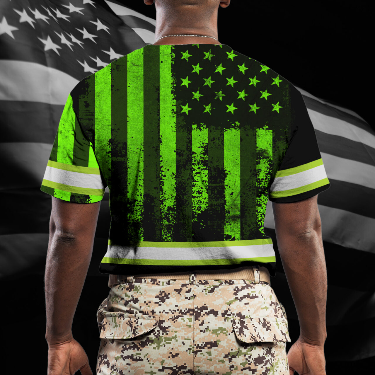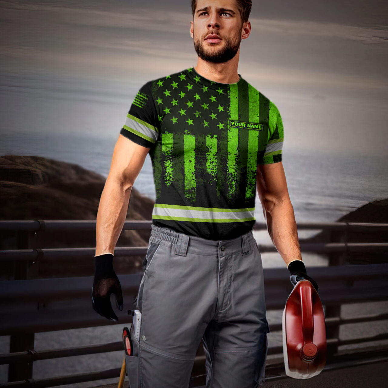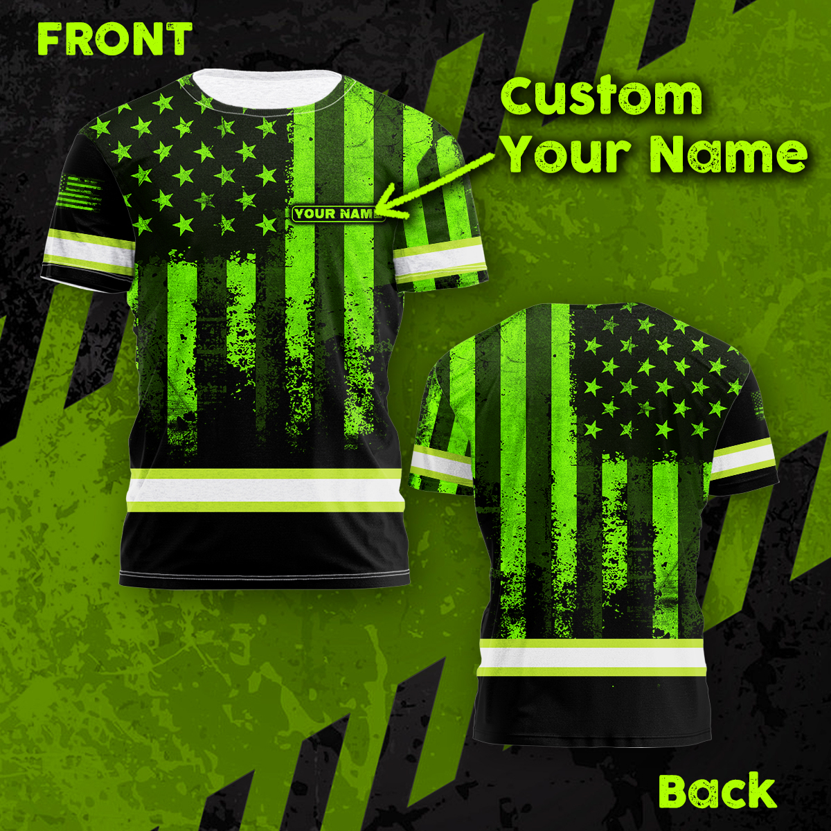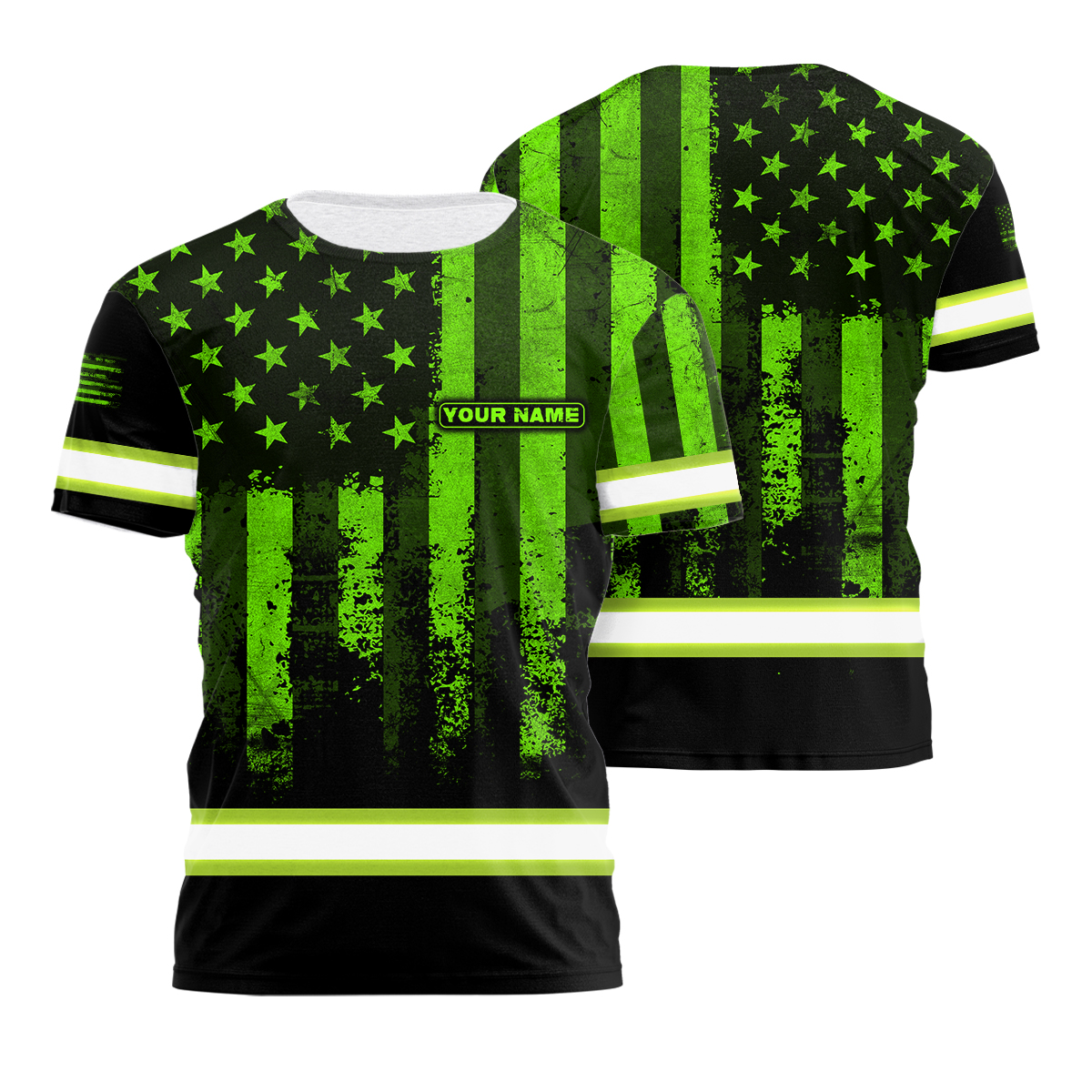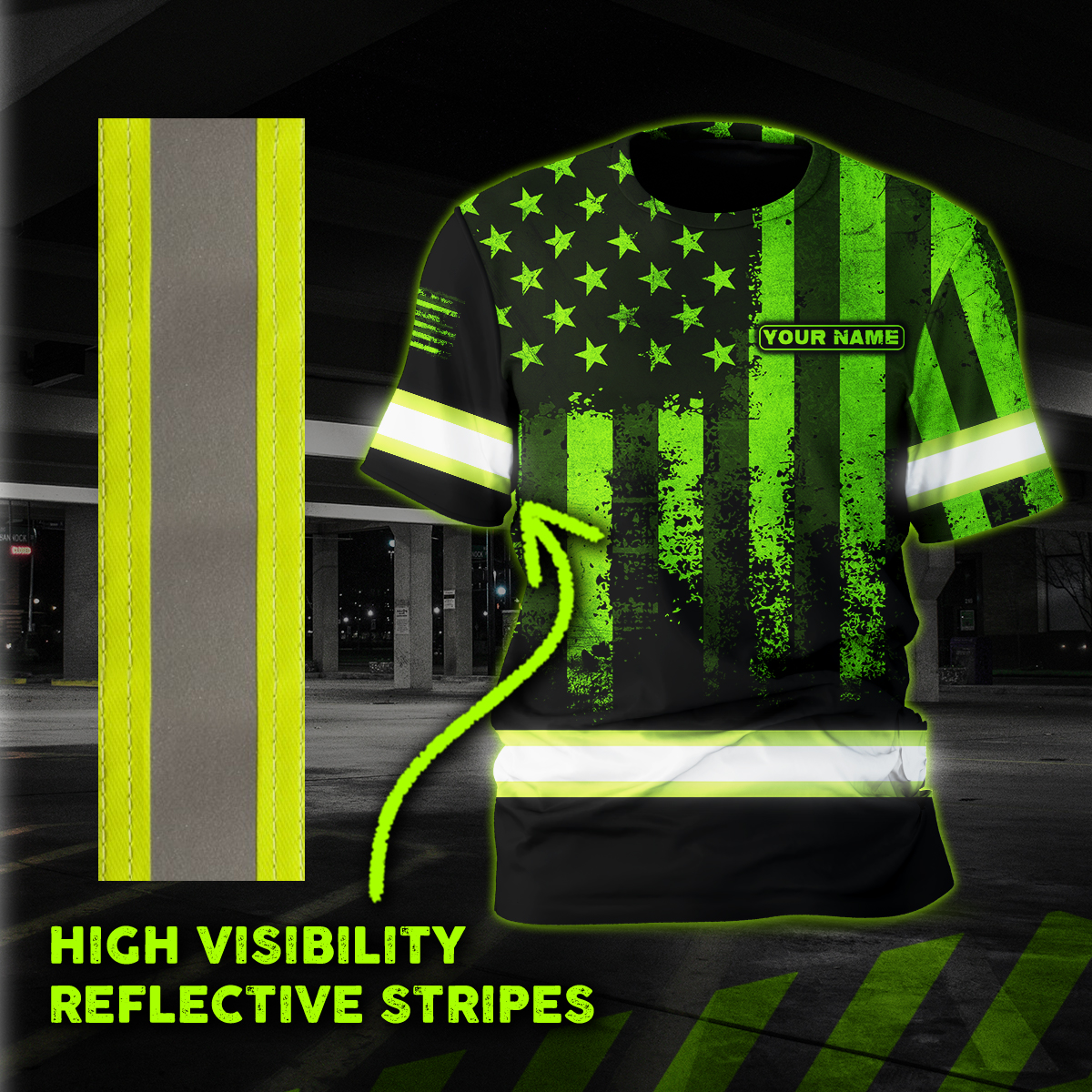 Hi Vis Shirt Reflective Flag USA Custom Name Safety Workwear For Men, Truckers, Workers, Runners, Cyclists, Patriotic