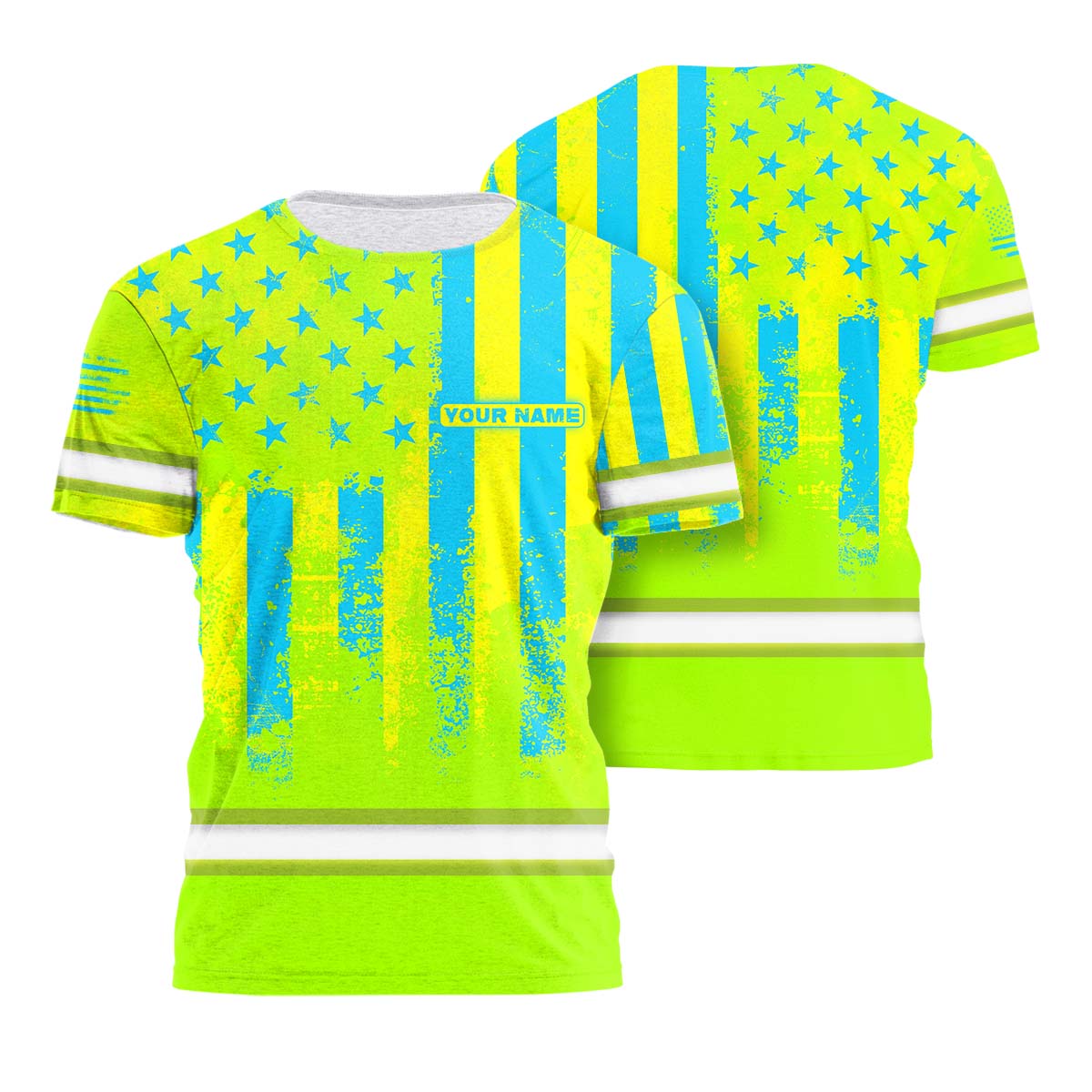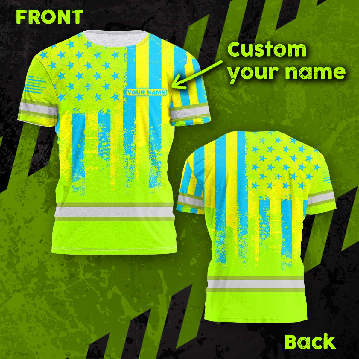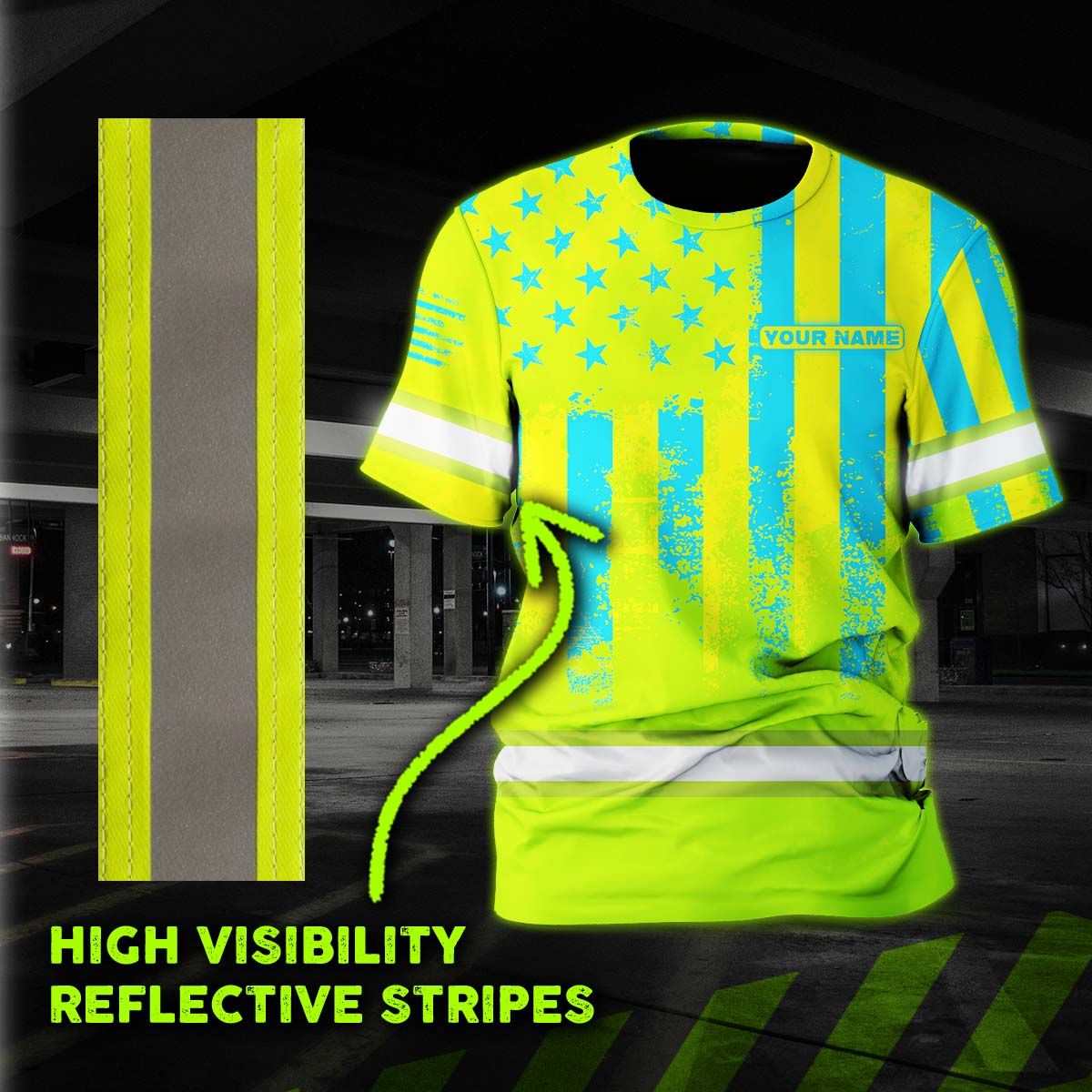 Hi Vis Shirt Reflective Flag USA Green And Blue Neon Custom Name Safety Workwear For Men, Truckers, Workers, Runners, Cyclists, Patriotic