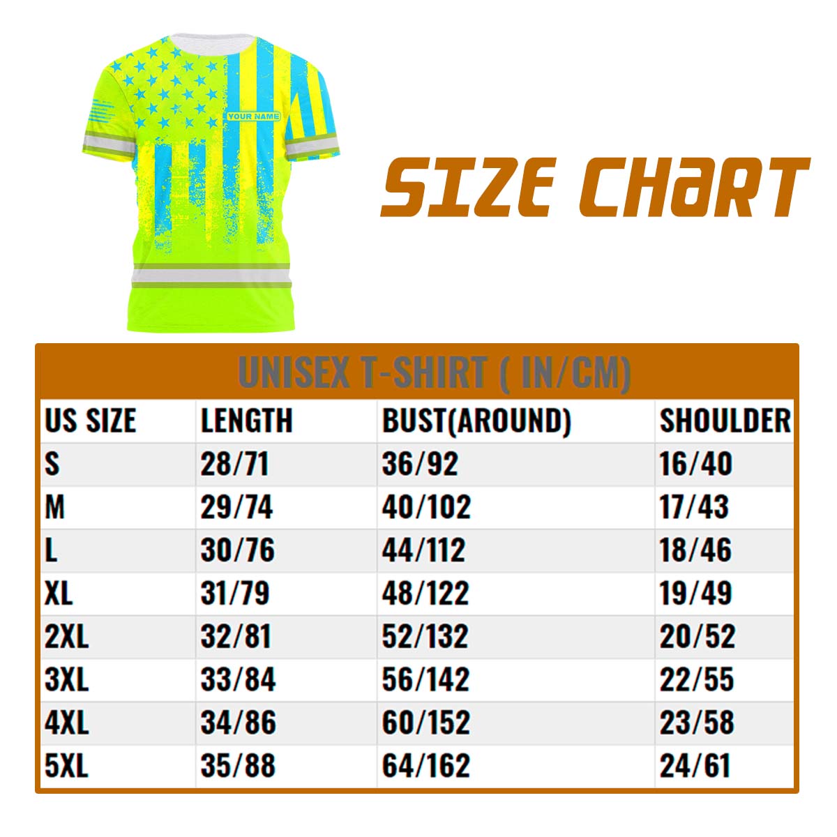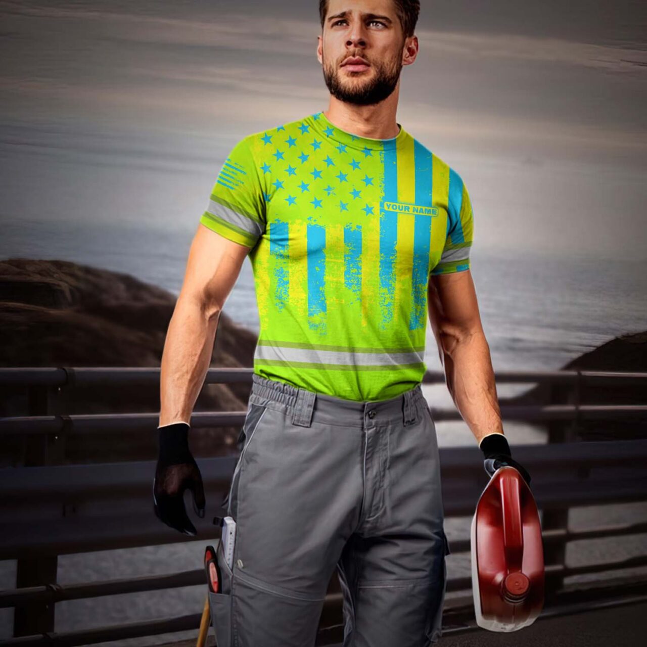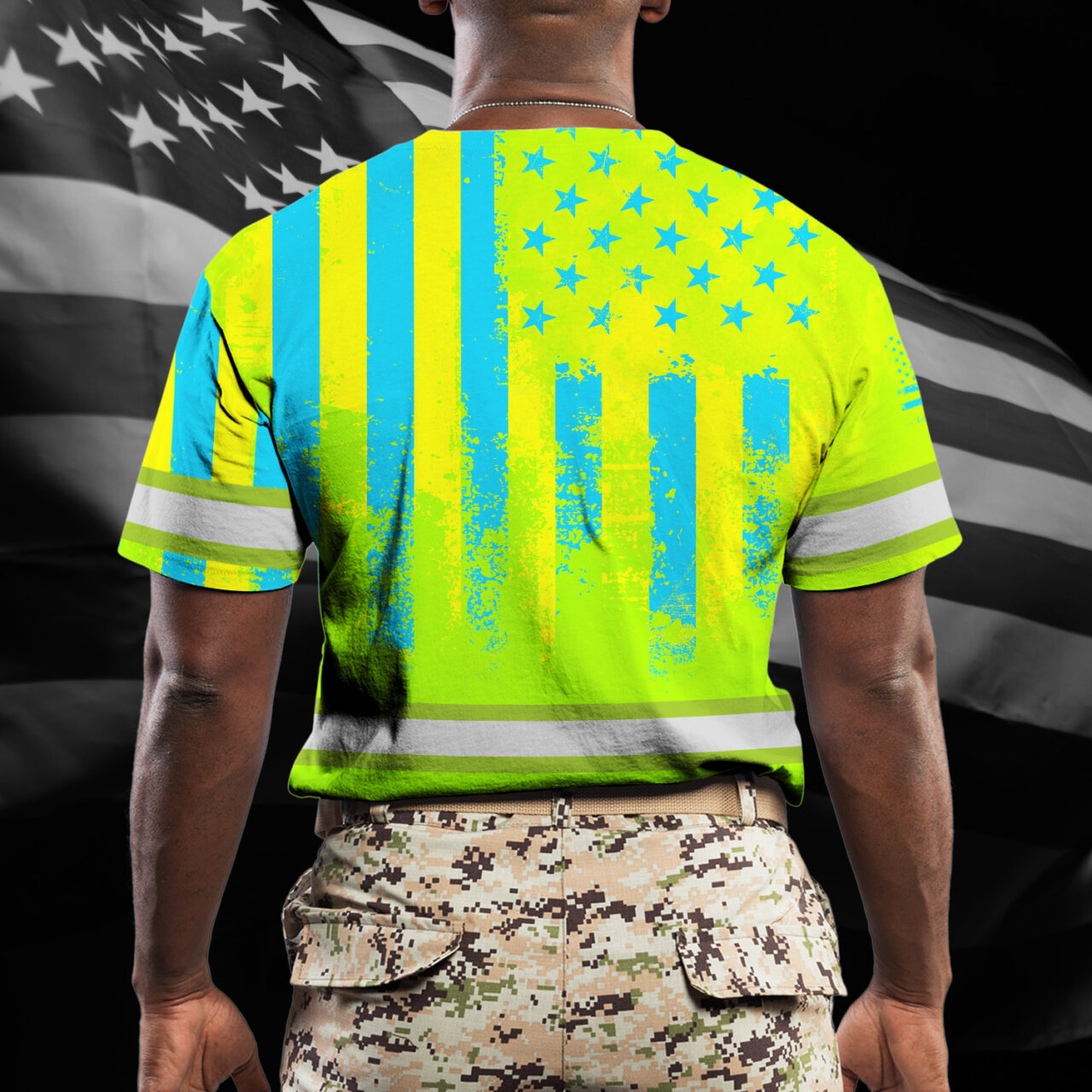 Hi Vis Shirt Reflective Flag USA Green And Blue Neon Custom Name Safety Workwear For Men, Truckers, Workers, Runners, Cyclists, Patriotic