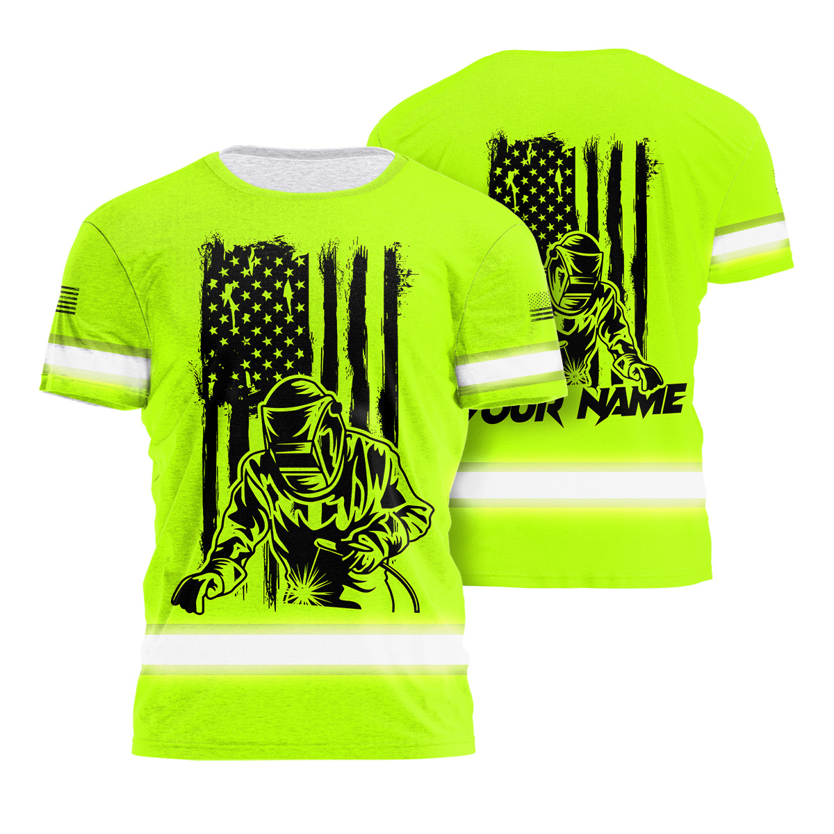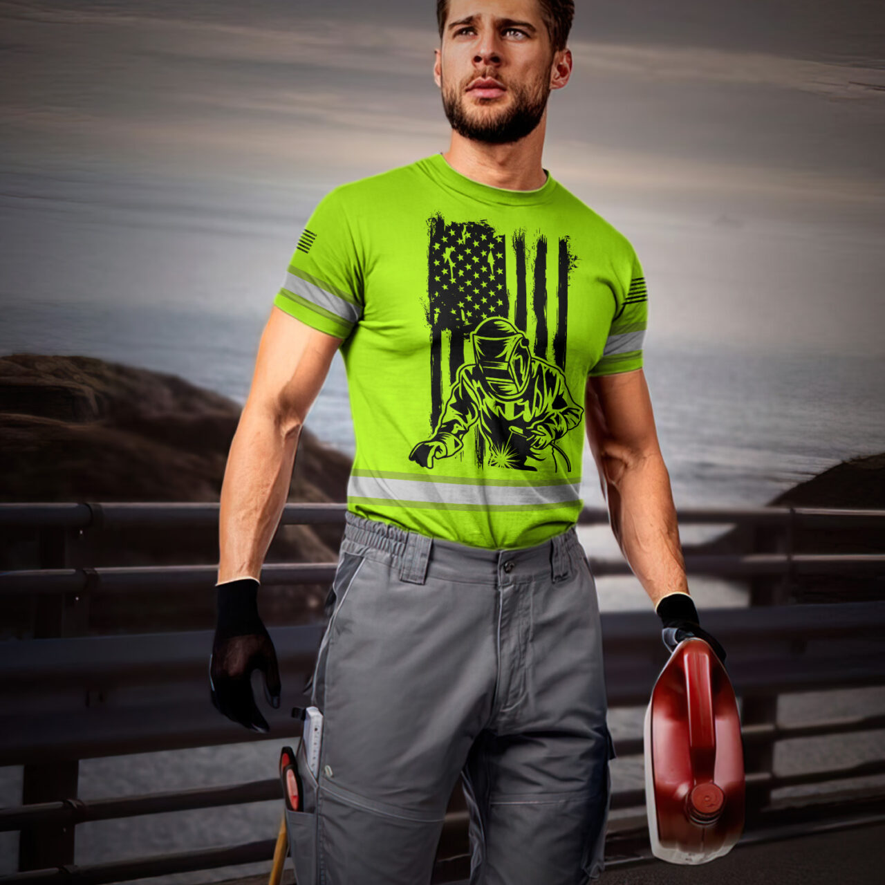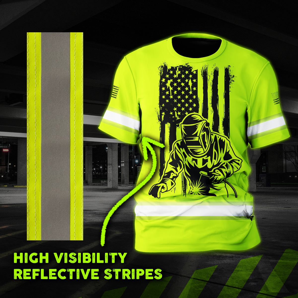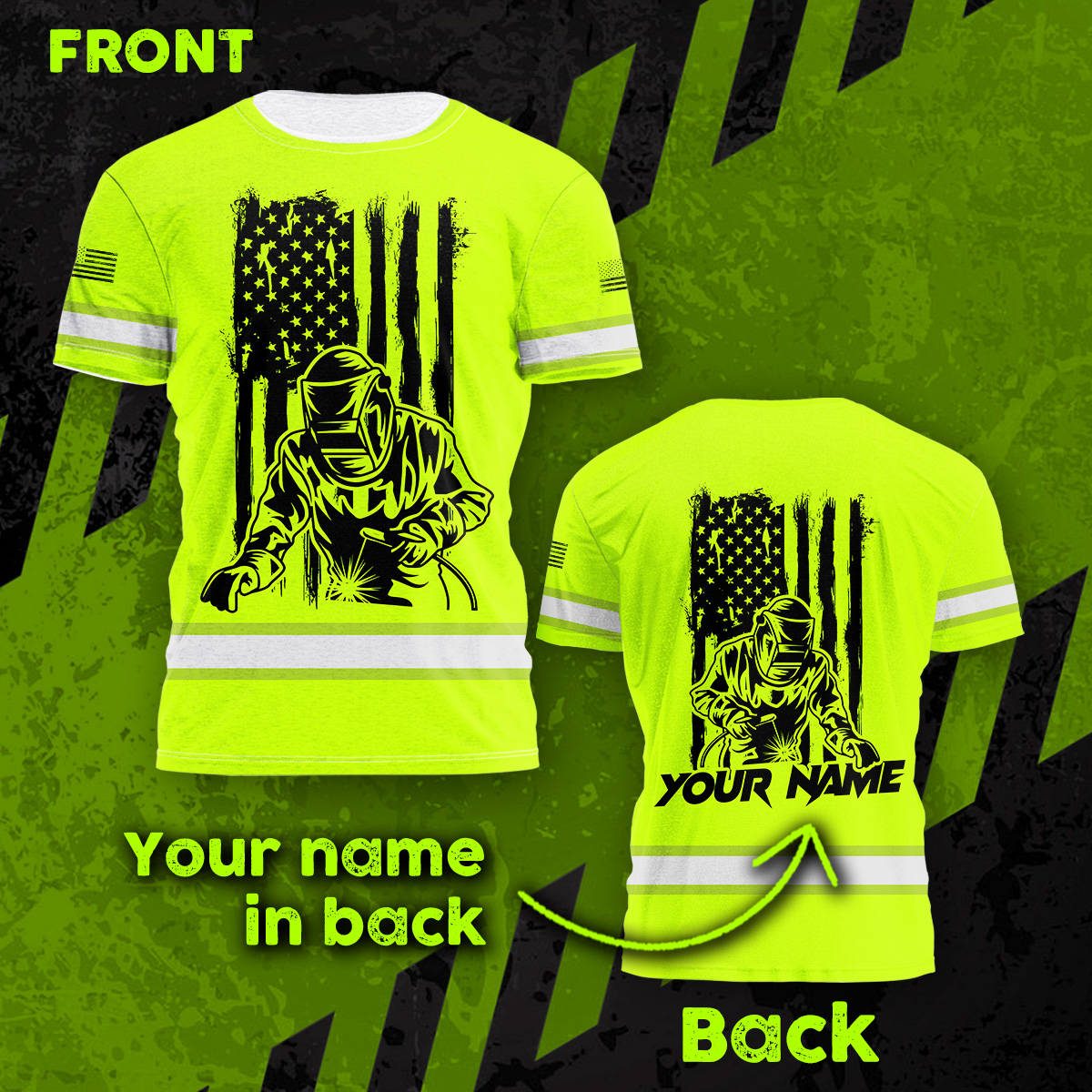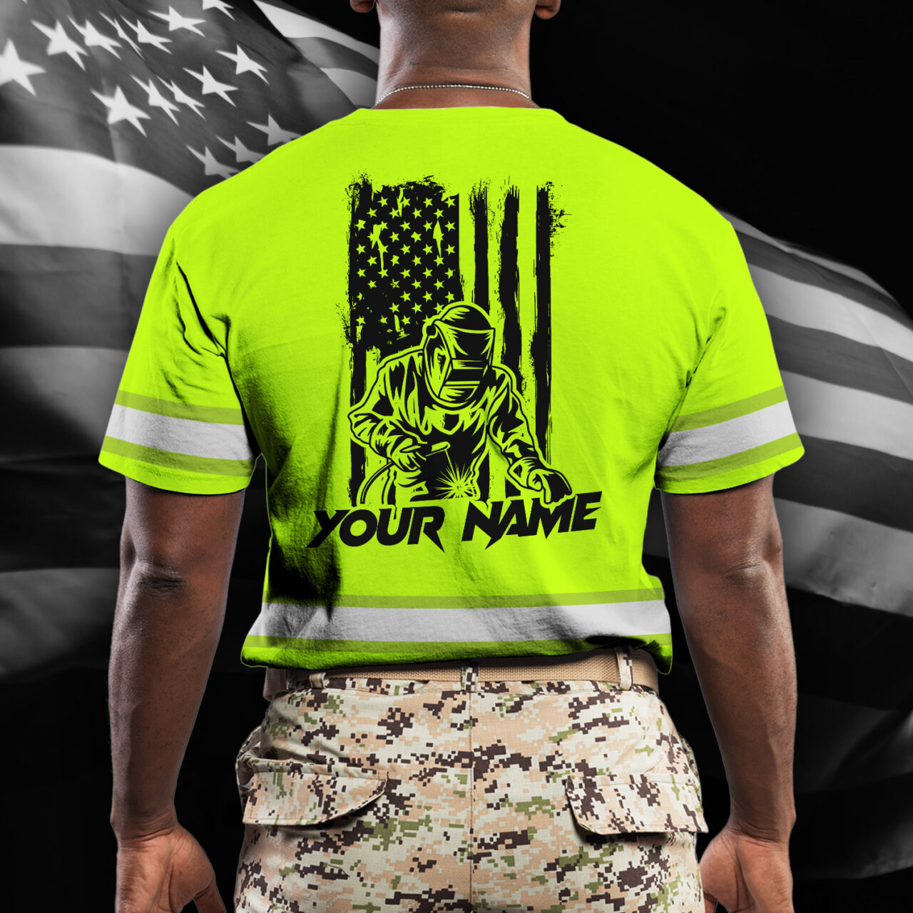 Hi Vis Shirt Reflective Flag Welder Custom Name Safety Workwear For Workers, Operator, Cyclists, Patriotic