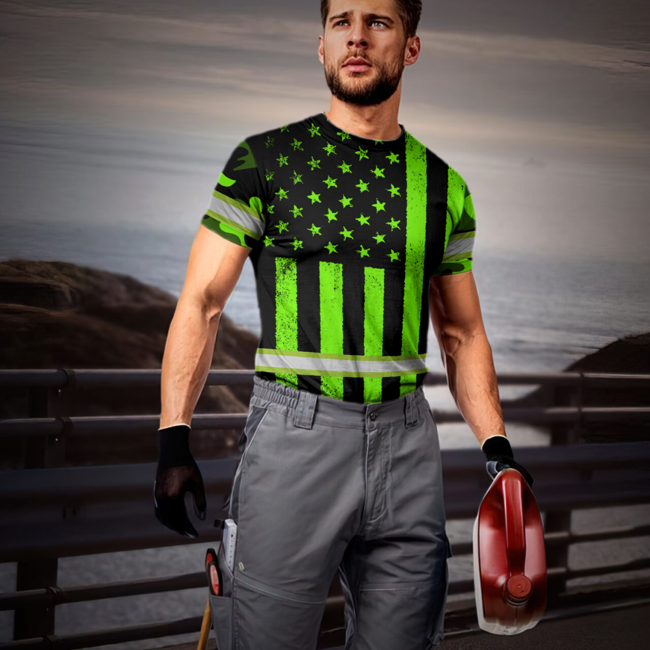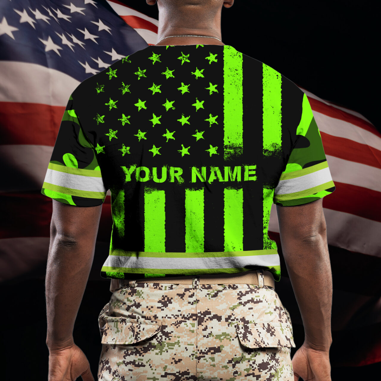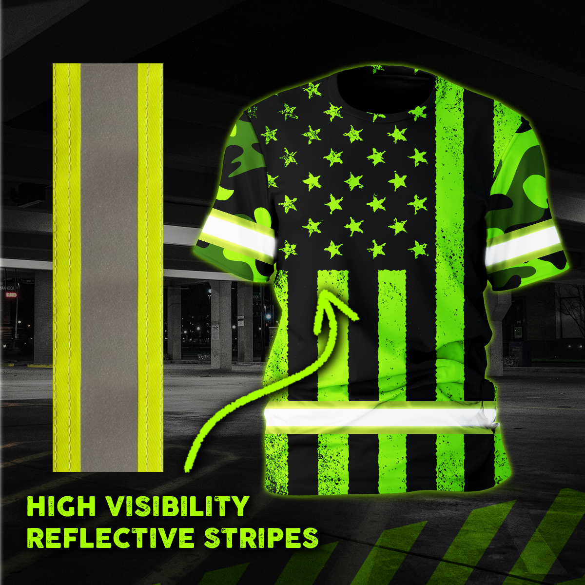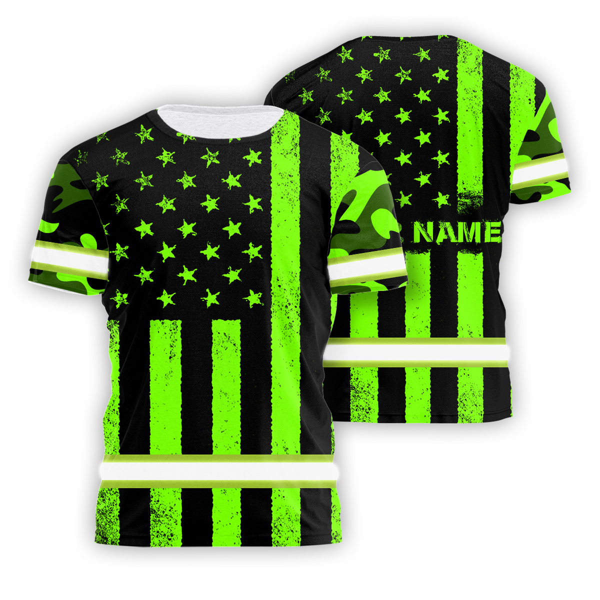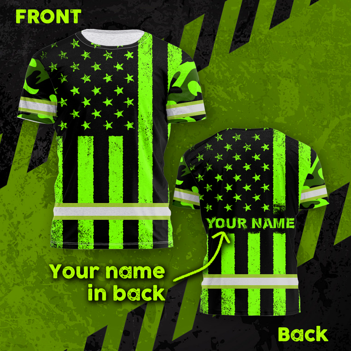 Hi Vis Shirt Reflective Green Camo US Flag Custom Name Safety Workwear For Workers, Runners, Cyclists, Trucker, Operator, Patriotic
