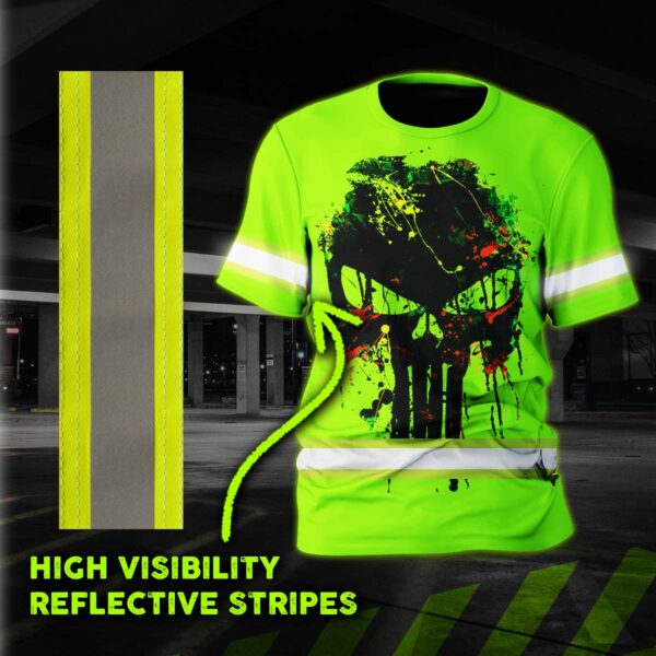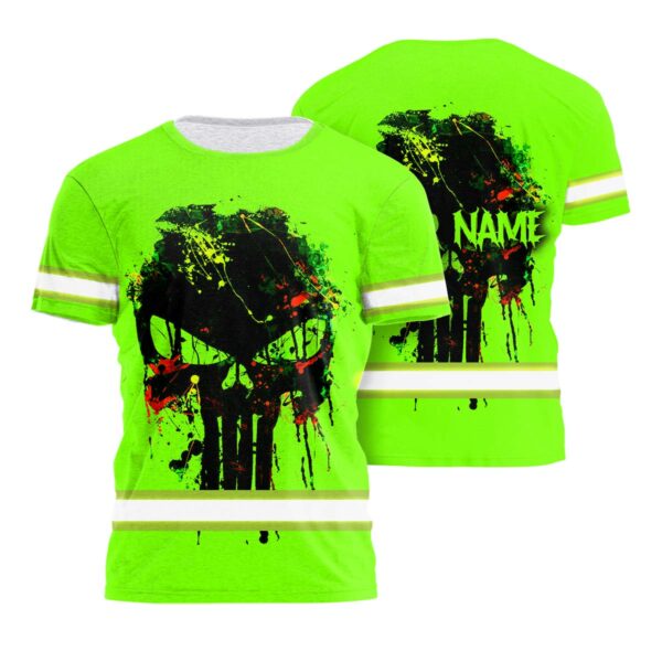 Hi Vis Shirt Reflective Green Neon Paint Plash Skull Custom Name Safety Workwear For Truckers, Workers, Runners, Cyclists, Patriotic quantity