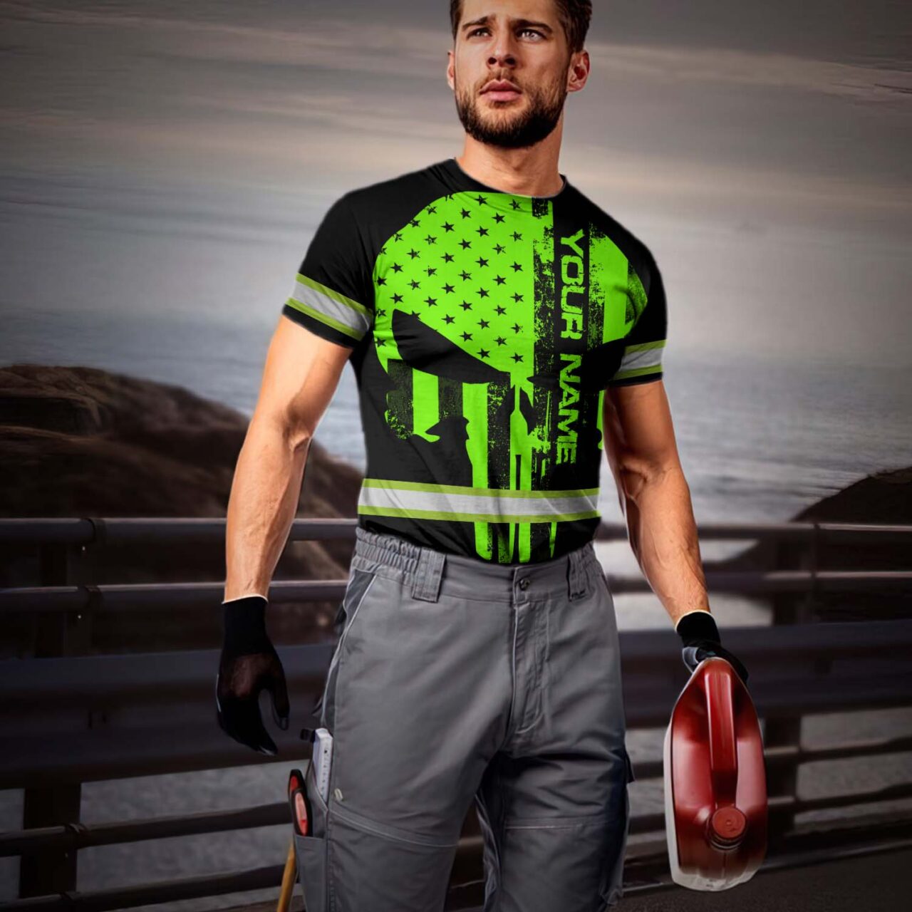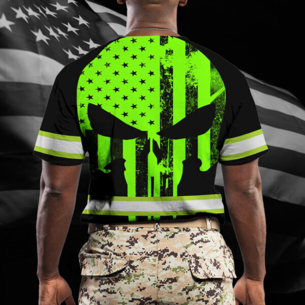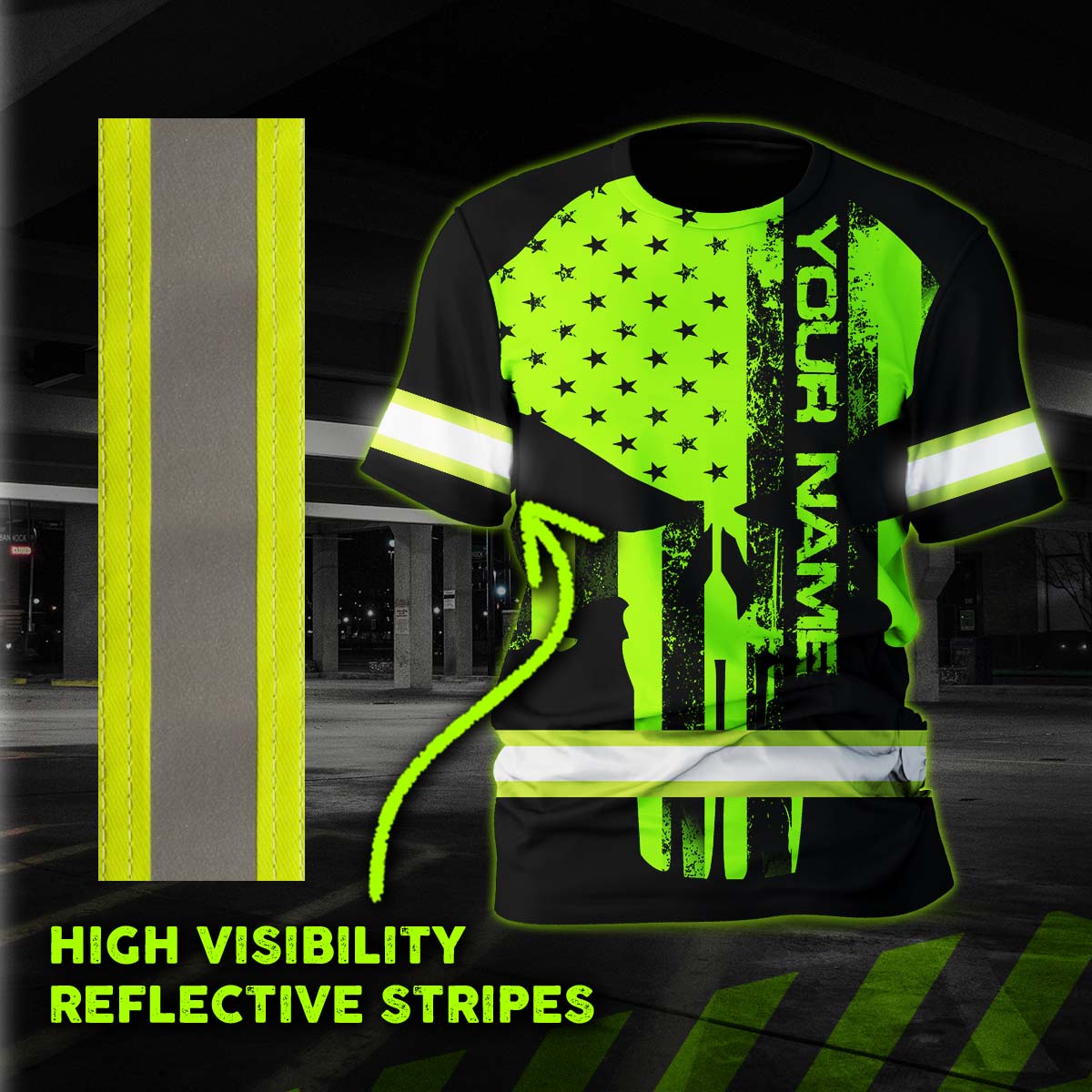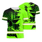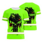 Hi Vis Shirt Reflective Green Neon Paint Plash Skull Custom Name Safety Workwear For Truckers, Workers, Runners, Cyclists, Patriotic