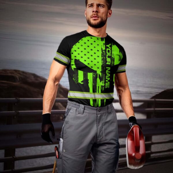 Hi Vis Shirt Reflective Green Neon Skull US Flag Scratch Custom Name Safety Workwear For Workers, Runners, Cyclists, Trucker, Operator, Patriotic