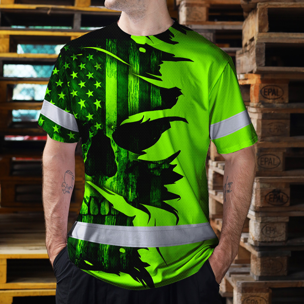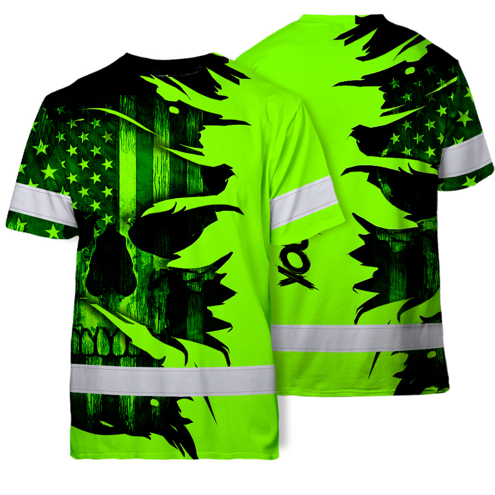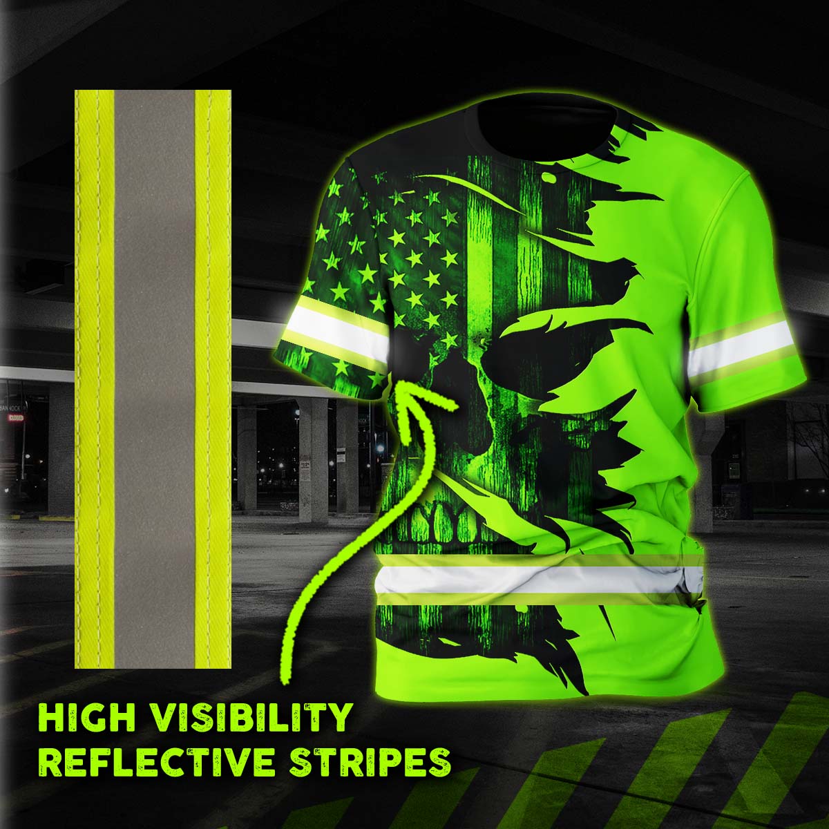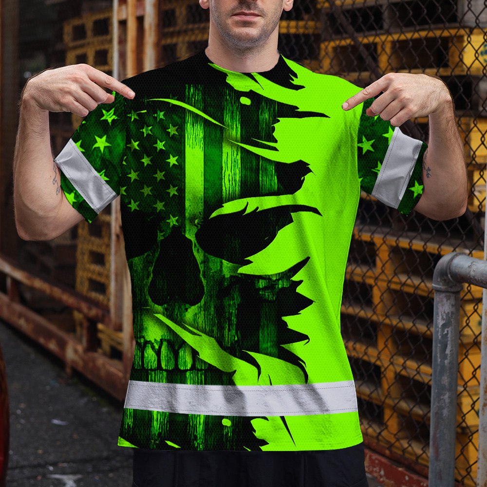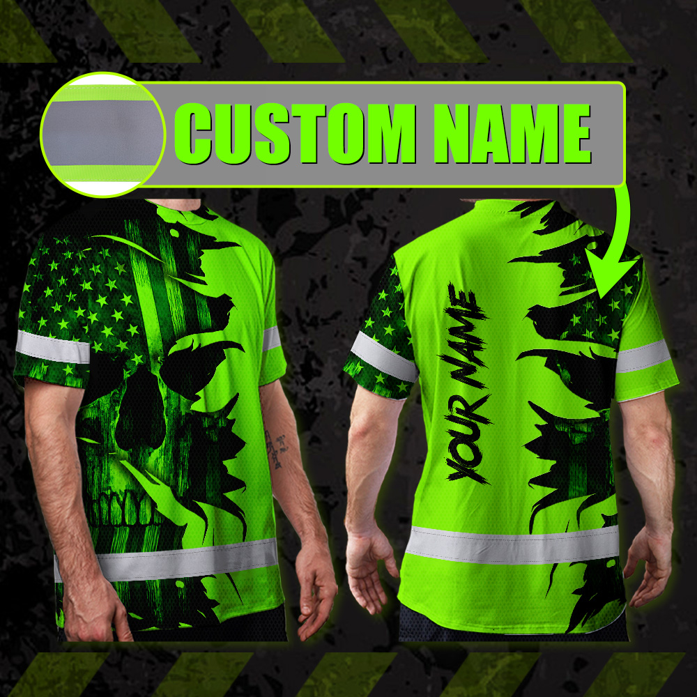 Hi Vis Shirt Reflective Green Neon Skull US Flag Scratch Custom Name Safety Workwear For Workers, Runners, Cyclists, Trucker, Operator, Patriotic