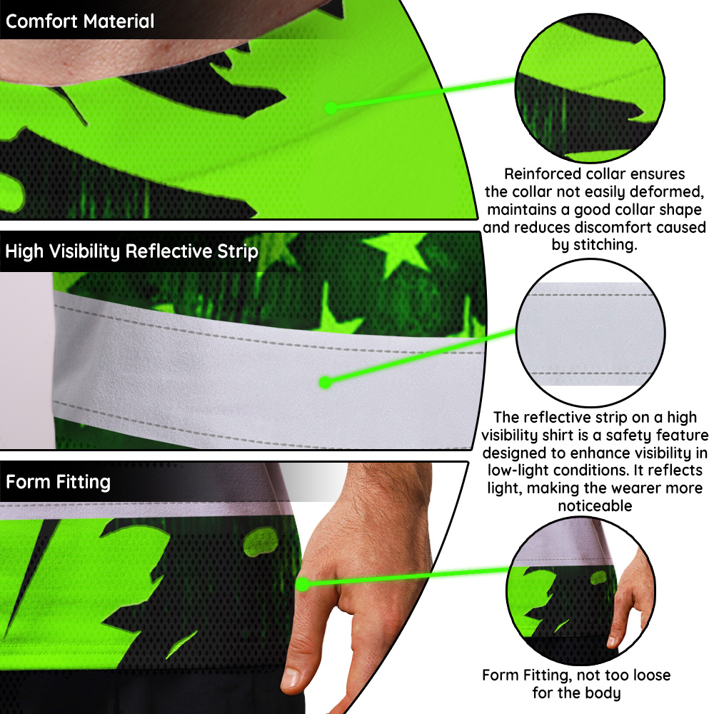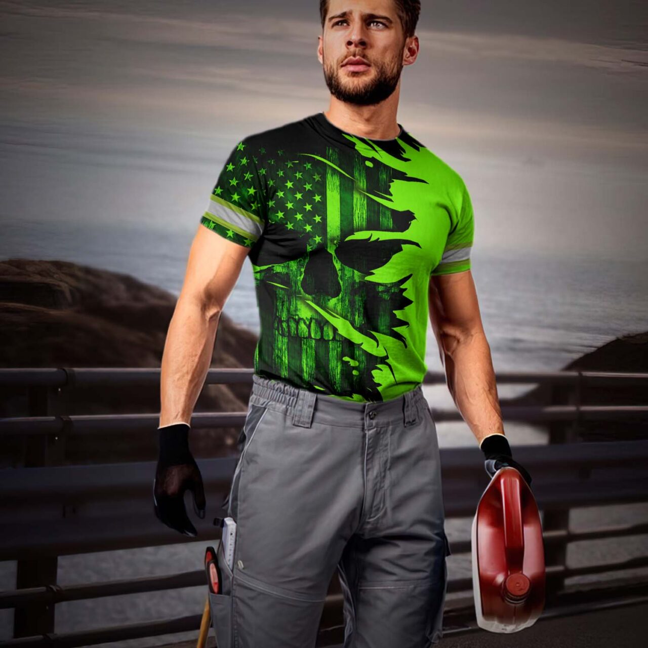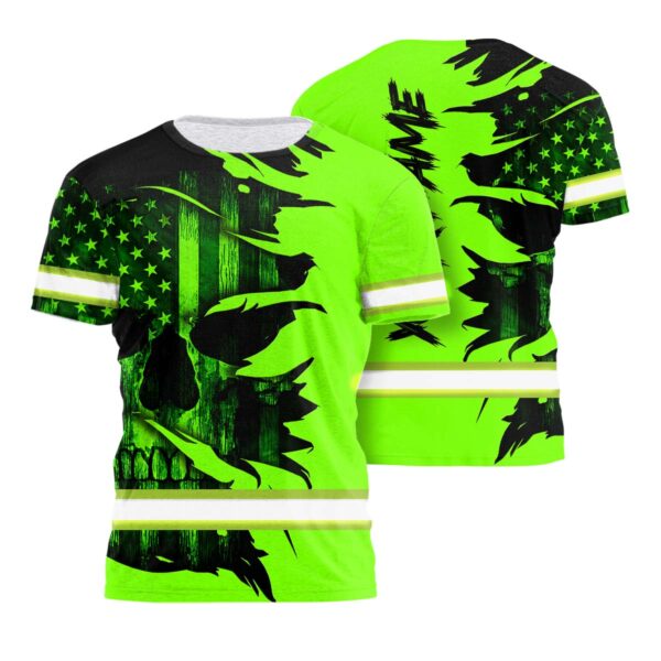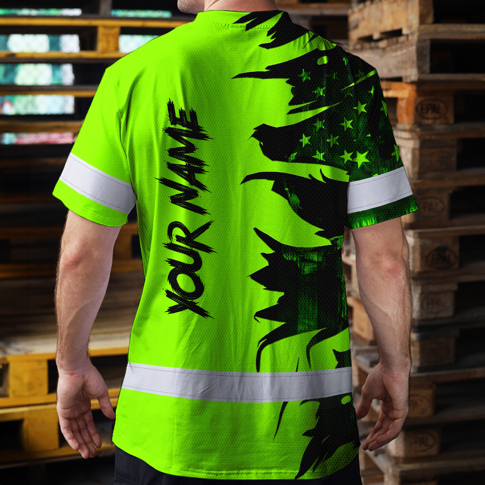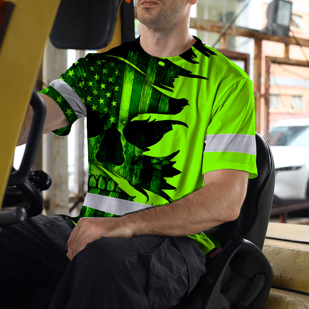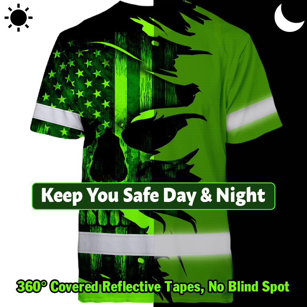 Hi Vis Shirt Reflective Green Neon Skull US Flag Scratch Custom Name Safety Workwear For Workers, Runners, Cyclists, Trucker, Operator, Patriotic