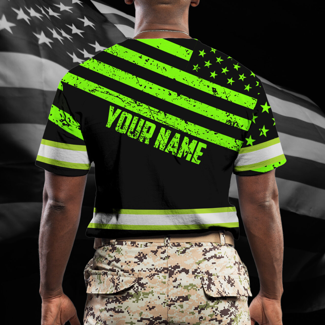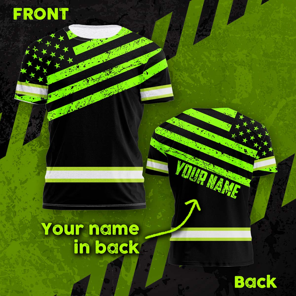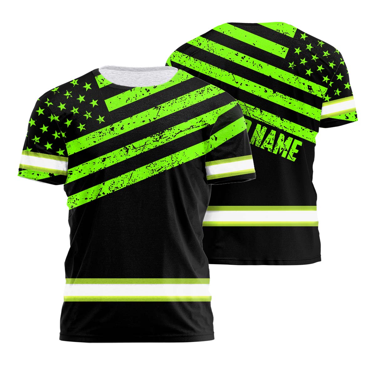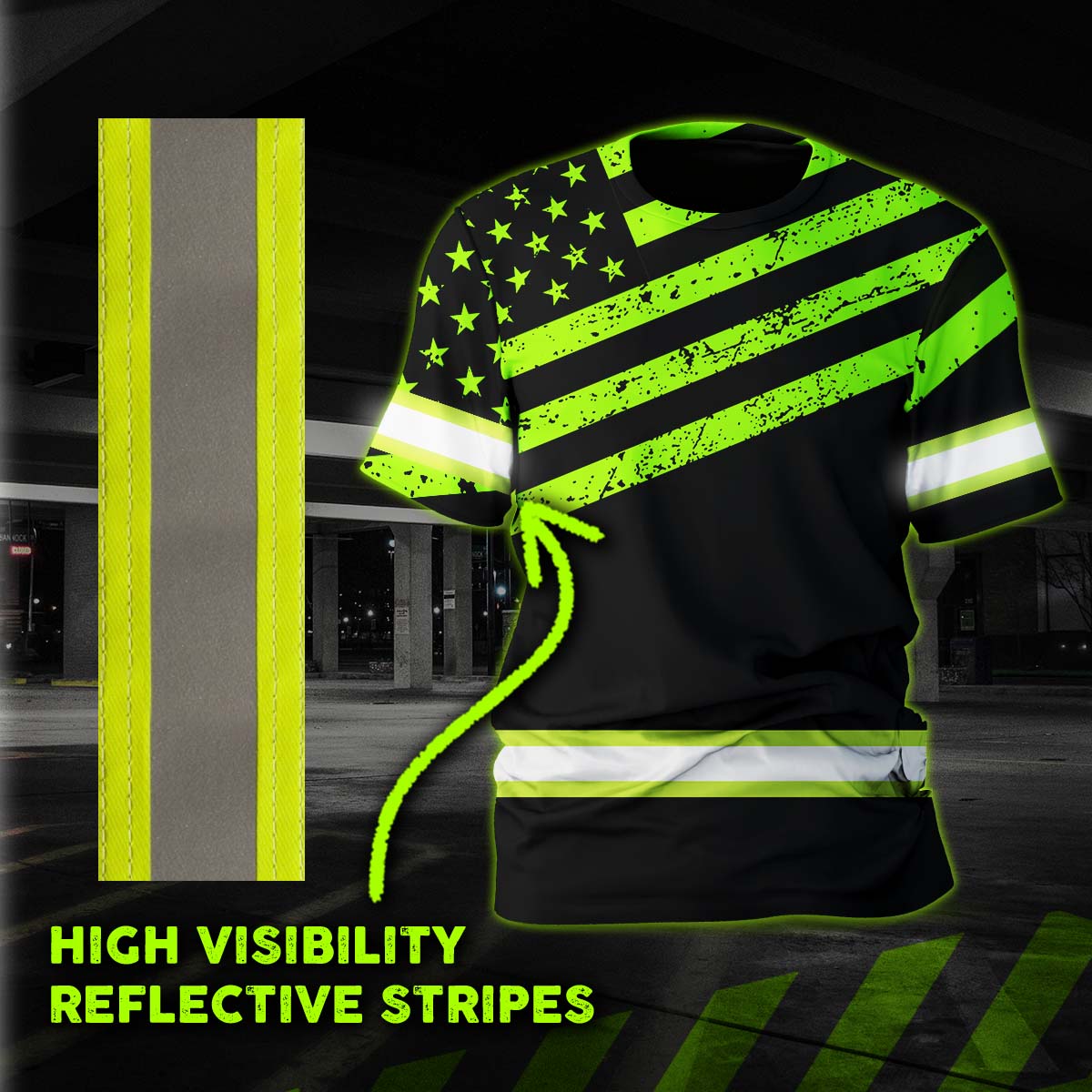 Hi Vis Shirt Reflective Green Neon US Flag Scratch Custom Name Safety Workwear For Workers, Runners, Cyclists, Trucker, Operator, Patriotic
