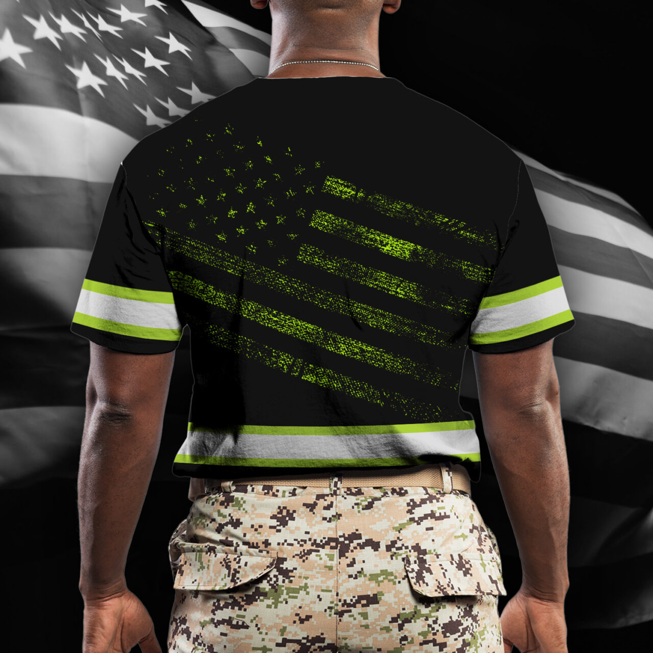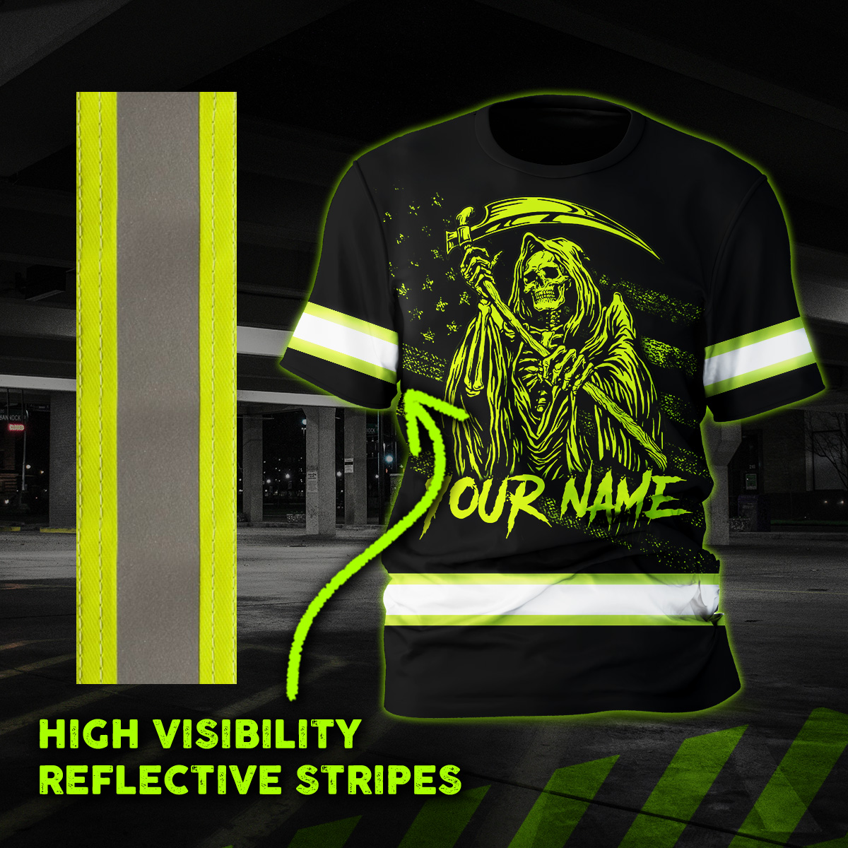 Hi Vis Shirt Reflective Neon Reaper USA Flag Custom Name Safety Workwear For Workers, Runners, Cyclists, Patriotic, Veteran, Military Description