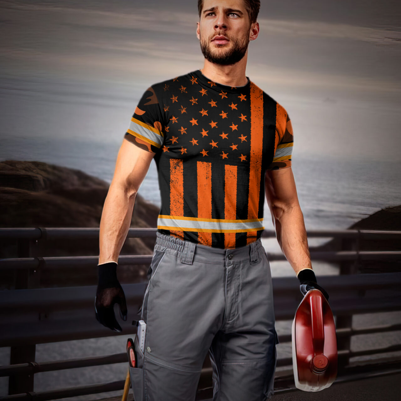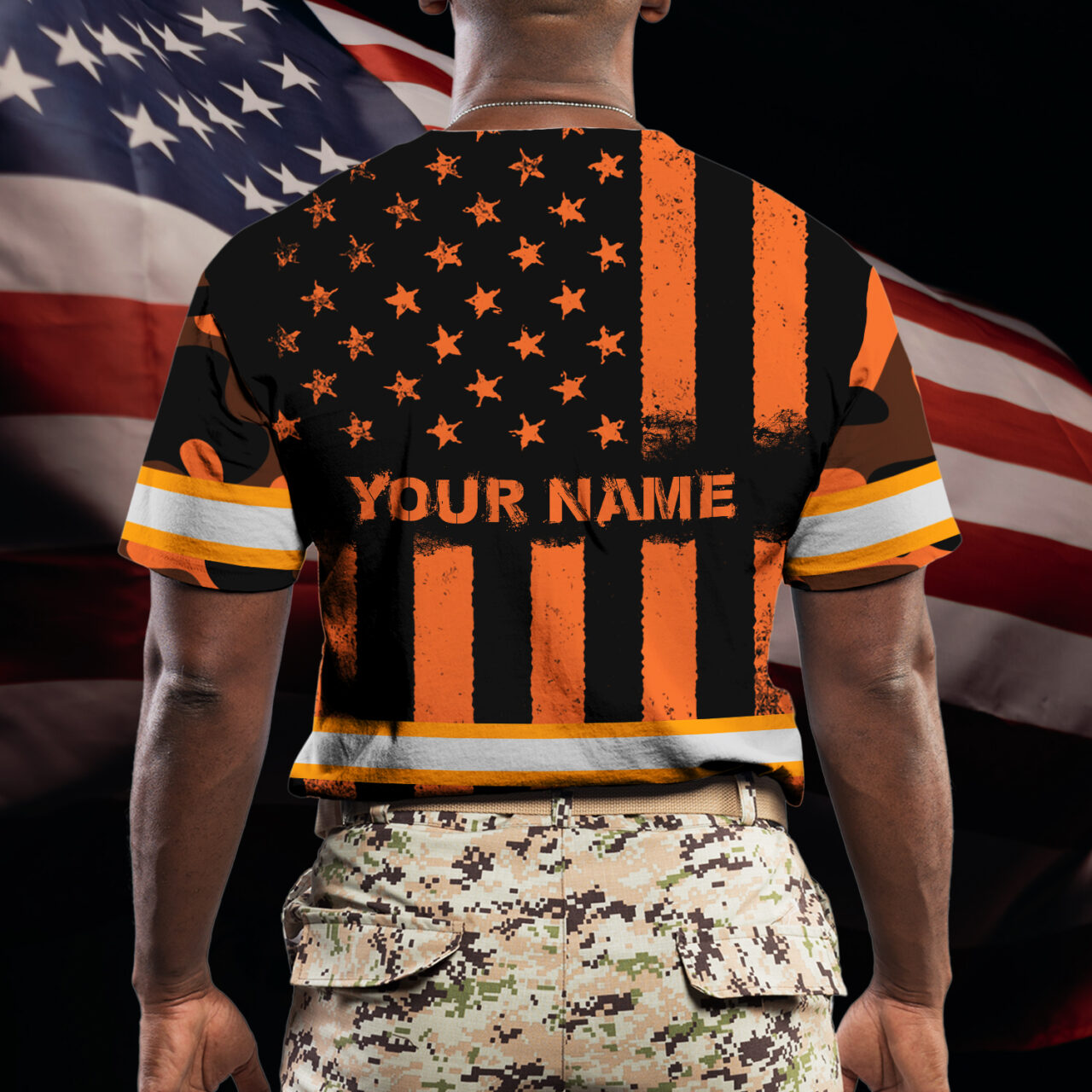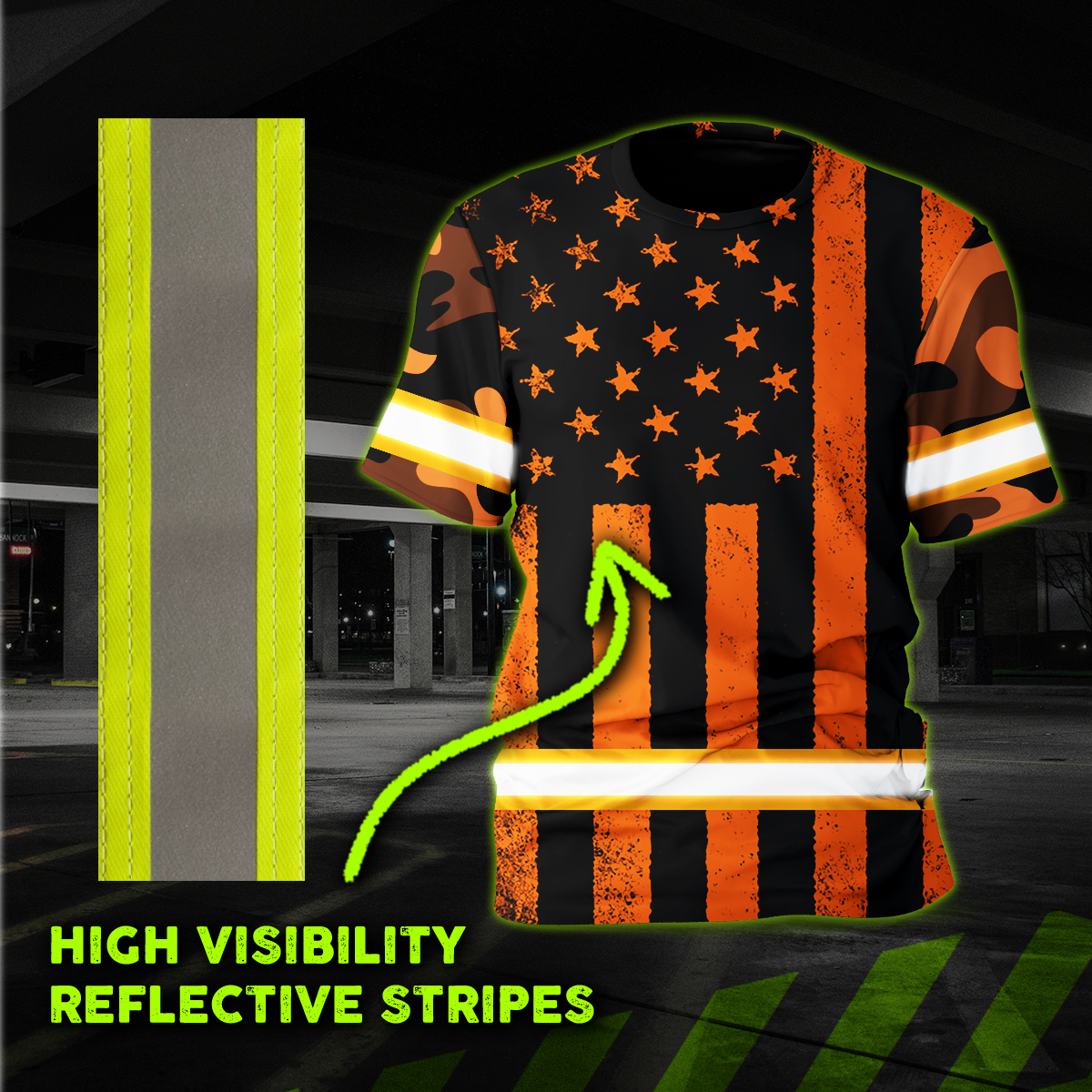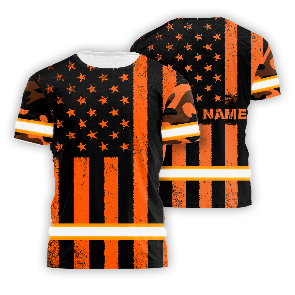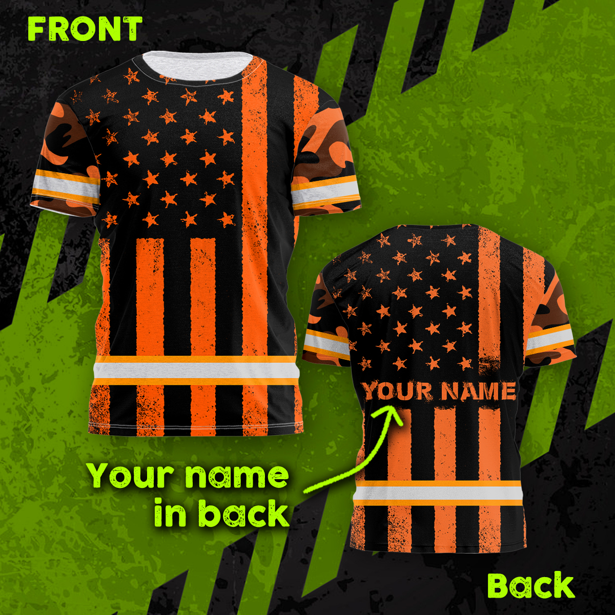 Hi Vis Shirt Reflective Orange Camo US Flag Custom Name Safety Workwear For Workers, Runners, Cyclists, Trucker, Operator, Patriotic