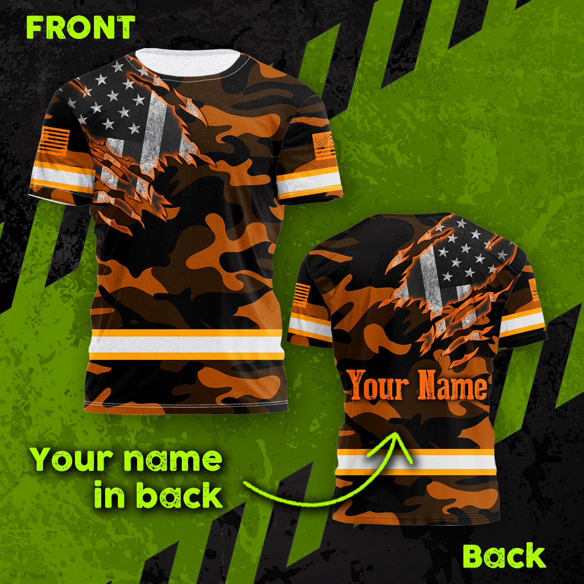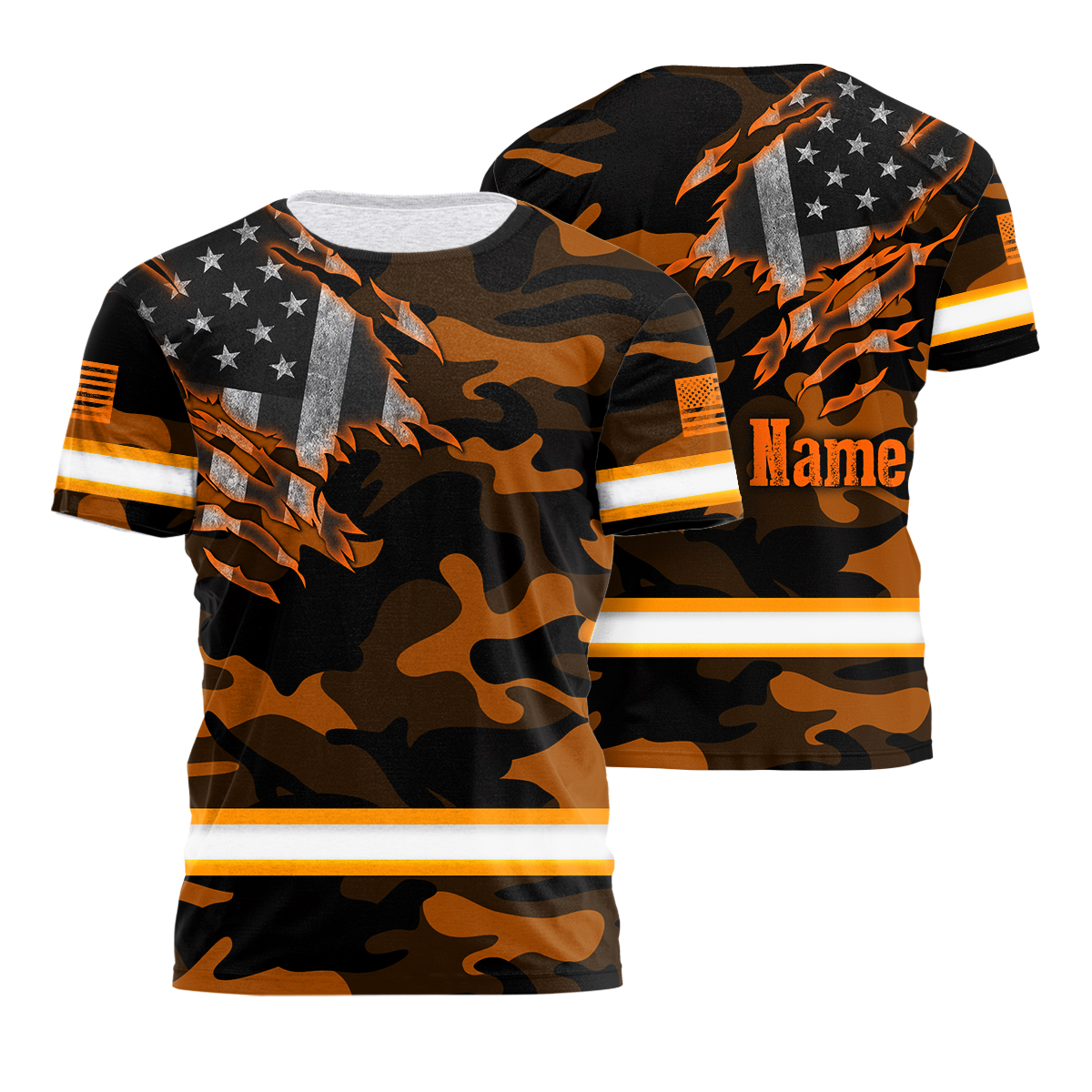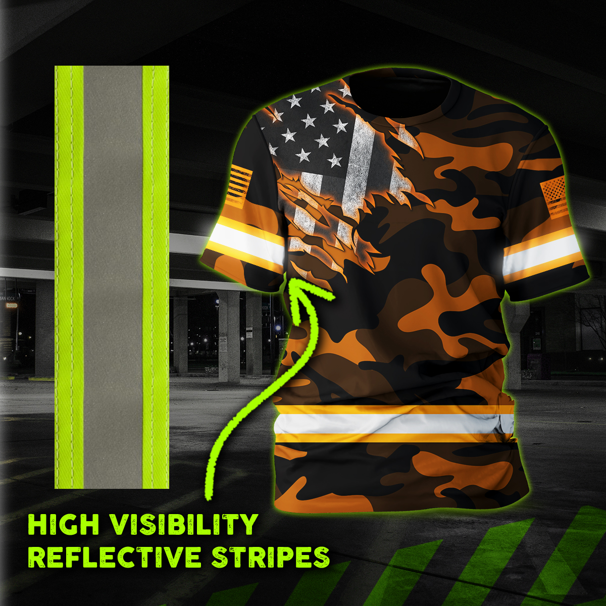 Hi Vis Shirt Reflective Scratch Camo Orange Neon US Flag Custom Name Safety Workwear For Workers, Runners, Cyclists, Trucker, Operator, Patriotic