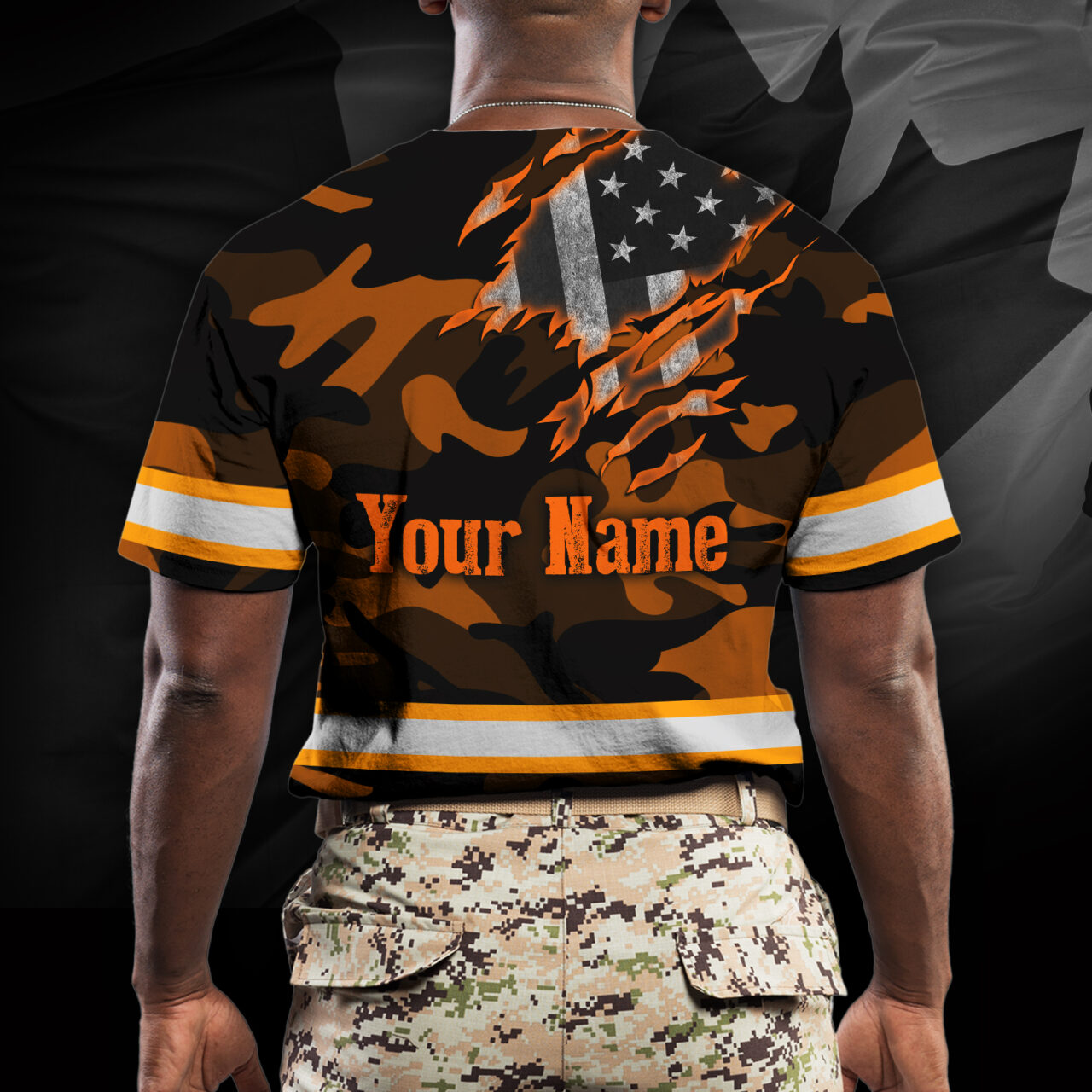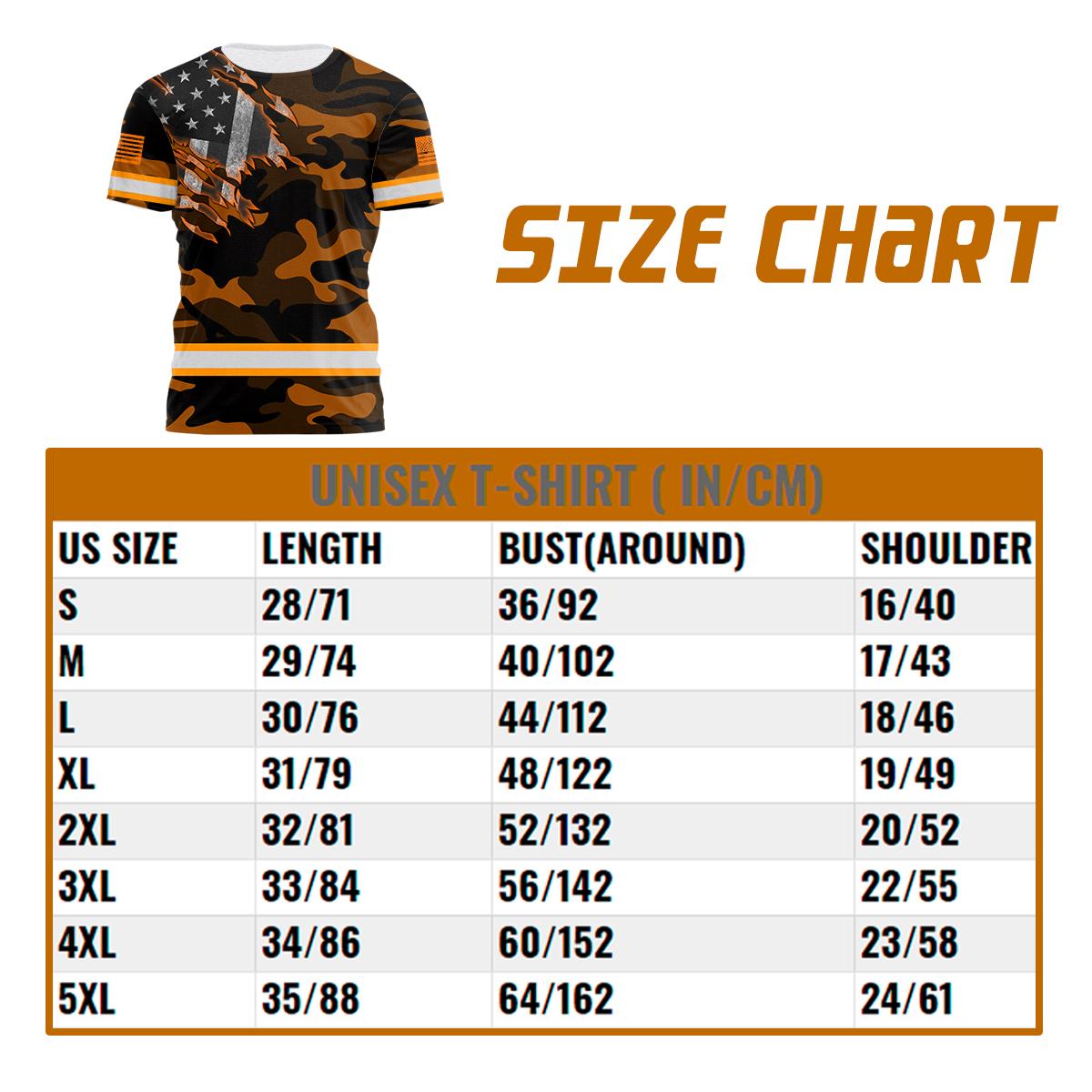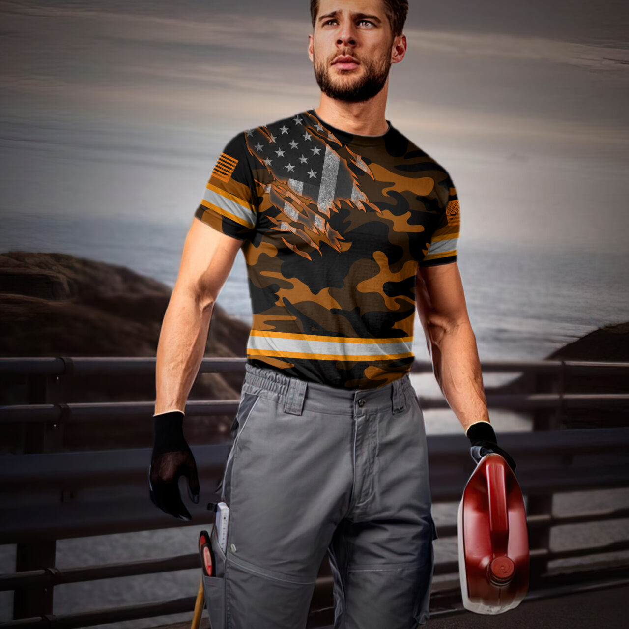 Hi Vis Shirt Reflective Scratch Camo Orange Neon US Flag Custom Name Safety Workwear For Workers, Runners, Cyclists, Trucker, Operator, Patriotic