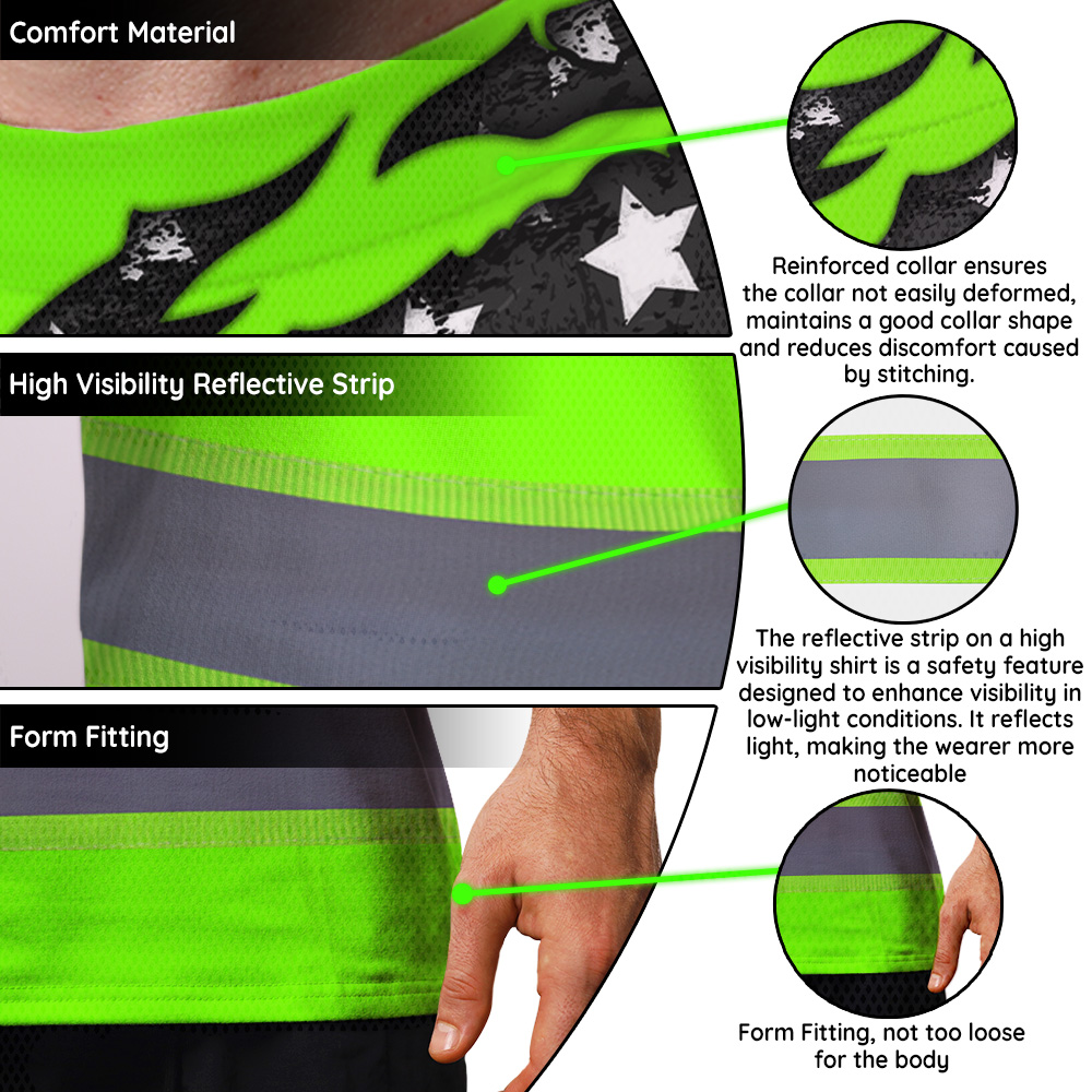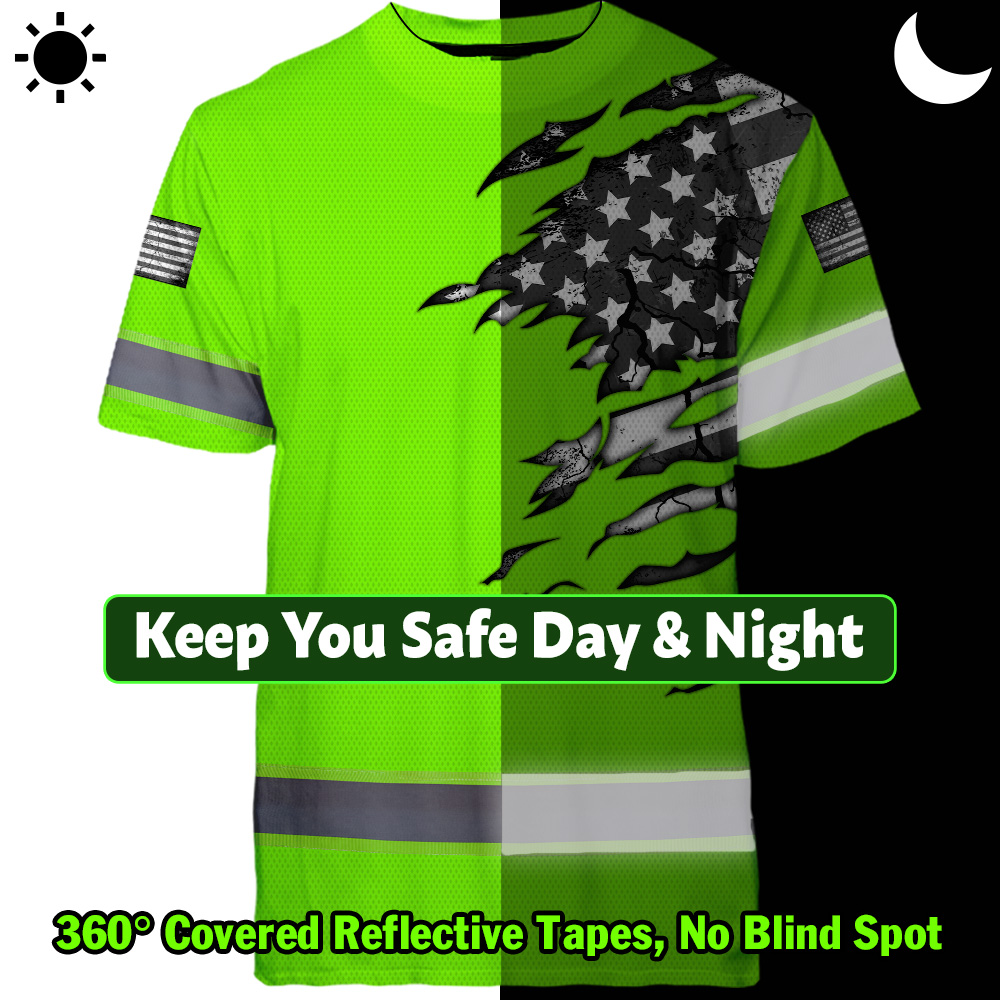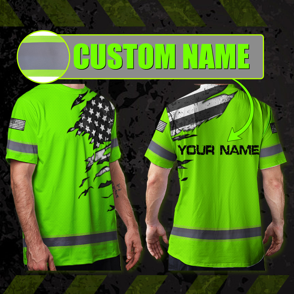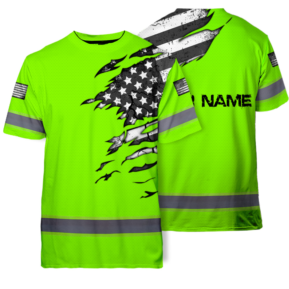 Hi Vis Shirt Reflective Scratch Green Neon US Flag Custom Name Safety Workwear For Workers, Runners, Cyclists, Trucker, Operator, Patriotic