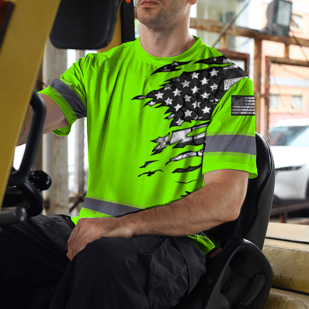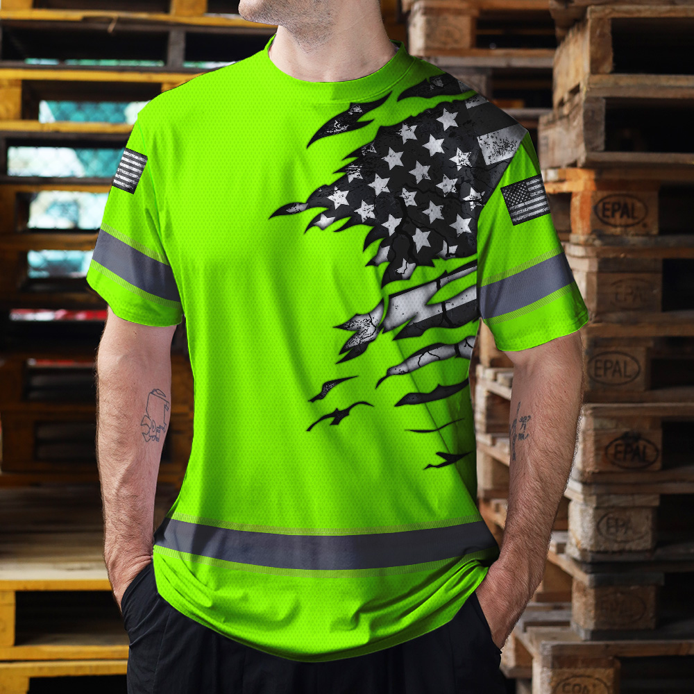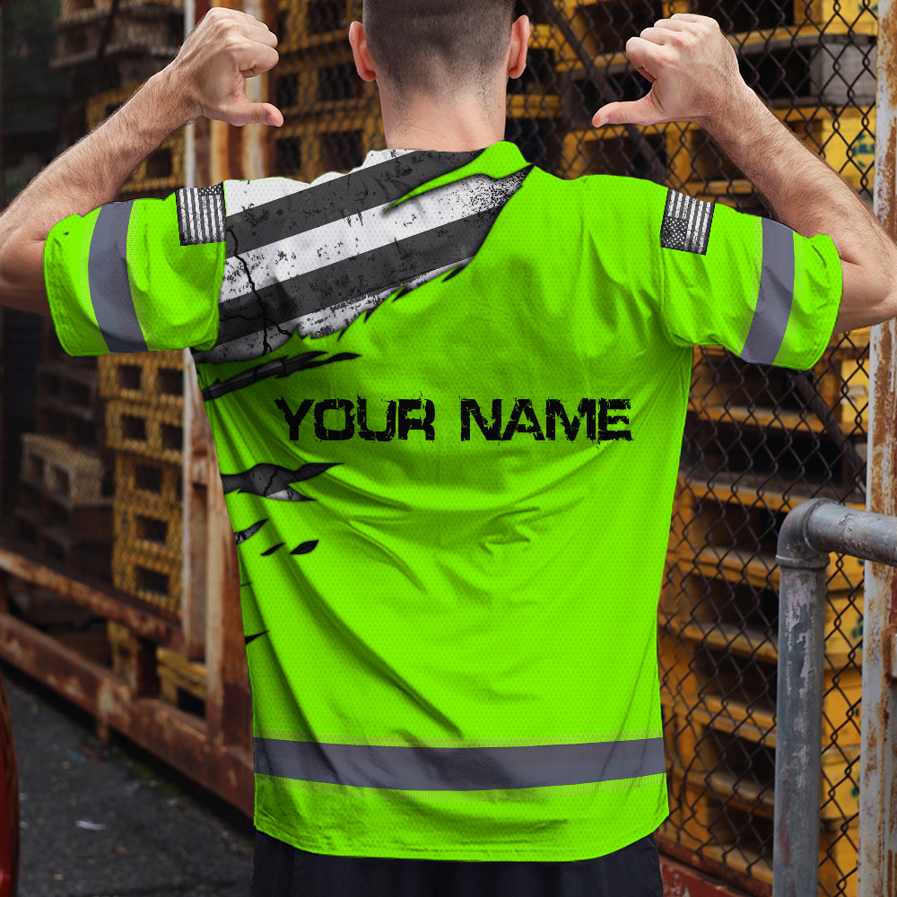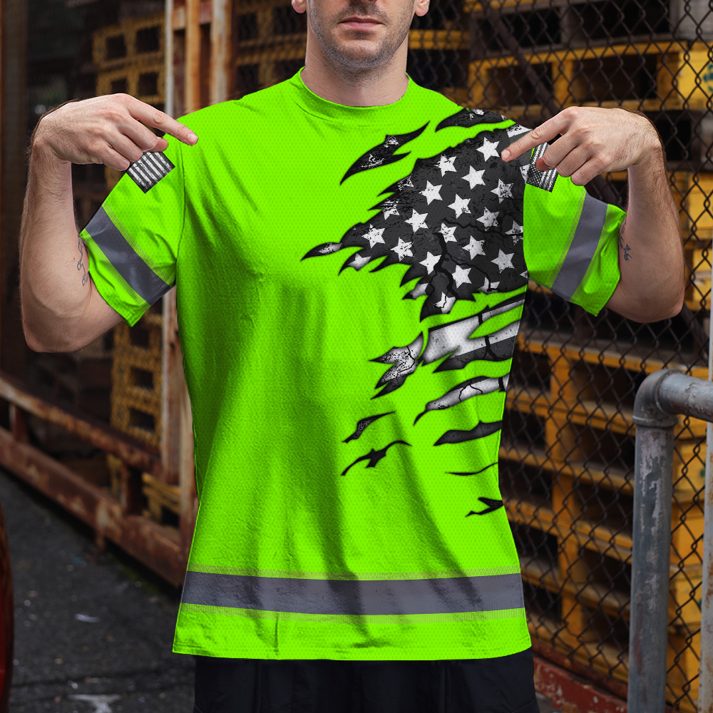 Select options This product has multiple variants. The options may be chosen on the product pageHi Vis Safety Shirts, Hi Vis Spring Workwear Favorites, Hi Vis Summer Hot Product, Hi Vis Summer Workwear Favorites, HiVis Uniform Collection Summer Sale, Summer Hot US Flag Collection, The 2026 Patriot Collection, US Flag Hi Vis Summer ProductsHi Vis Shirt Reflective Scratch Green Neon US Flag Custom Name Safety Workwear For Workers, Runners, Cyclists, Trucker, Operator, Patriotic