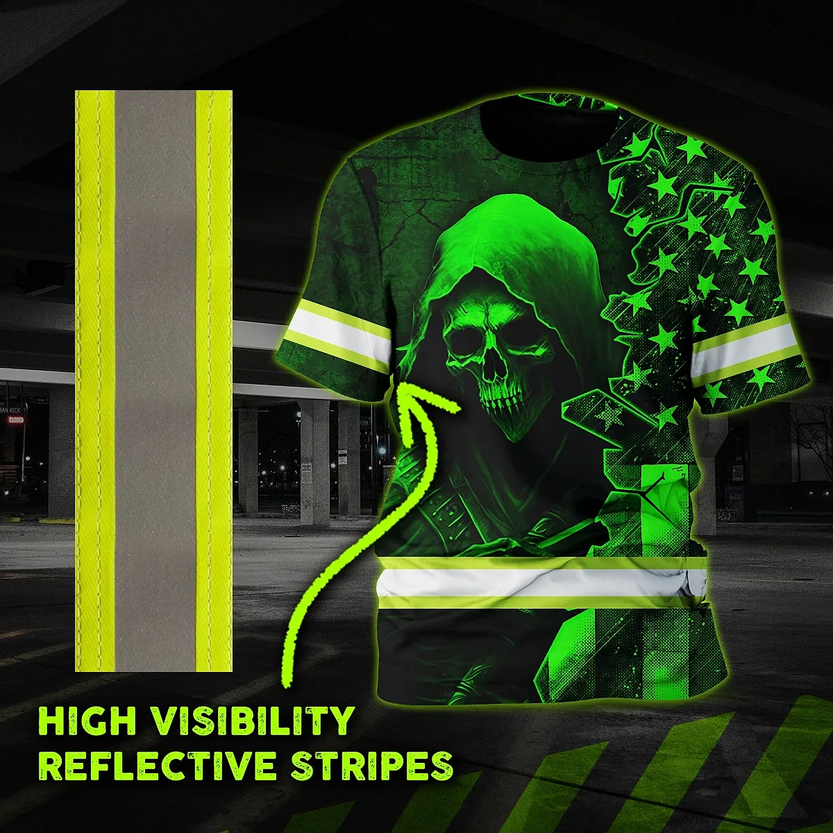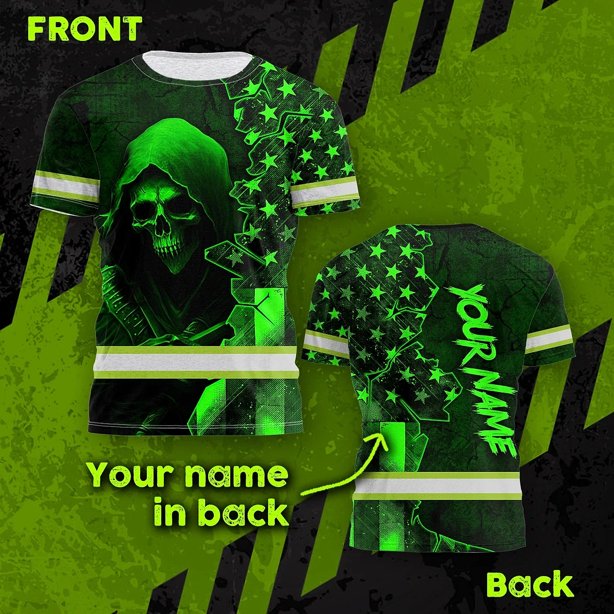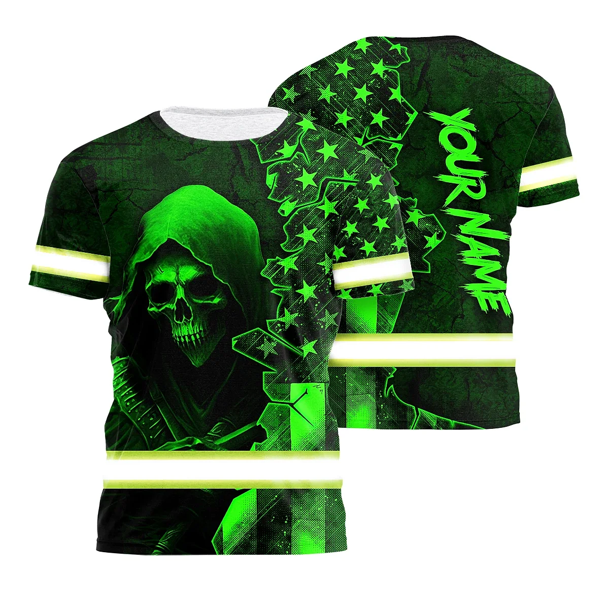 Hi Vis Shirt Reflective Skull America Flag Custom Name Safety Workwear For Workers, Truckers, Operators