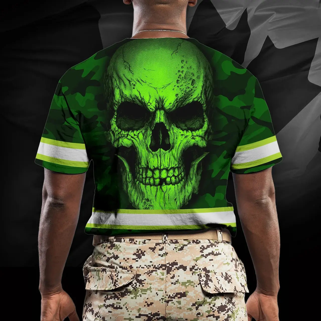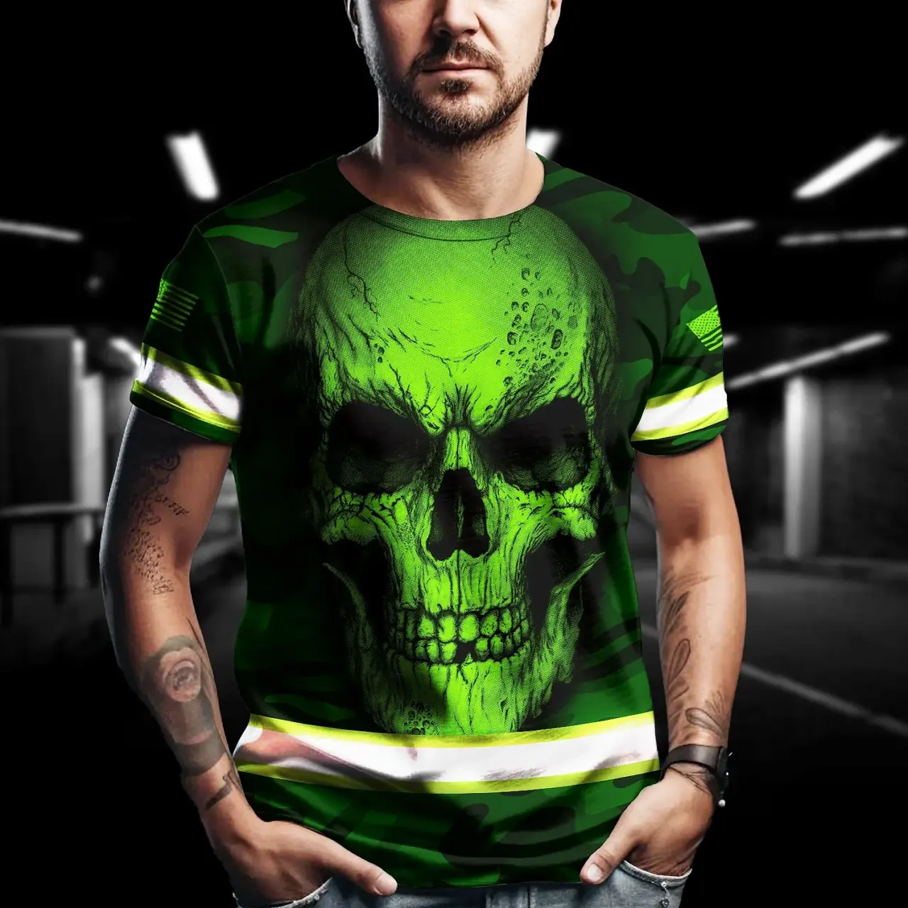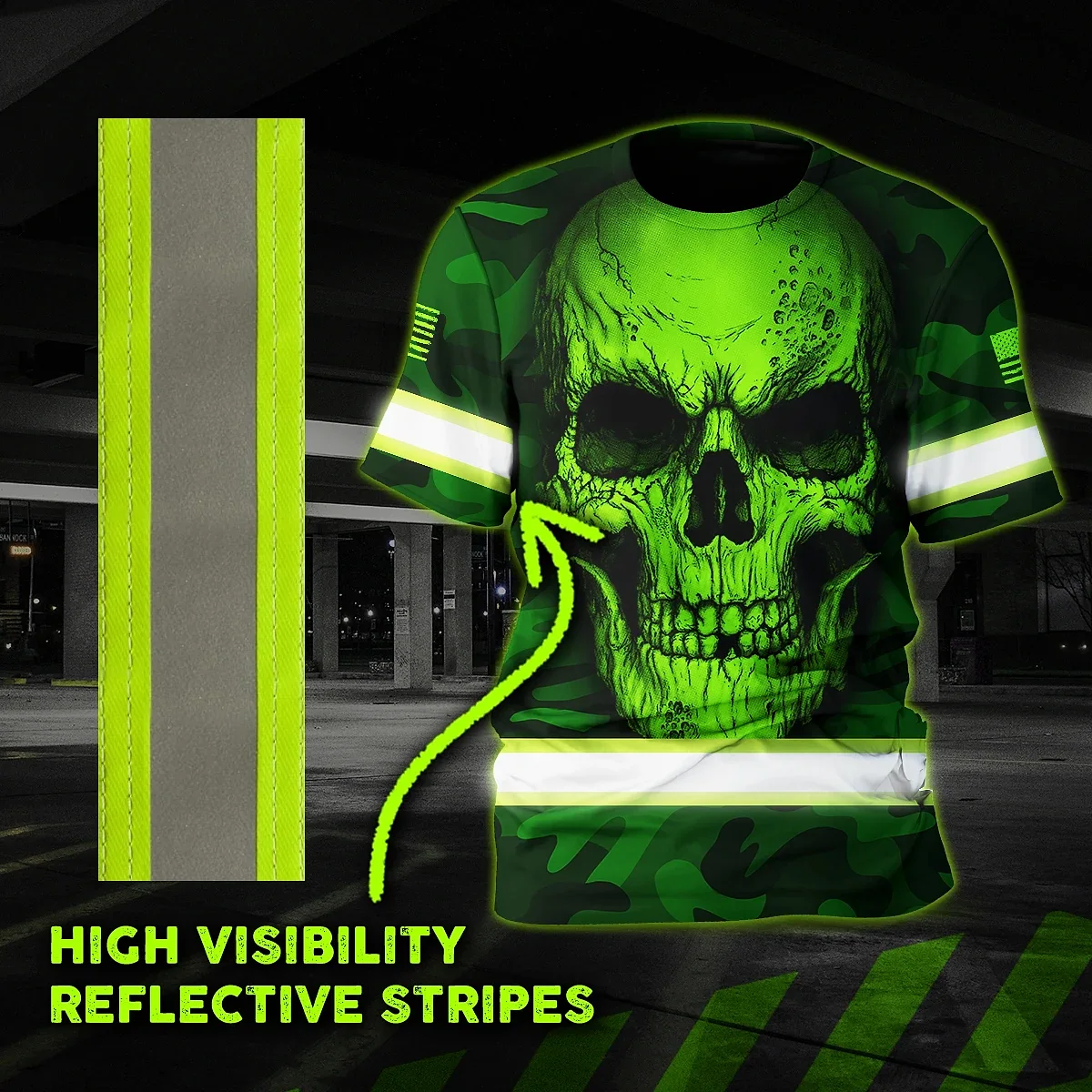 Hi Vis Shirt Reflective Skull Camo Green Neon US Flag Custom Name Safety Workwear For Workers, Truckers, Operators