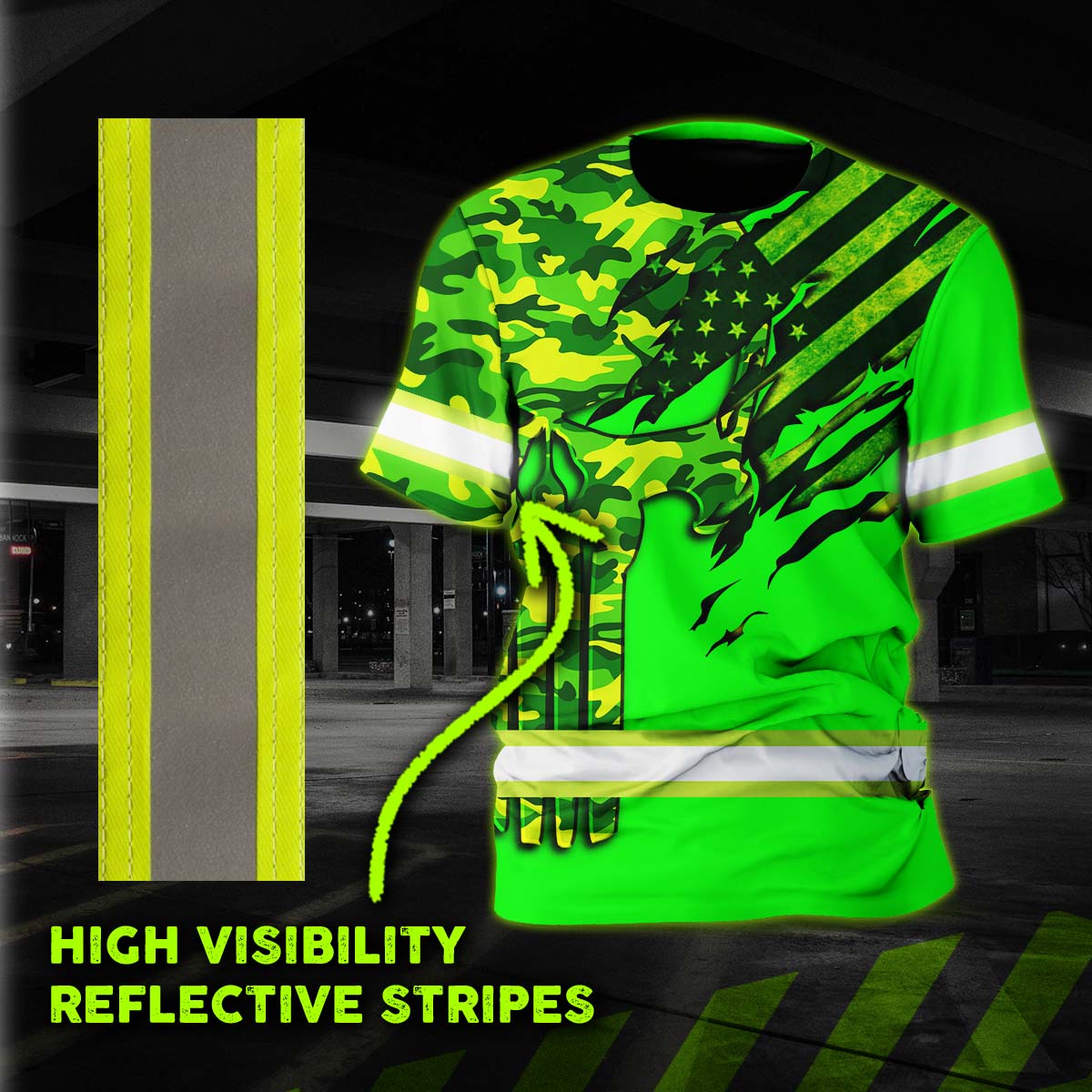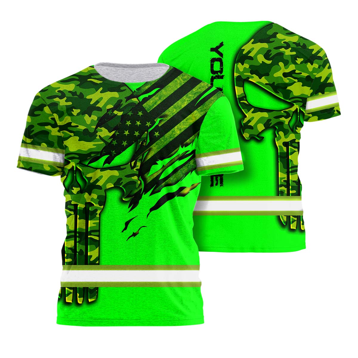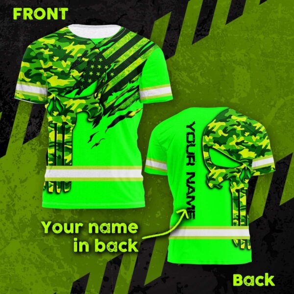 Hi Vis Shirt Reflective Skull Camo Green Neon US Flag Scratch Custom Name Safety Workwear For Workers, Operator, Cyclists, Patriotic