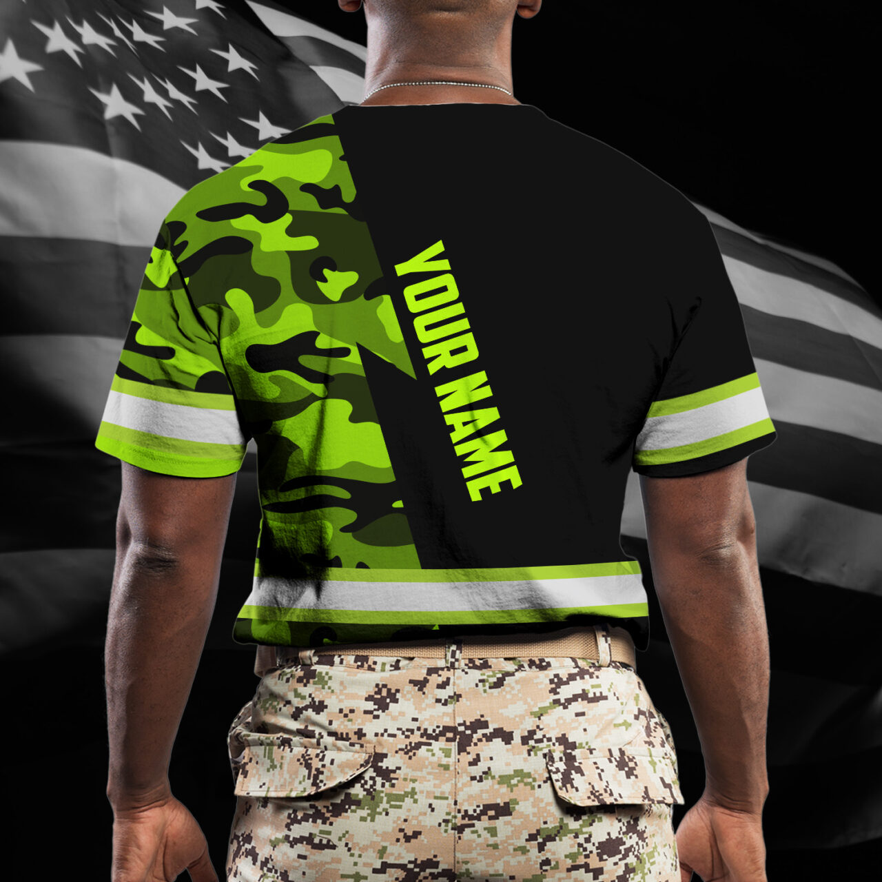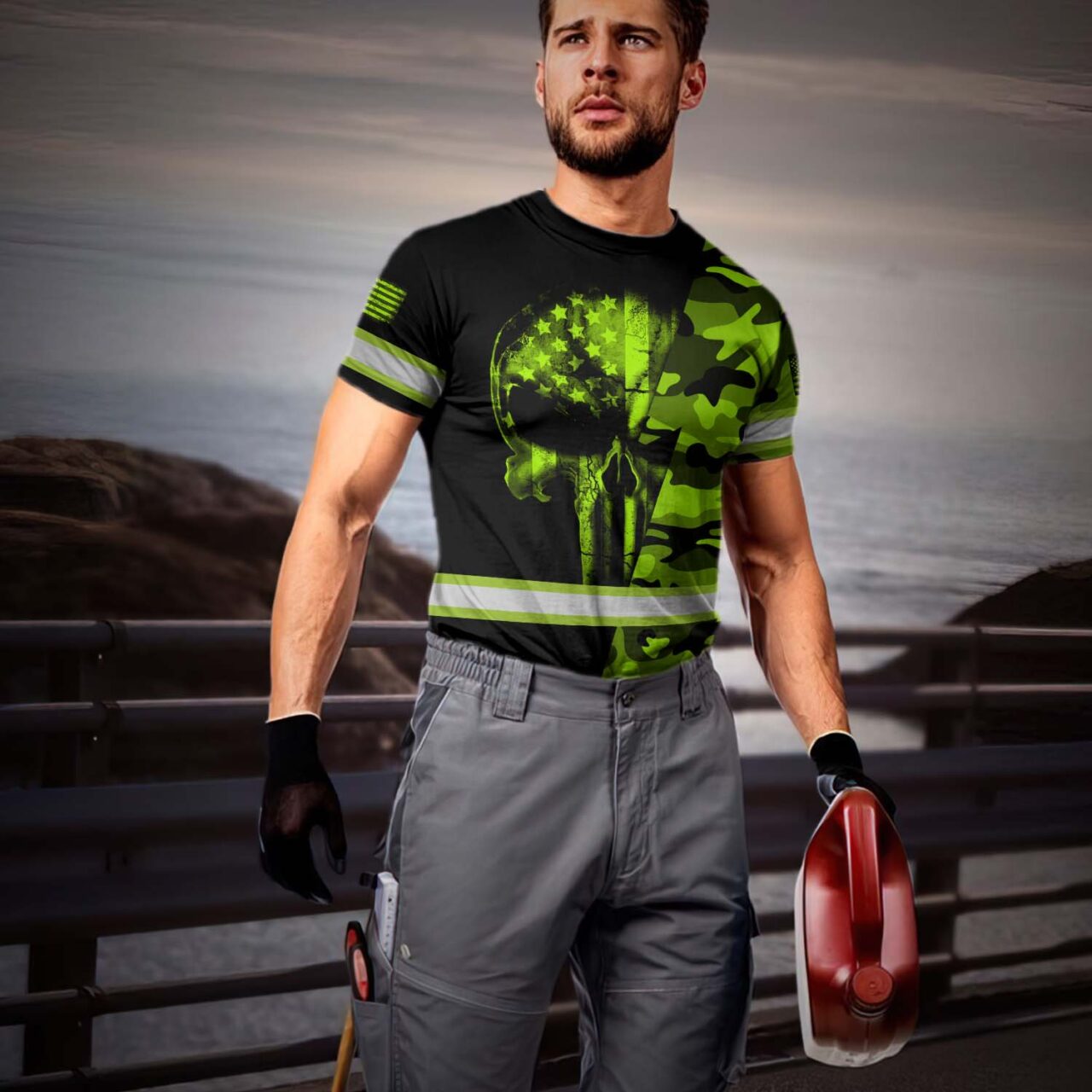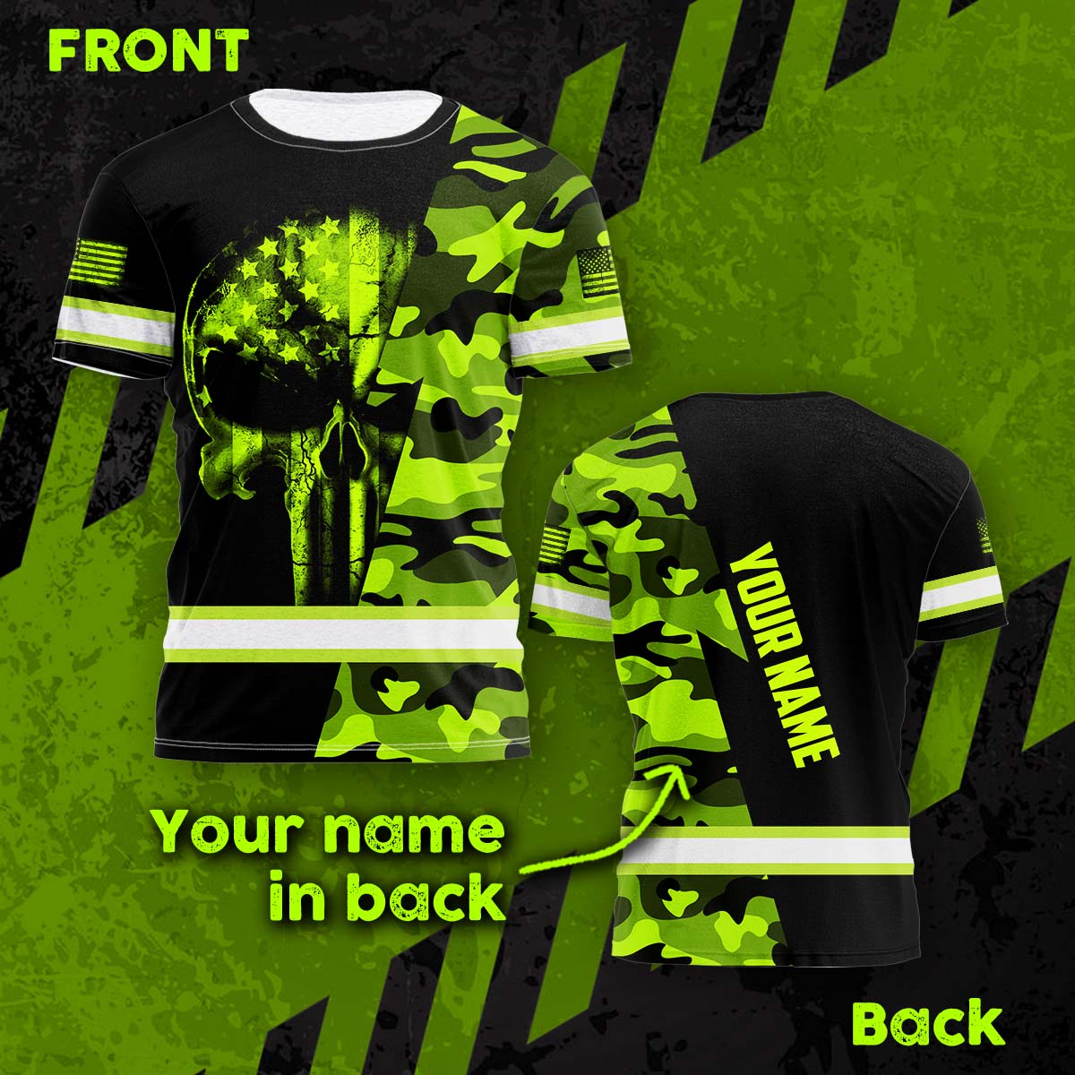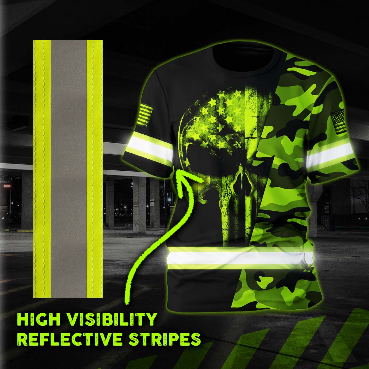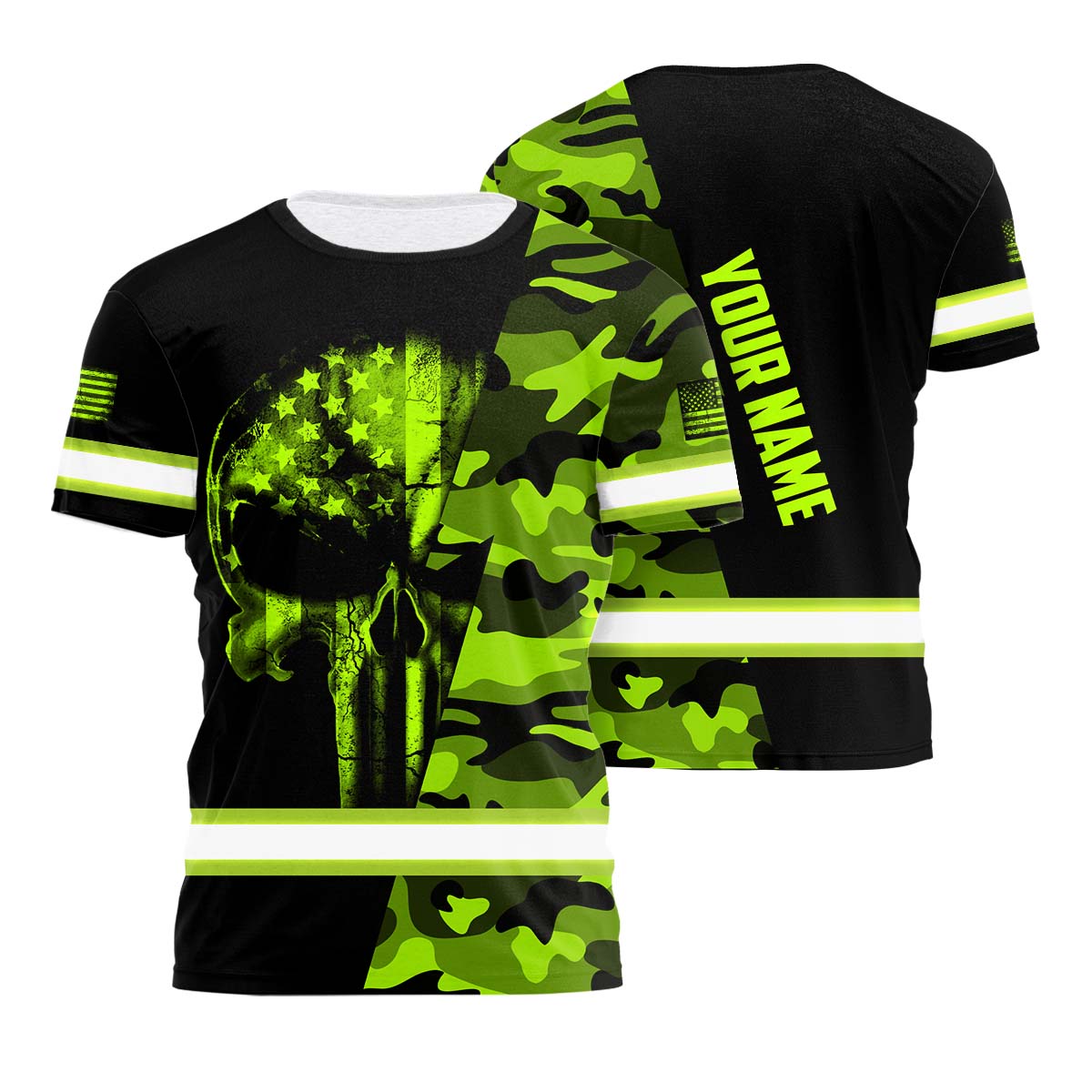 Hi Vis Shirt Reflective Skull US Flag Custom Name Safety Workwear For Workers, Runners, Cyclists, Trucker, Operator, Patriotic