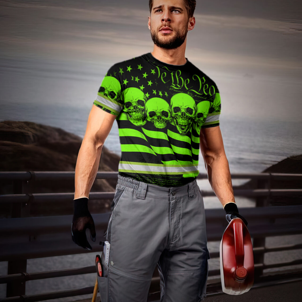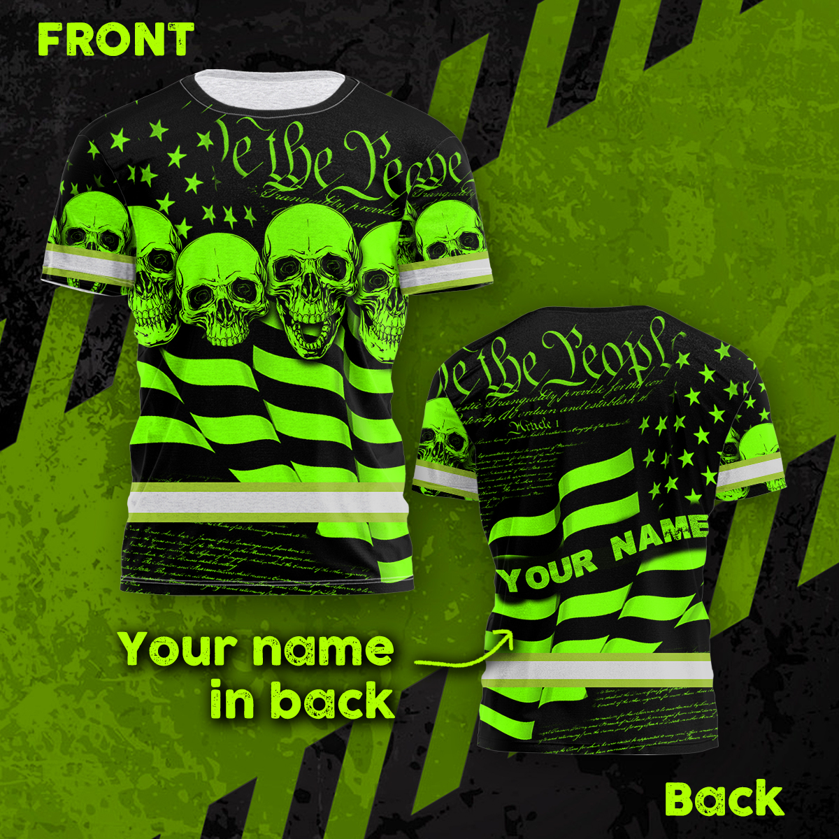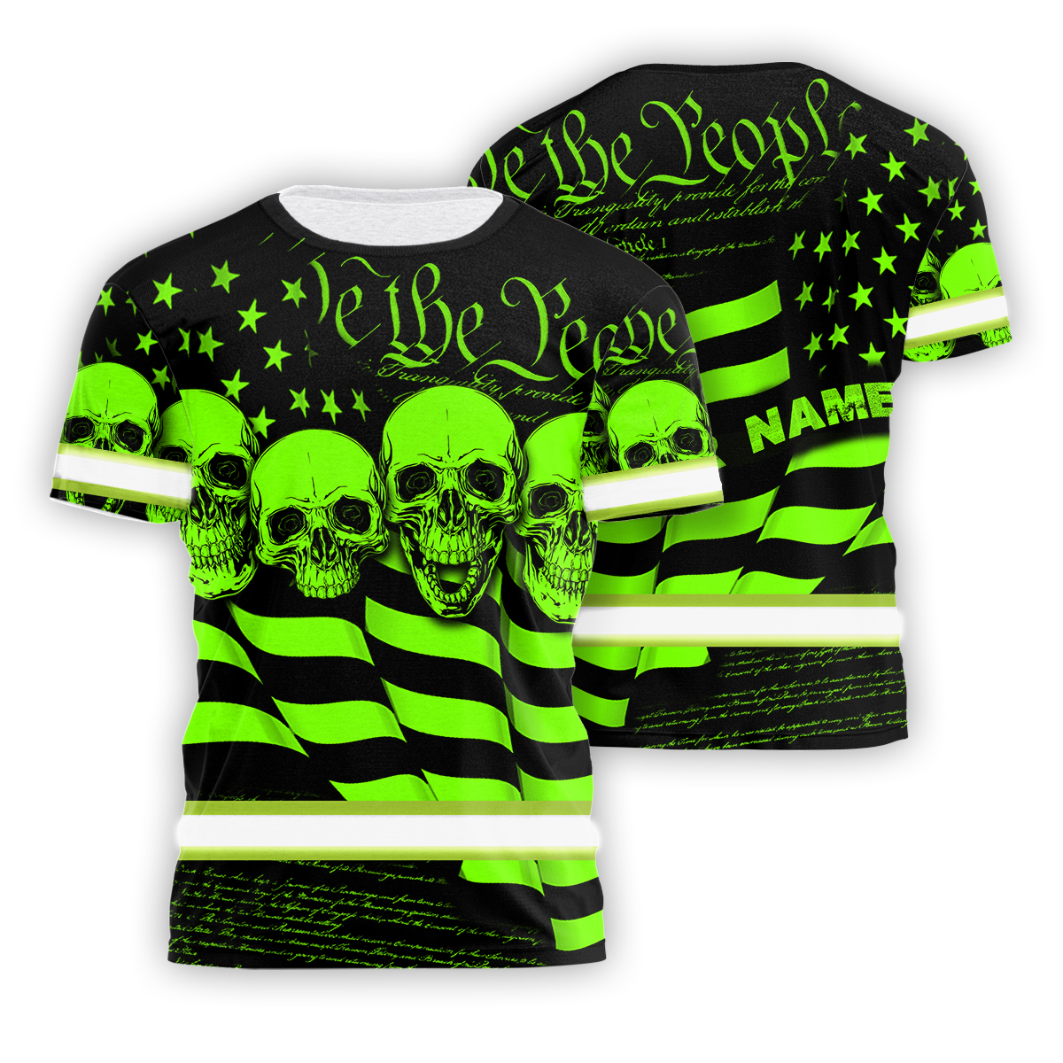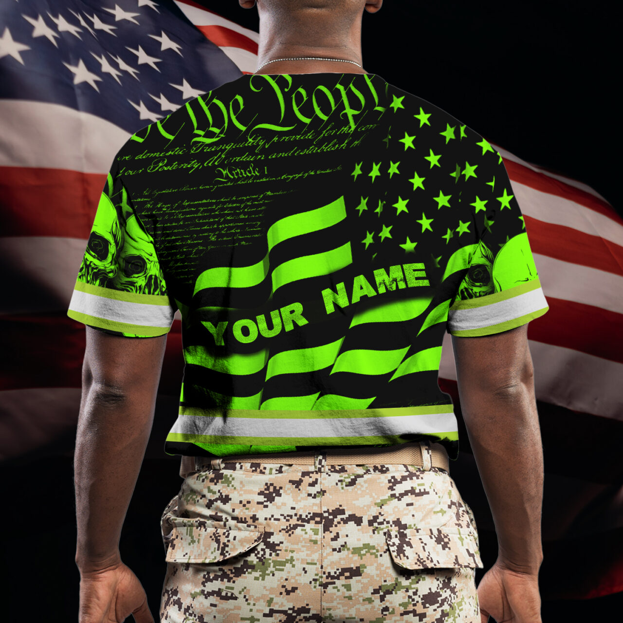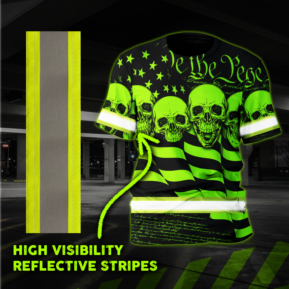 Hi Vis Shirt Reflective Skull US Flag Wave Custom Name Safety Workwear For Workers, Runners, Cyclists, Trucker, Operator, Patriotic