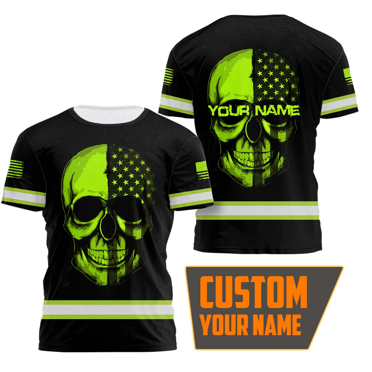 Looking for a hi-vis shirt that also looks great? Check out this reflective skull with US flag custom name safety workwear! This shirt is perfect for anyone who wants to be safe and look good at the same time. It’s made from durable, high-quality materials and features a vibrant design that will get you noticed. Order yours today!