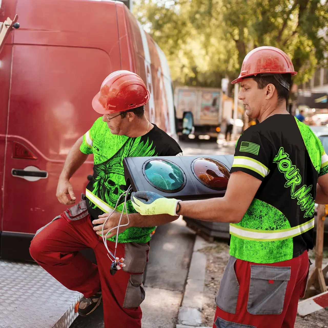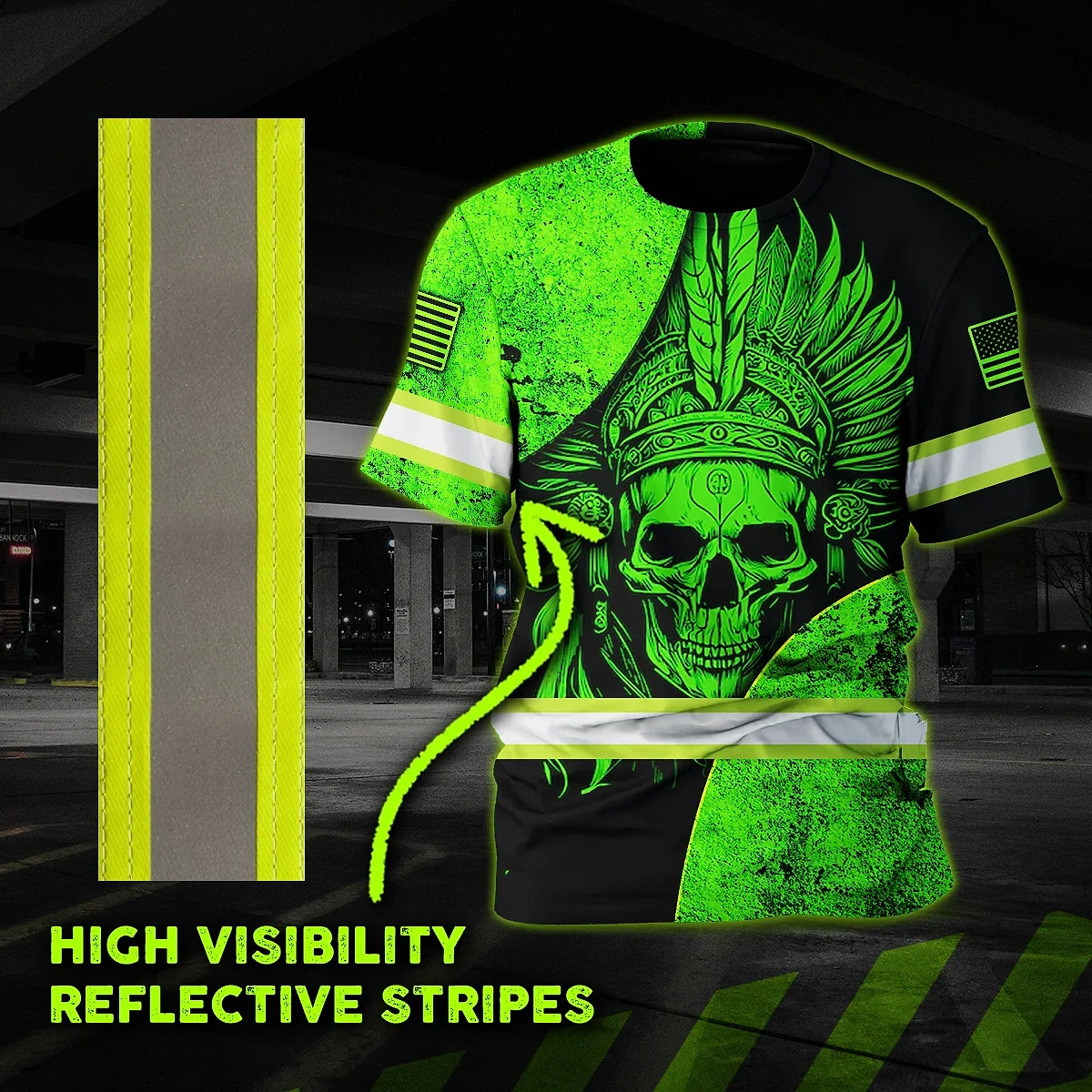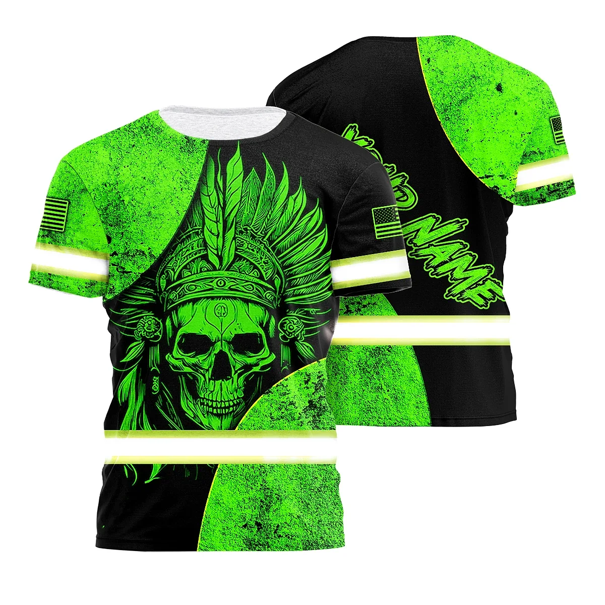 Hi Vis Shirt Reflective Tapes American Skull US Flag Custom Name Safety Workwear For Workers, Truckers, Operators
