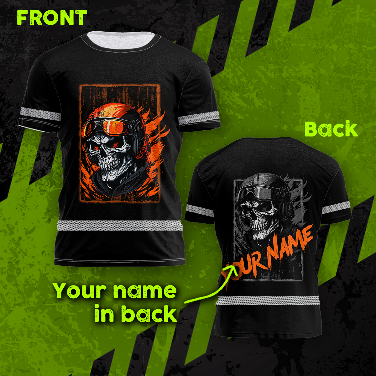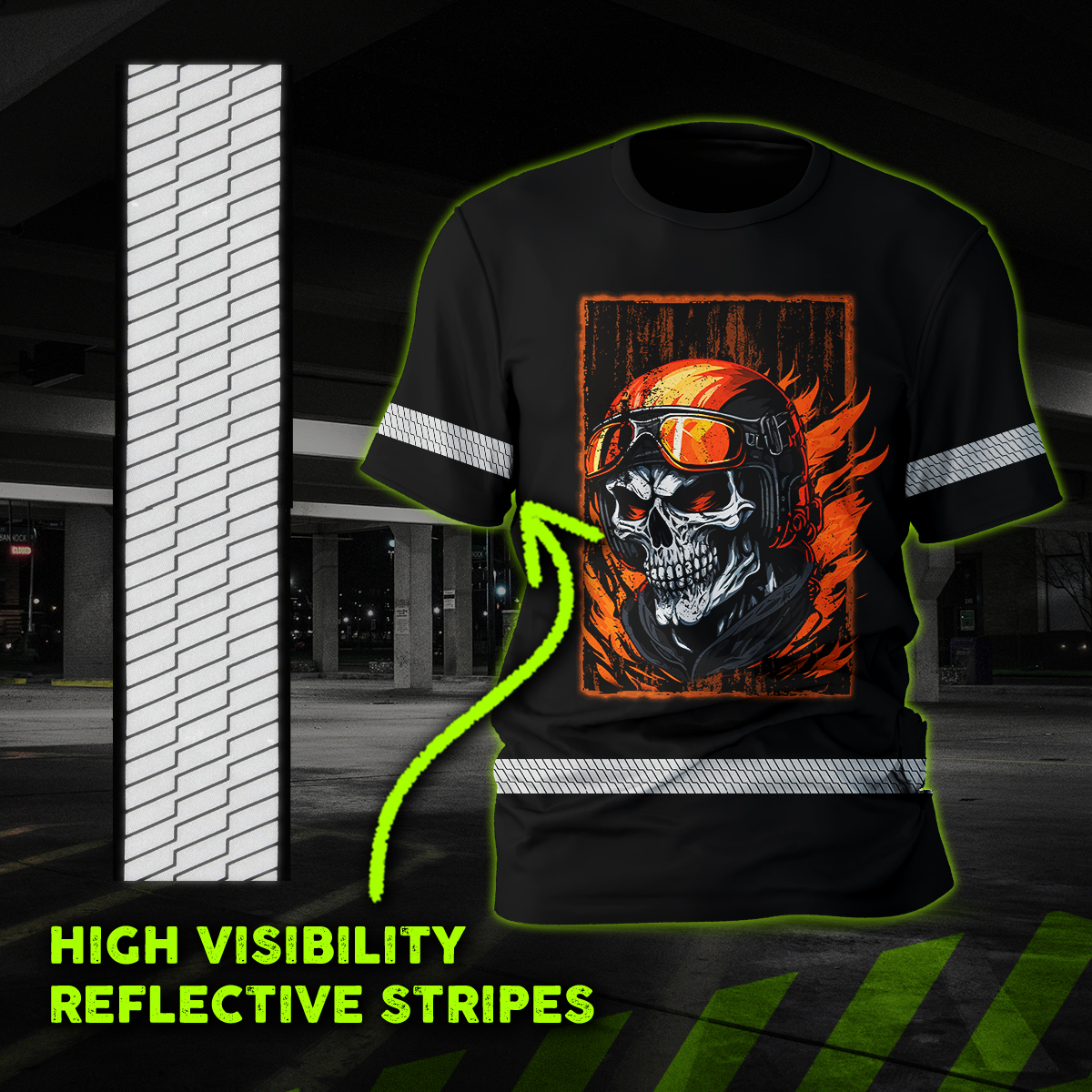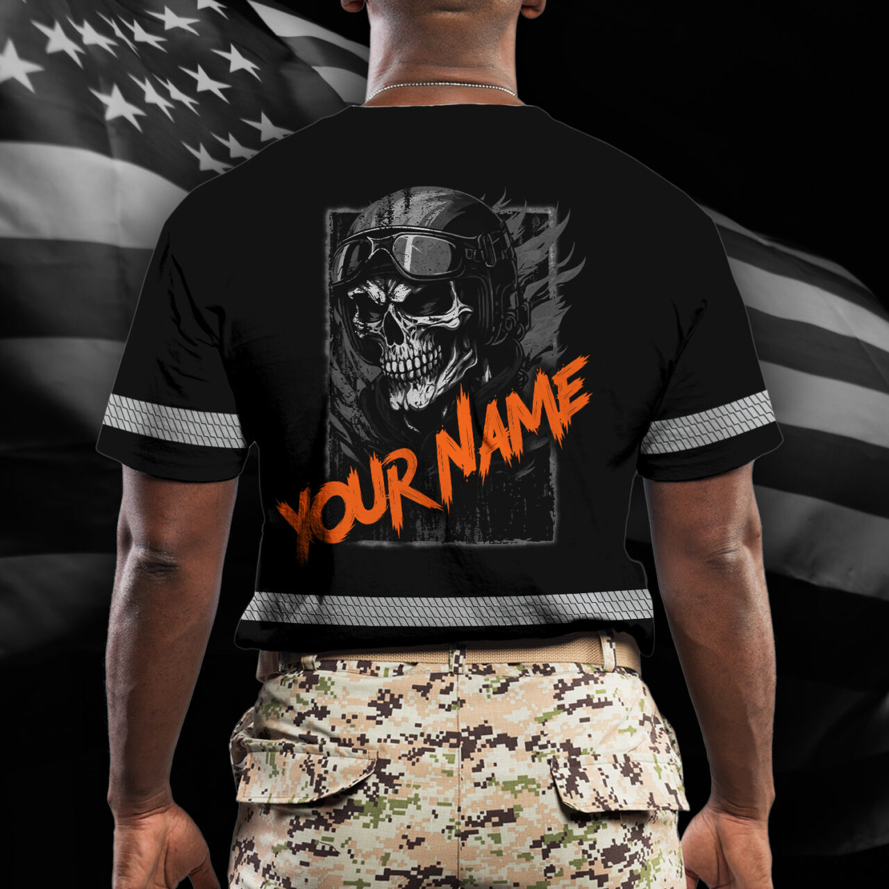 Hi Vis Shirt Reflective Tapes Black Orange Skull Biker Shirt Custom Name Safety Workwear For Biker, Worker, Operator, Patriotic