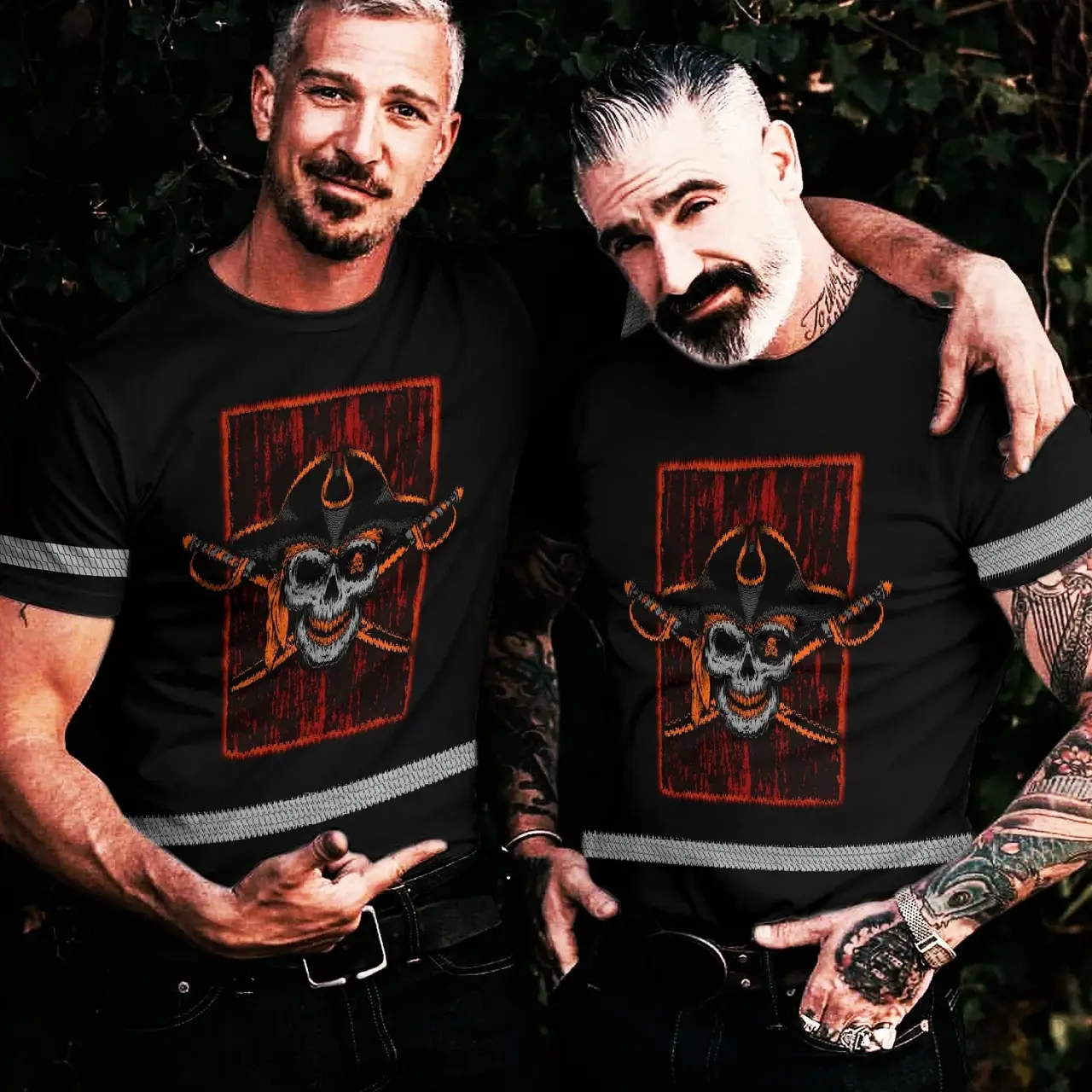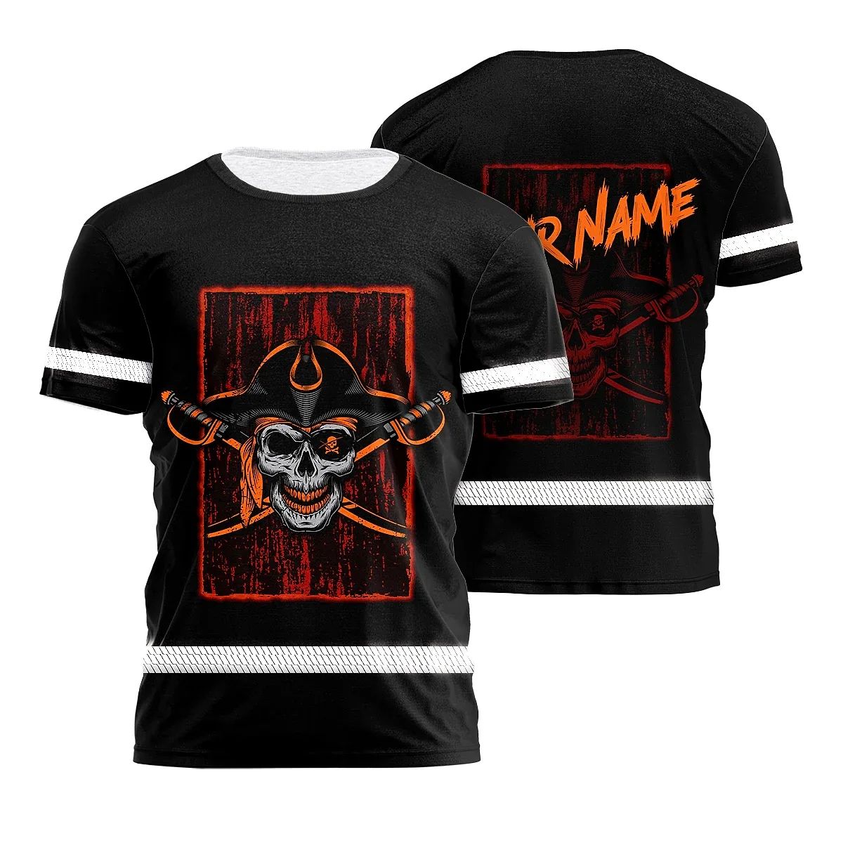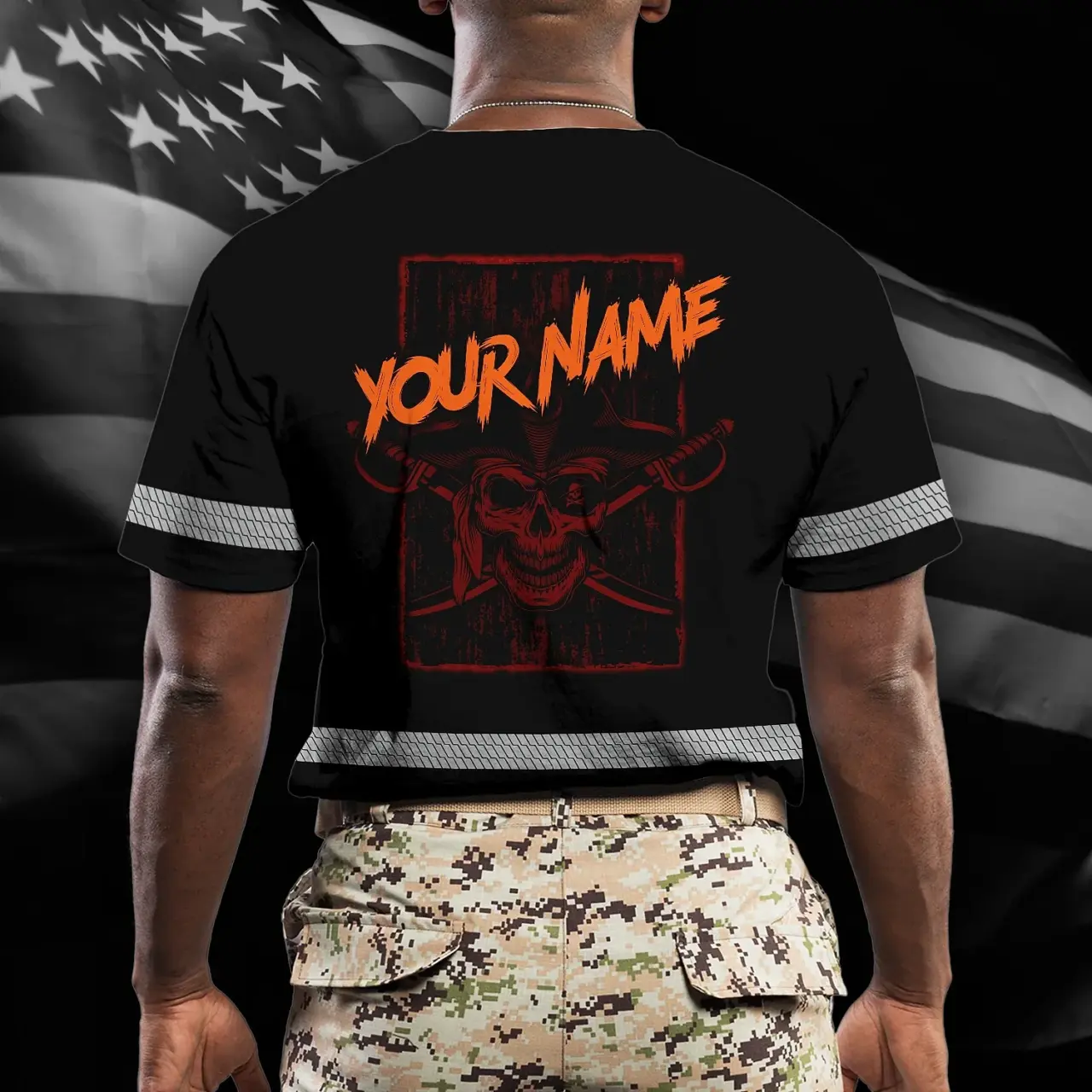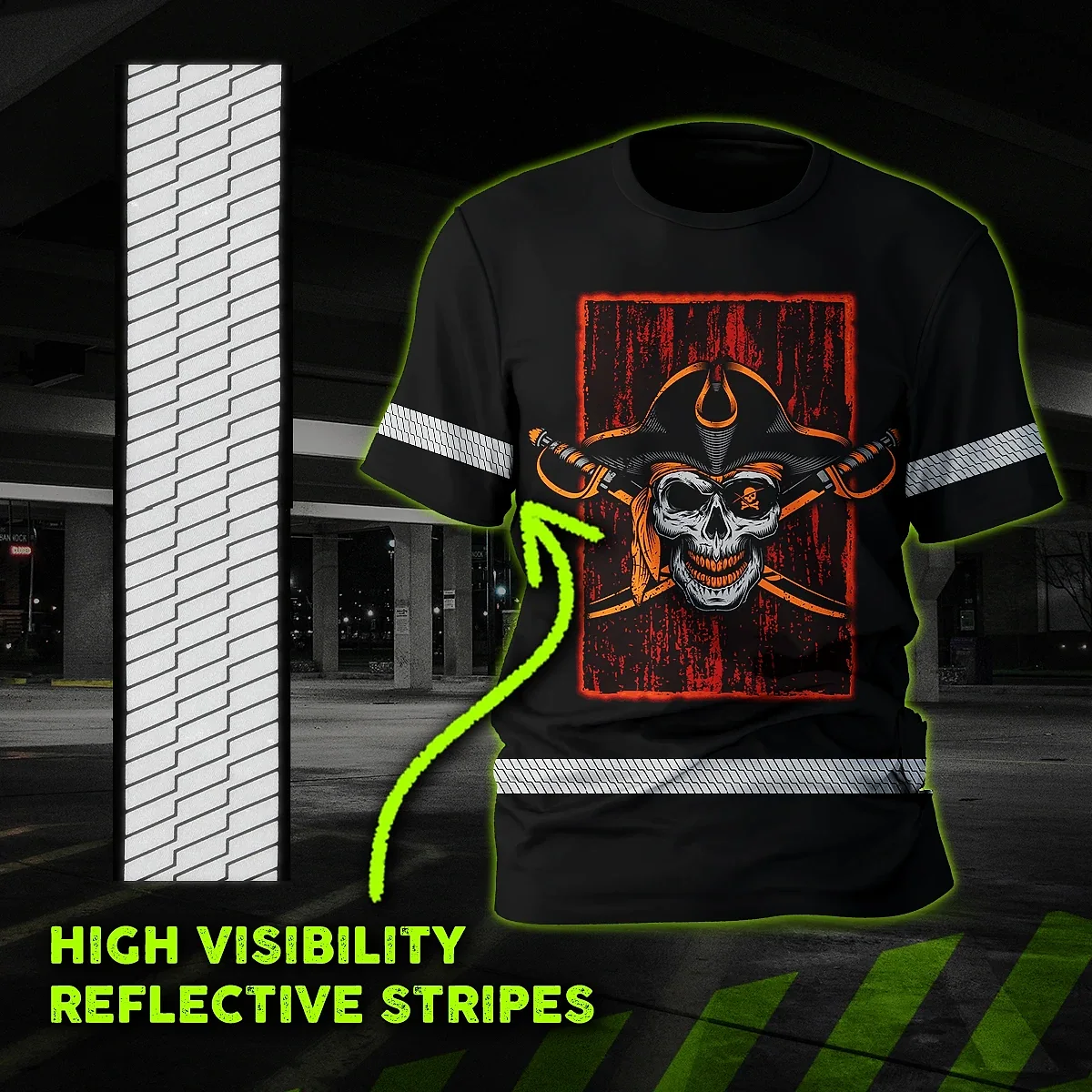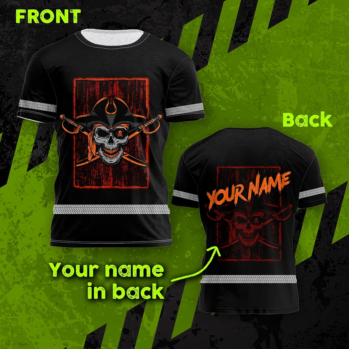 Hi Vis Shirt Reflective Tapes Black Orange Skull Sword Shirt Custom Name Safety Workwear For Workers, Truckers, Operators