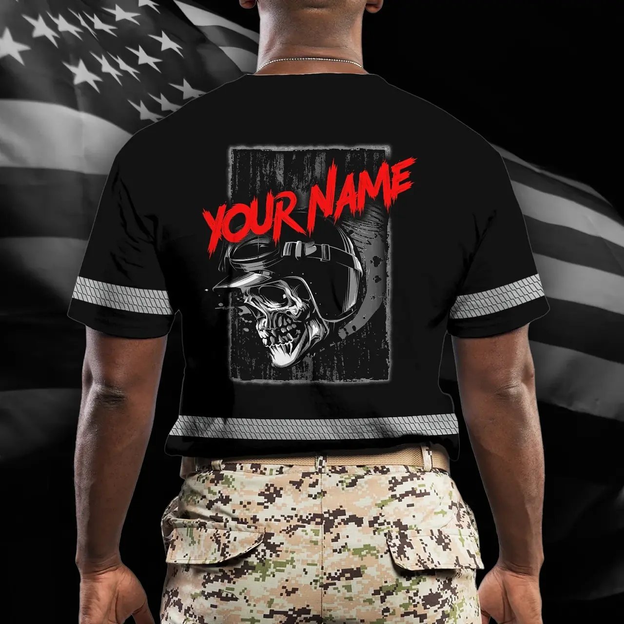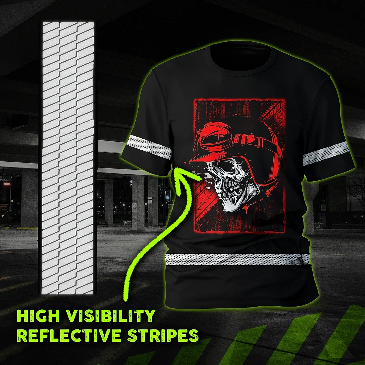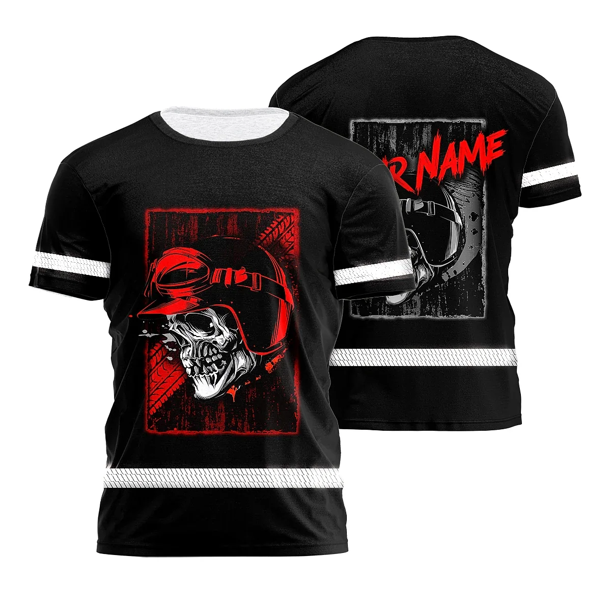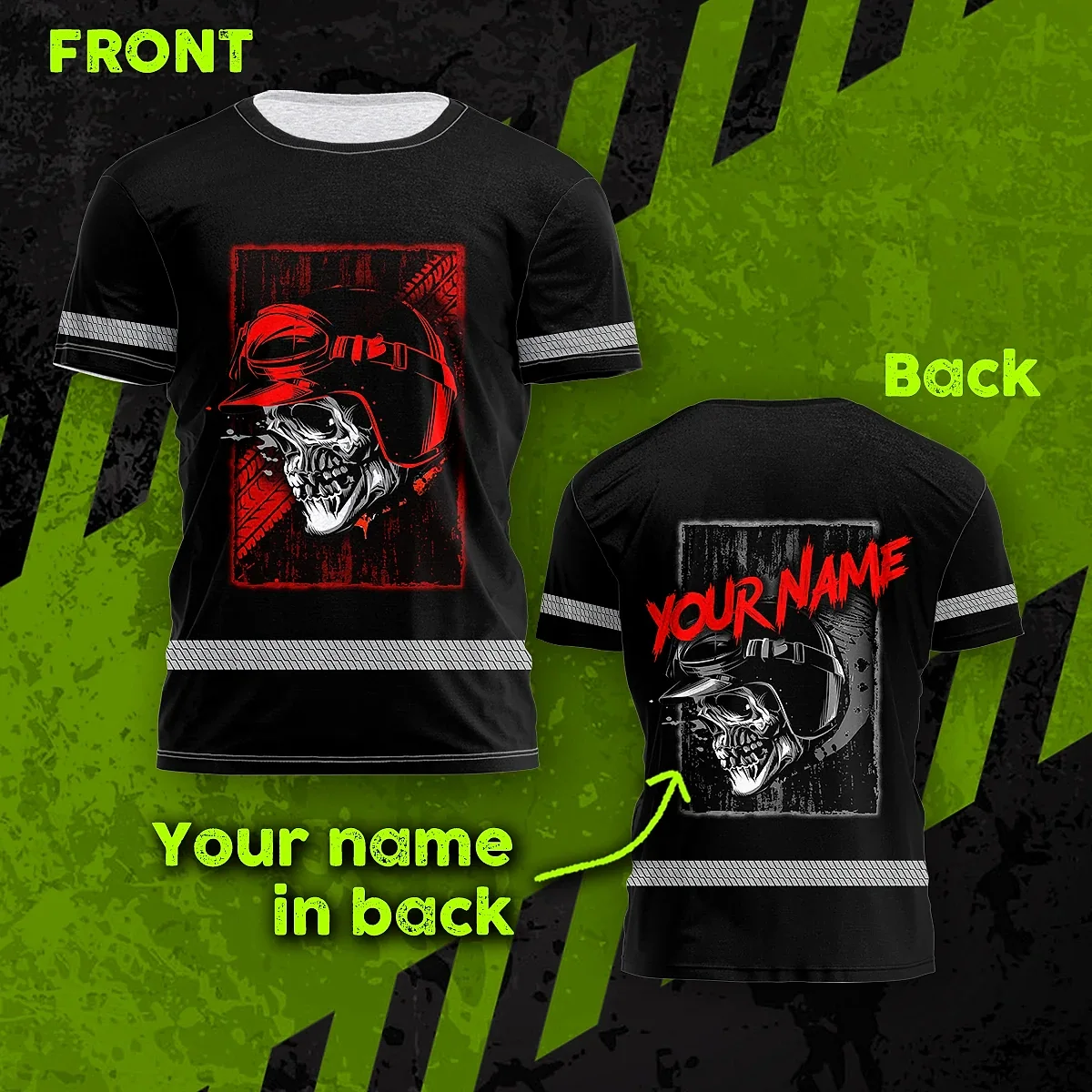 Hi Vis Shirt Reflective Tapes Black Red Skull Biker Shirt Custom Name Safety Workwear For Workers, Truckers, Operators