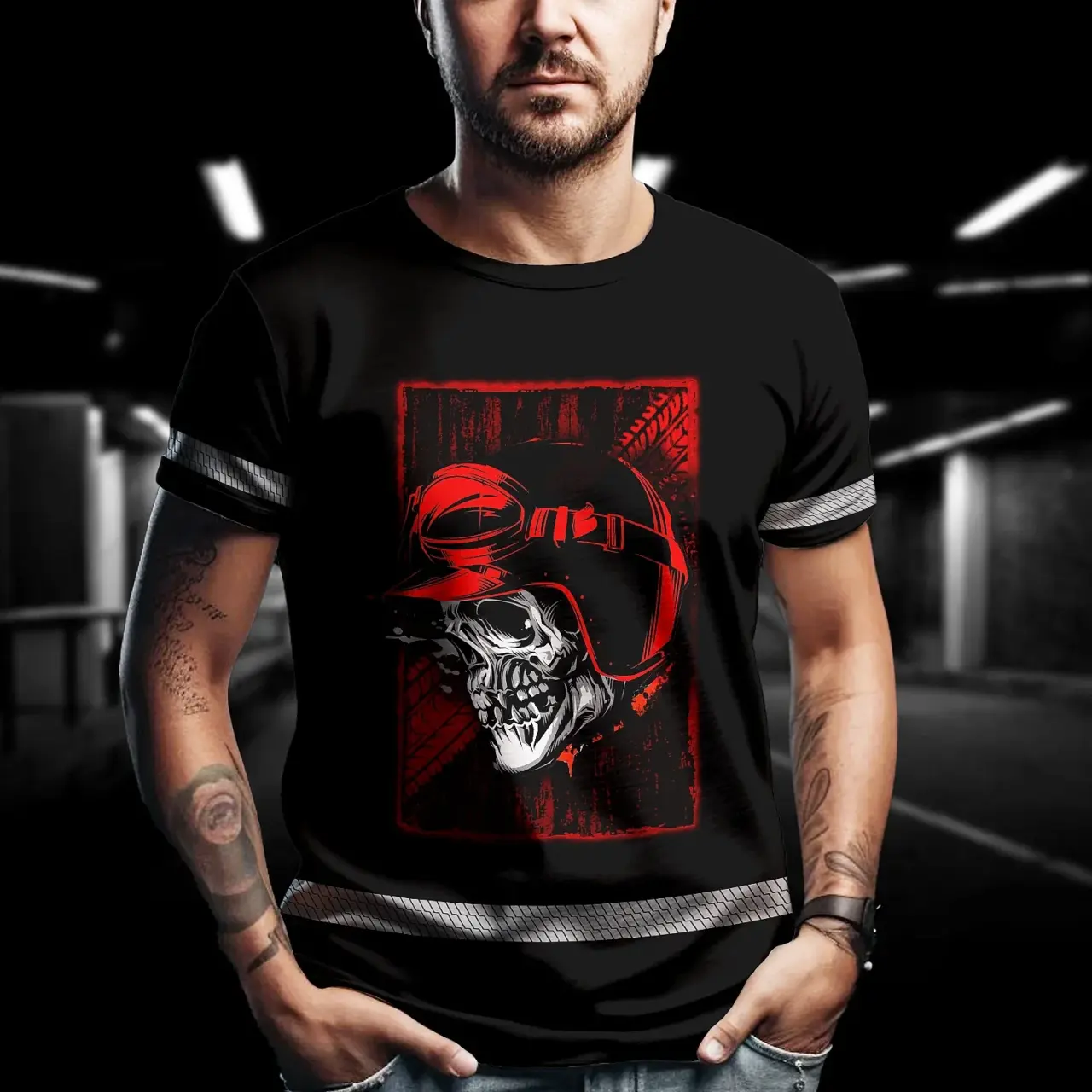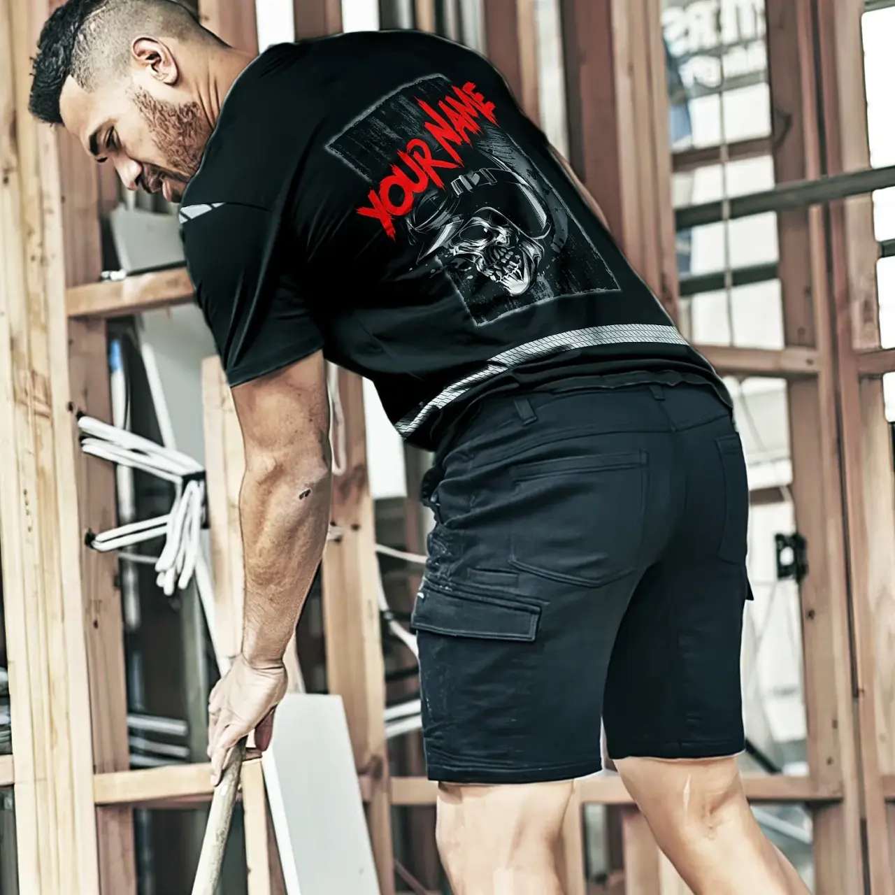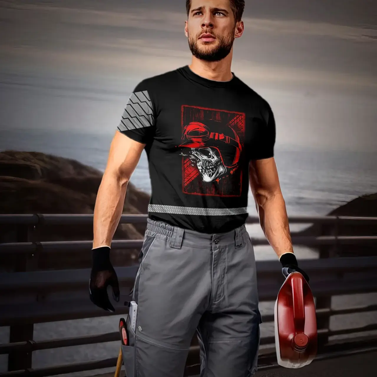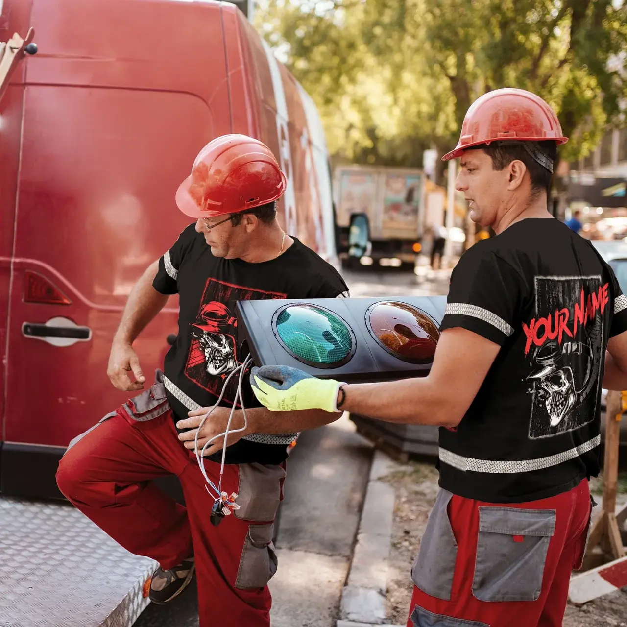 Hi Vis Shirt Reflective Tapes Black Red Skull Biker Shirt Custom Name Safety Workwear For Workers, Truckers, Operators