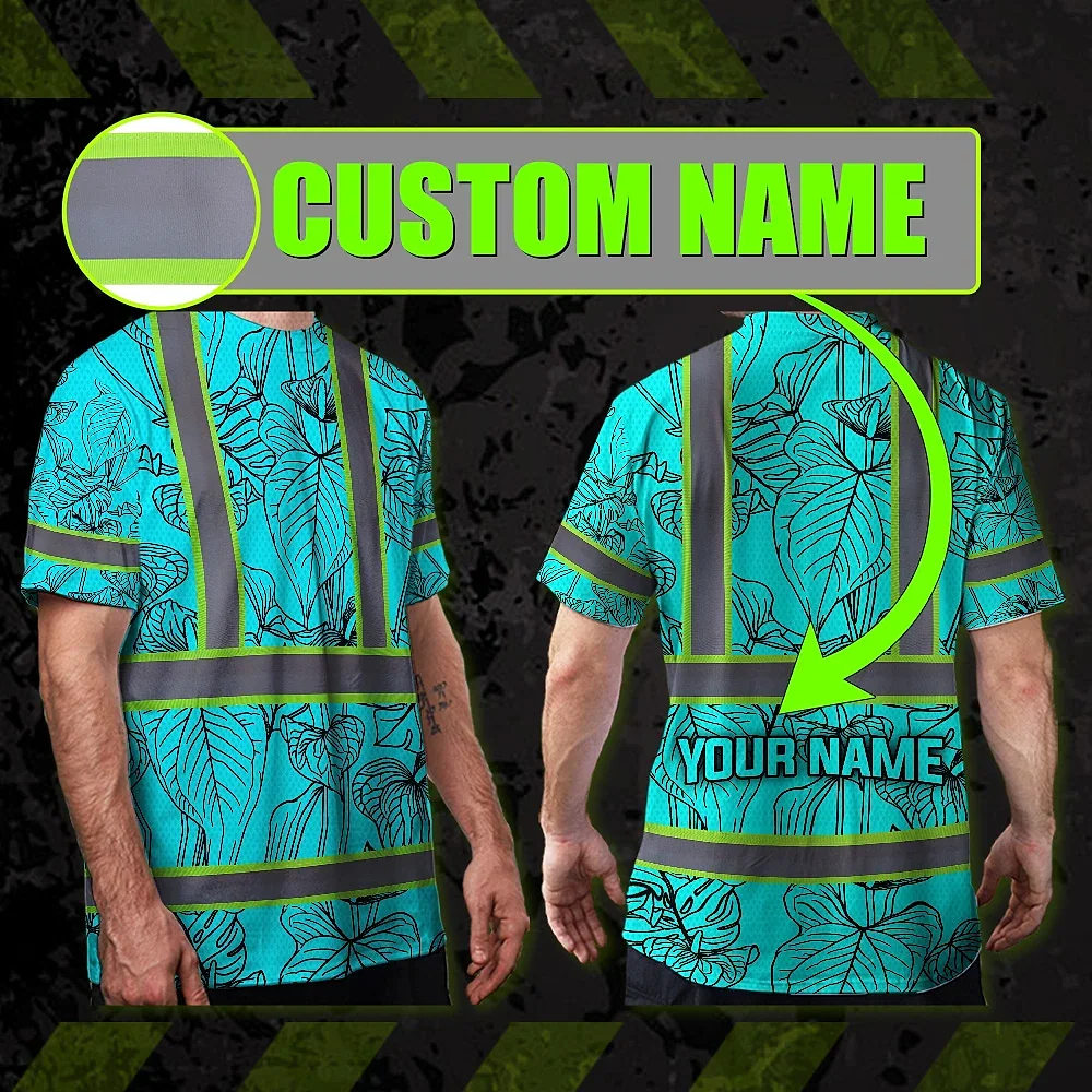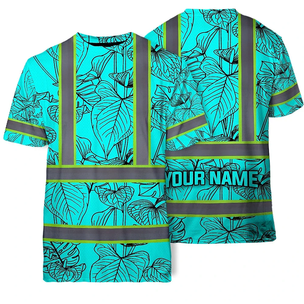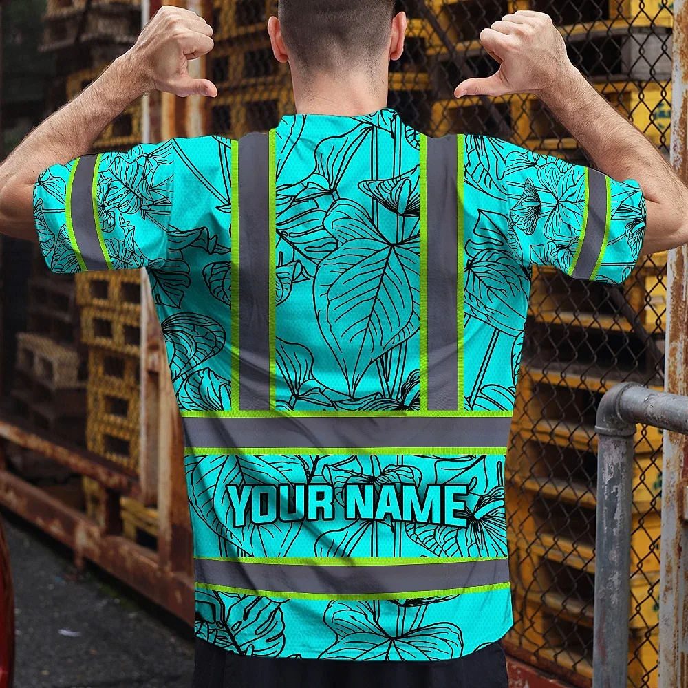 Hi Vis Shirt Reflective Tapes Blue Neon Flowers Custom Name Safety Workwear For Workers, Truckers, Operators