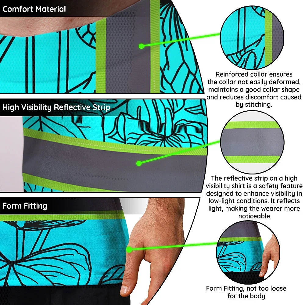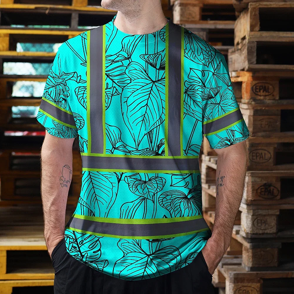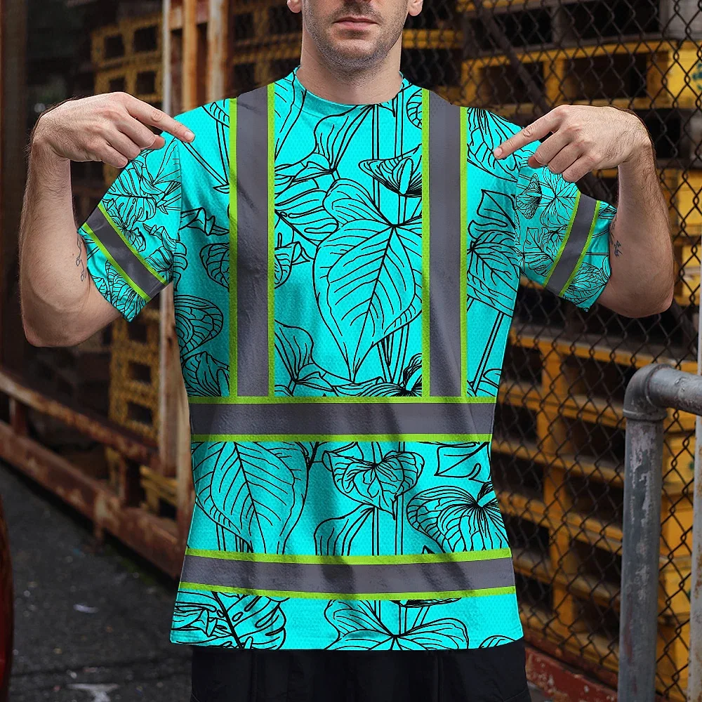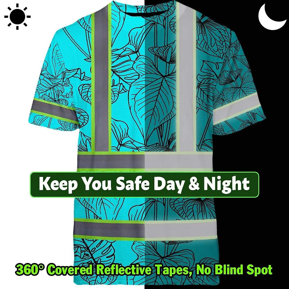Hi Vis Shirt Reflective Tapes Blue Neon Flowers Custom Name Safety Workwear For Workers, Truckers, Operators