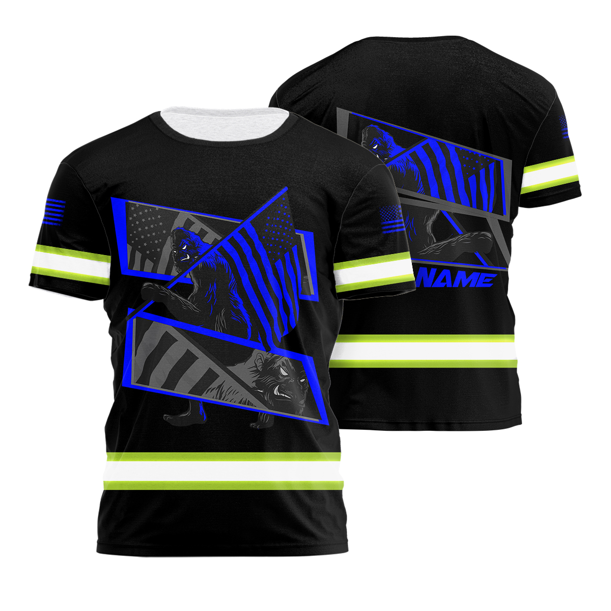 Hi Vis Shirt Reflective Tapes Blue Neon Outdoor Gorillas US Flag Custom Name Safety Workwear For Workers, Operator, Cyclists, Patriotic