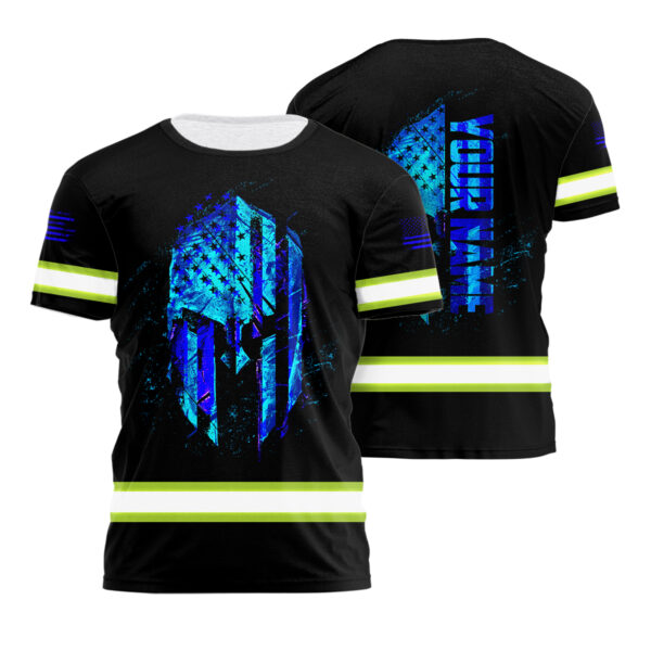 Hi Vis Shirt Reflective Tapes Blue Neon Strong Mask US Flag Custom Name Safety Workwear For Workers, Operator, Cyclists, Patriotic