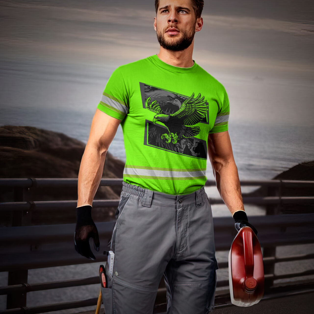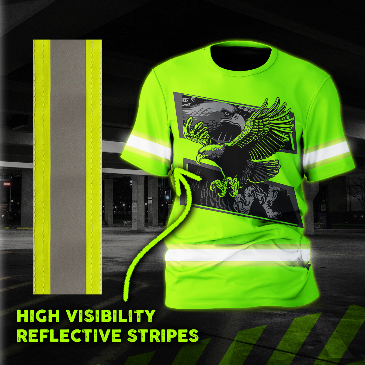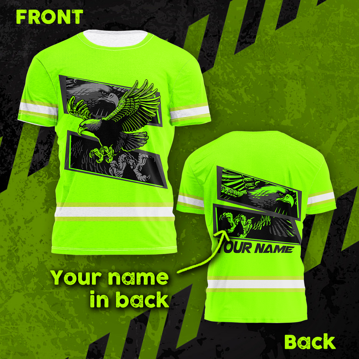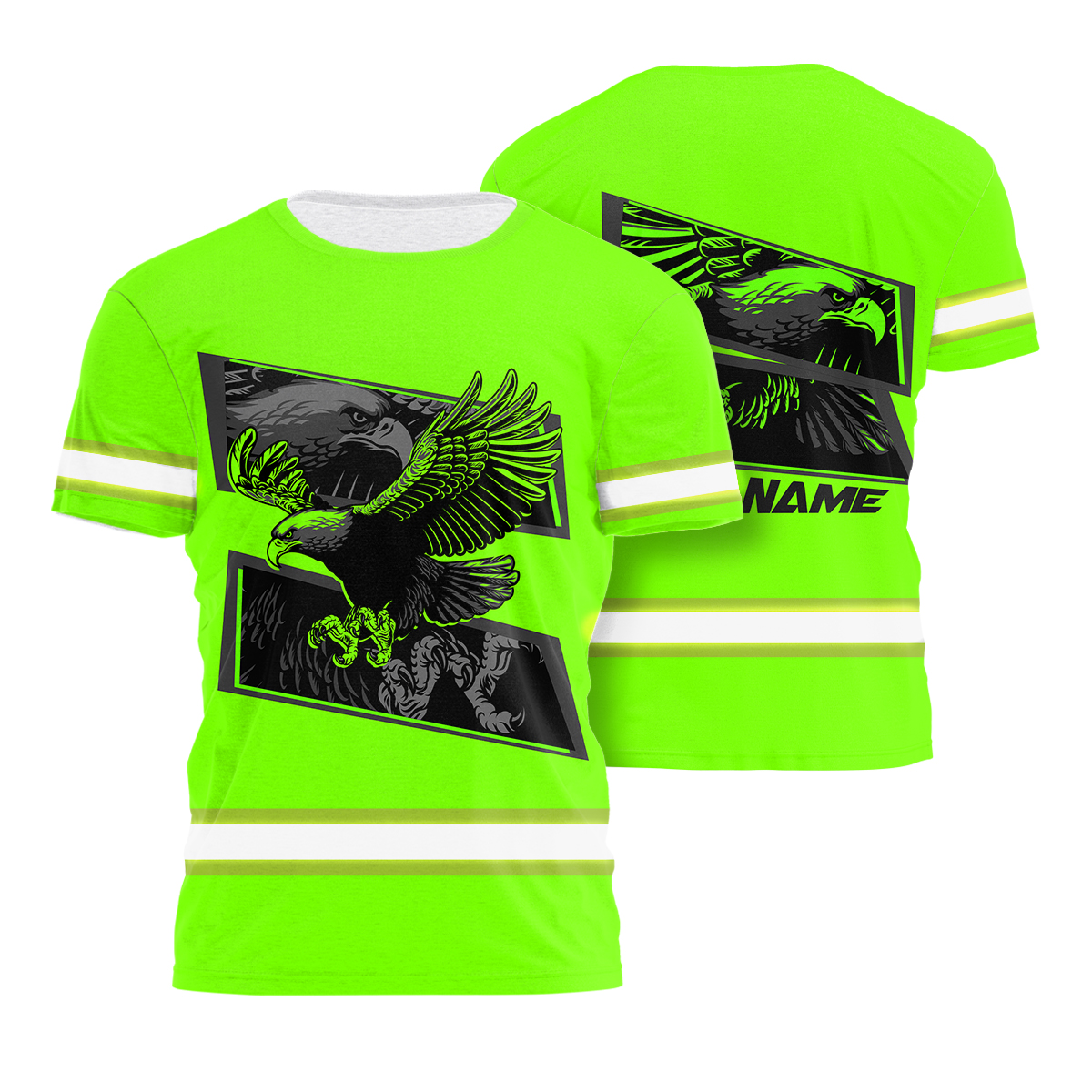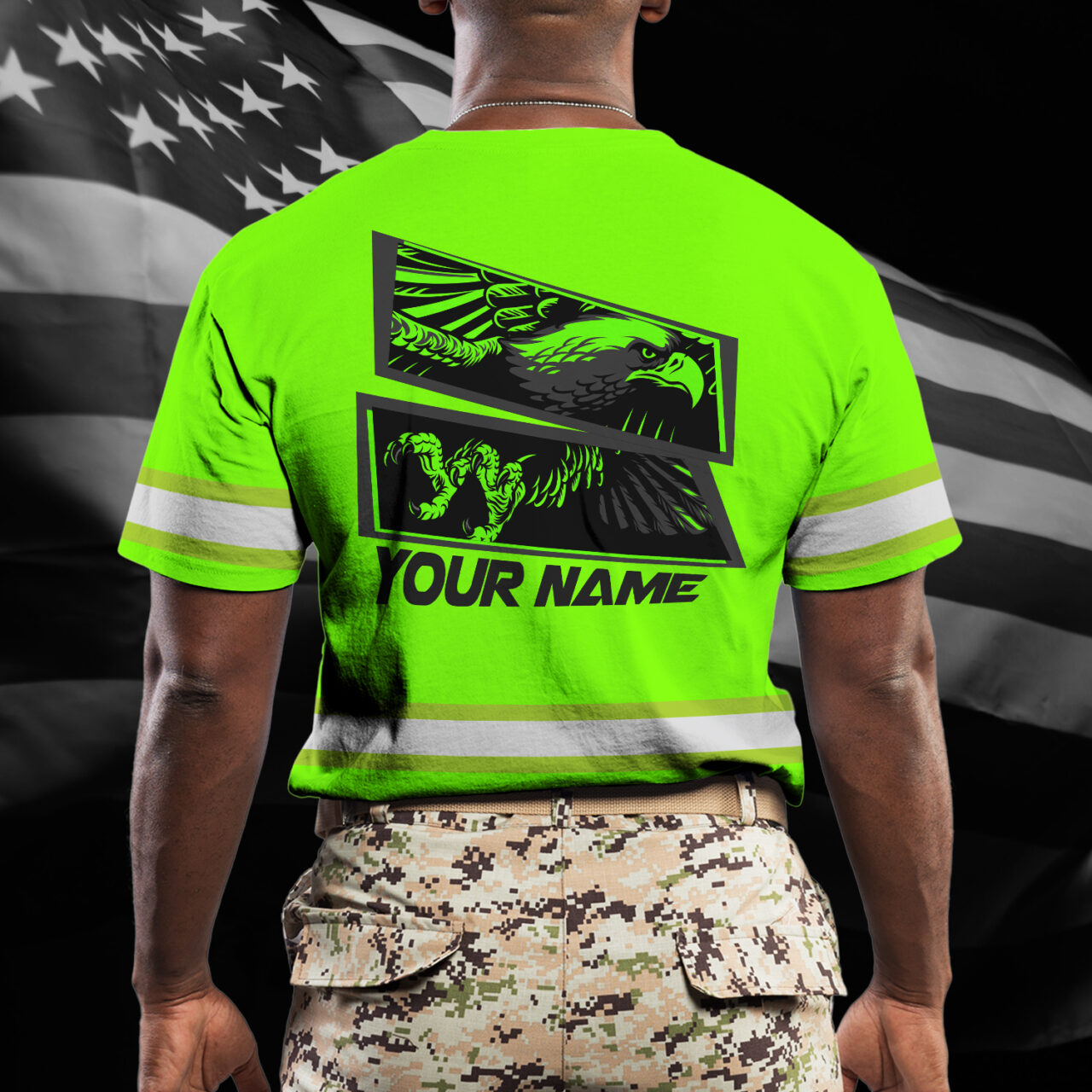 Hi Vis Shirt Reflective Tapes Green Eagle Fly Custom Name Safety Workwear For Workers, Runners, Cyclists, Patriotic