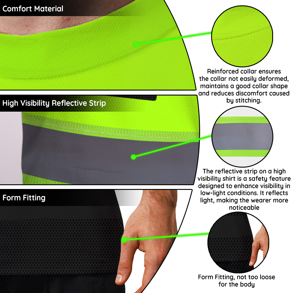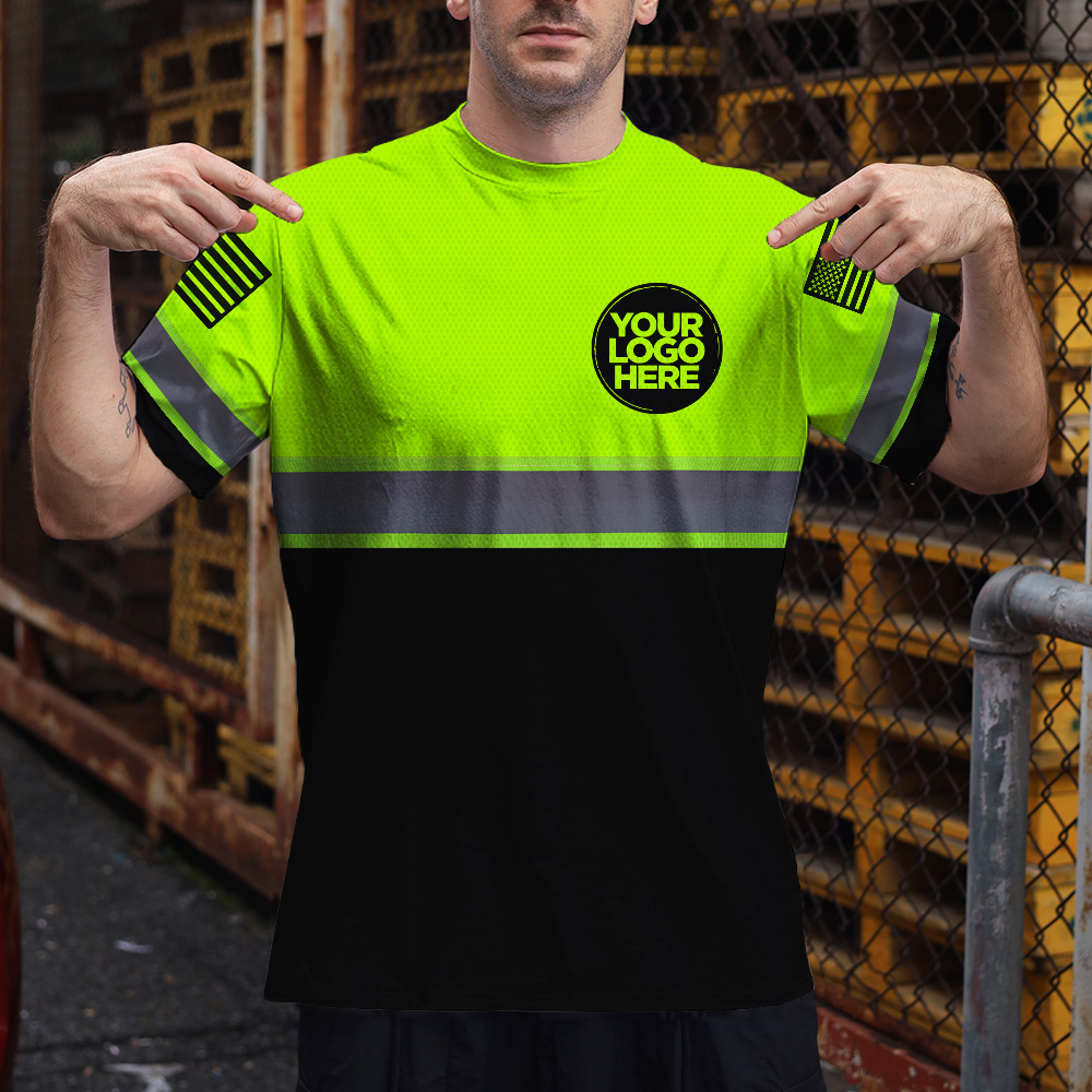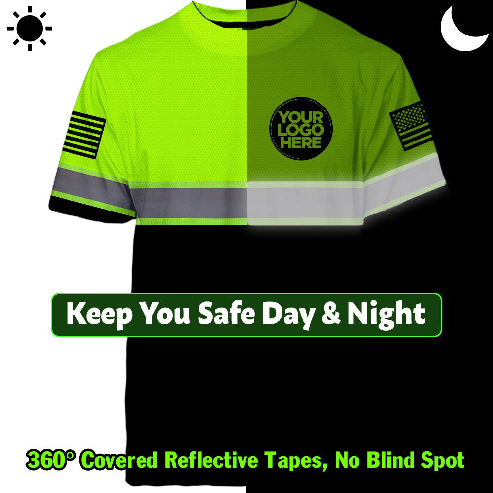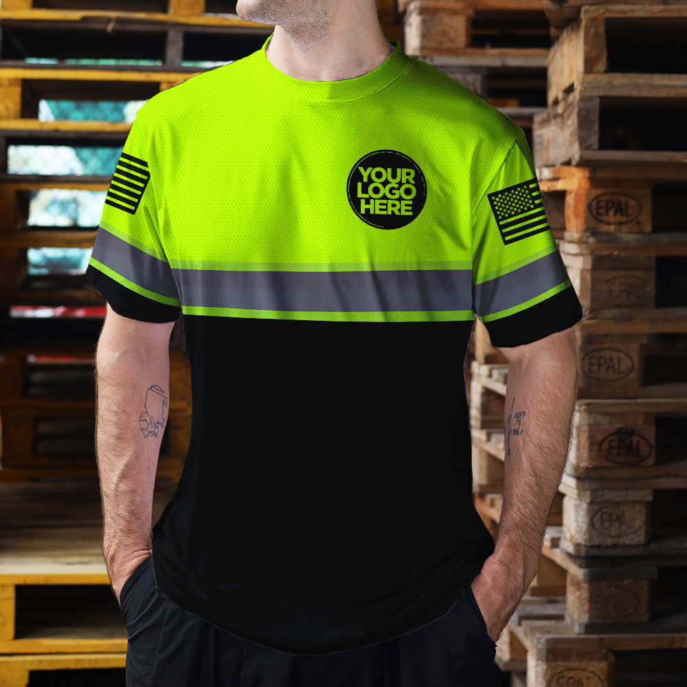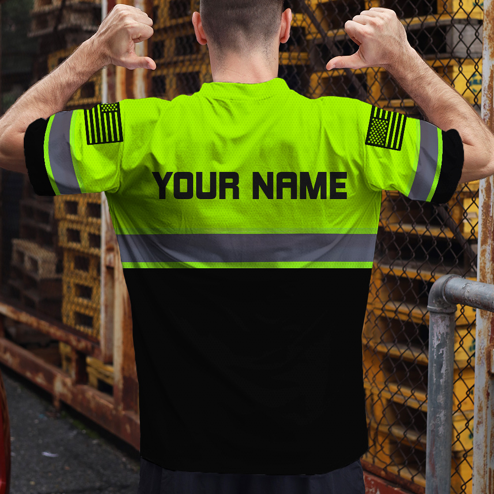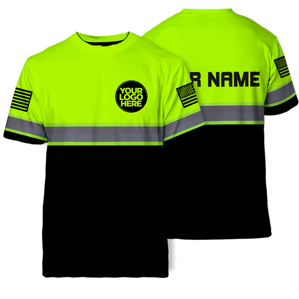 Hi Vis Shirt Reflective Tapes Green Neon And Black Uniform US Flag Custom Name And Logo Safety Workwear For Team, Group, Company