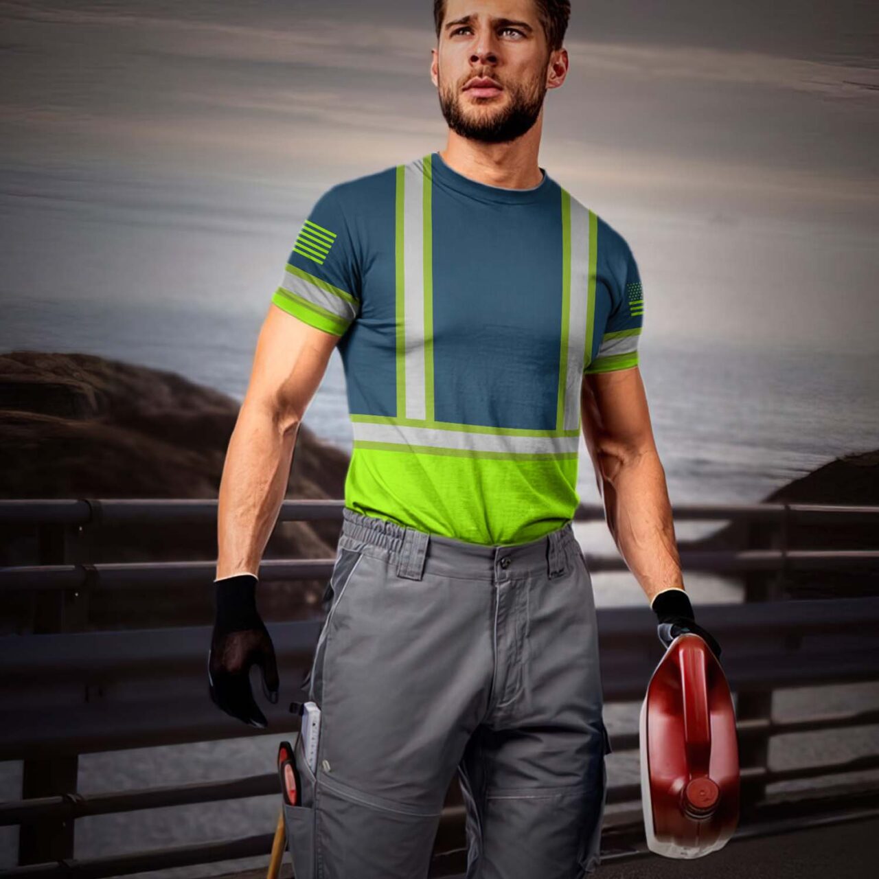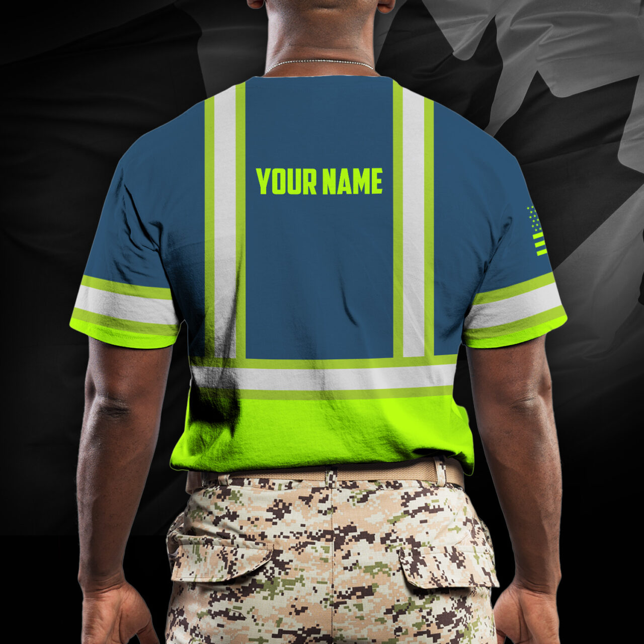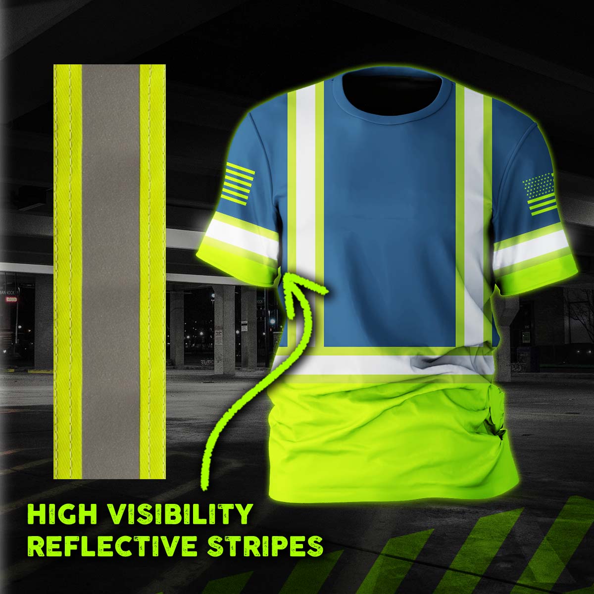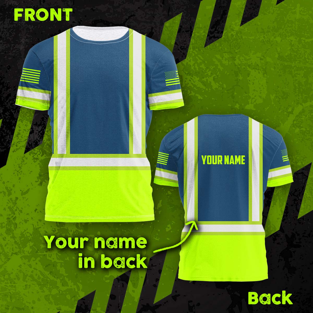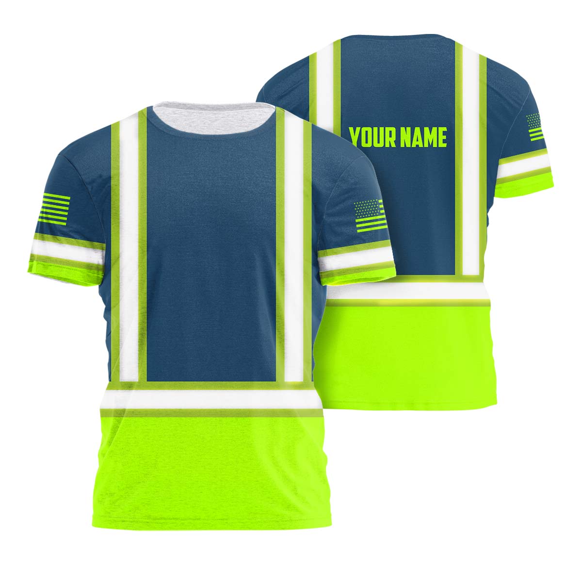 Hi Vis Shirt Reflective Tapes Green Neon And Blue Us Flag Custom Name Safety Workwear For Workers, Operator, Cyclists, Patriotic